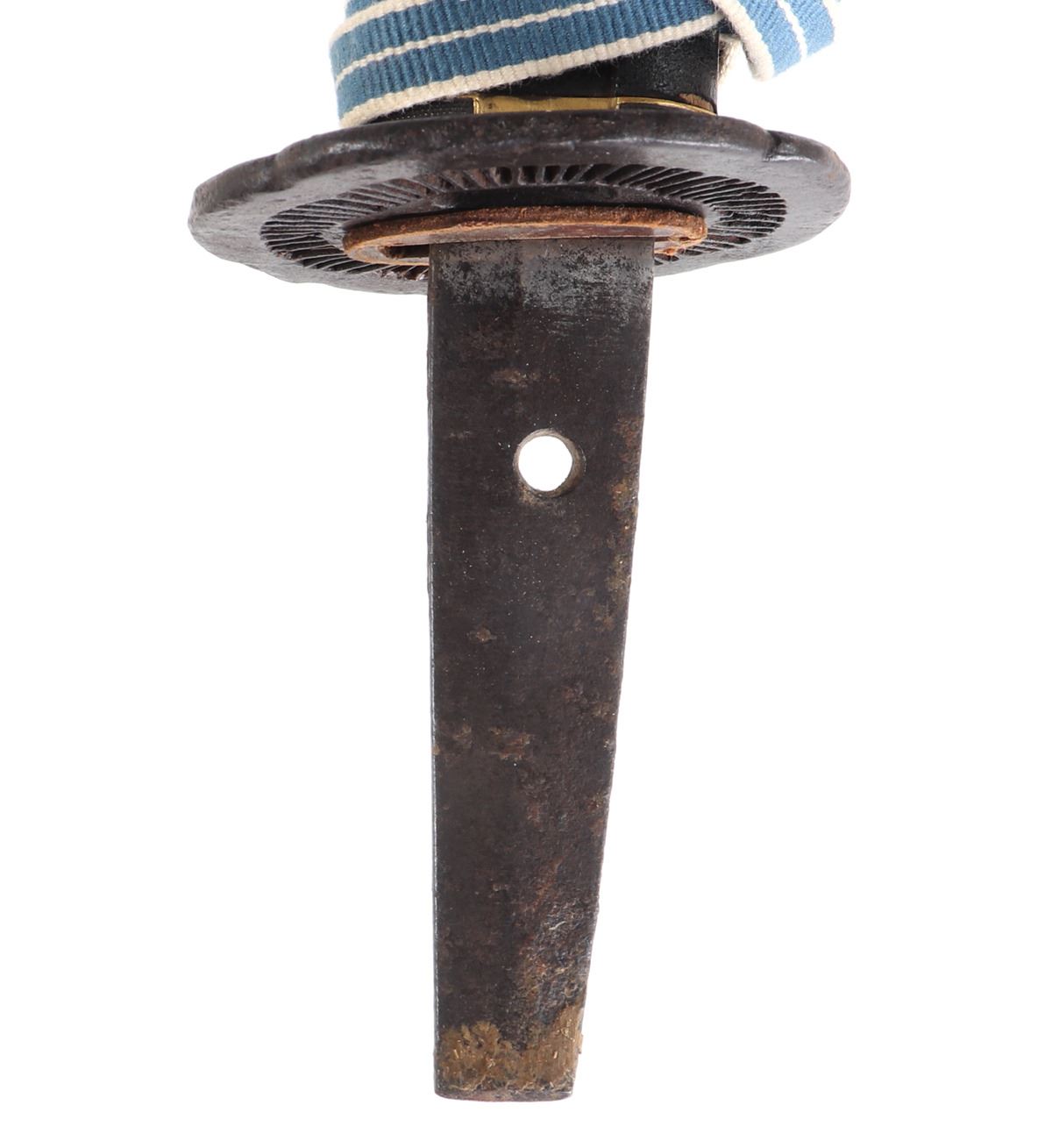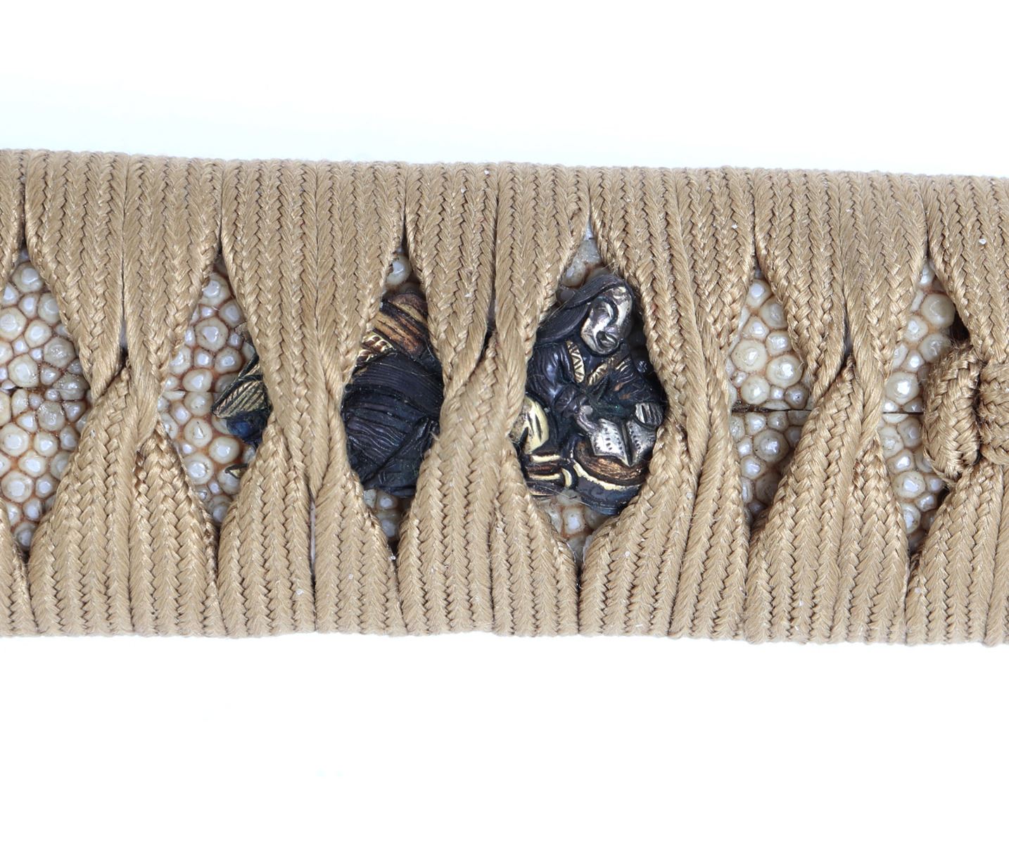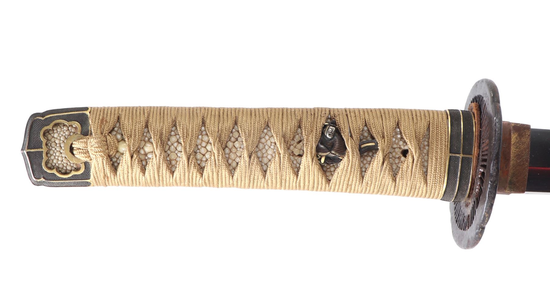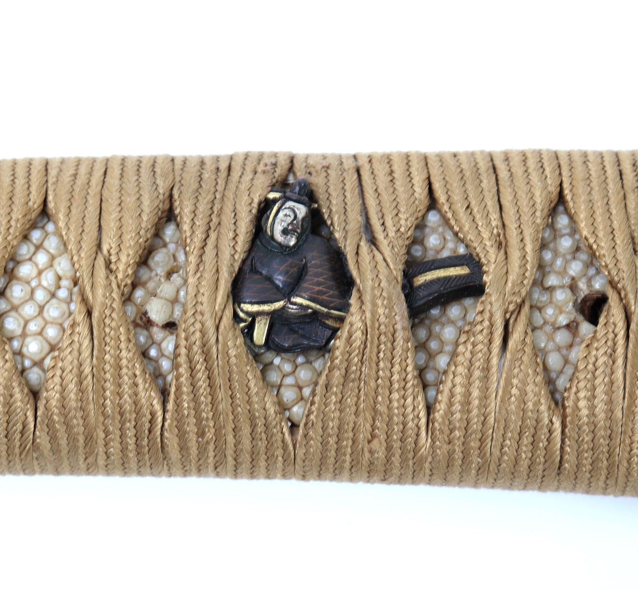 Fine Japanese Wakizashi sword and scabbard with Han-Dachi koshirae mounts. Early blade. Notable well patinated single hole tang. Single edge slightly curved with straight SUGU Hamon line. Textured scabbard with fine matching blackened textured mounts and fittings with gold gilt outlines. Iron pierced chrysanthemum openwork Mokko Gata shaped Tsuba. Excellent menuki in very fine mixed metal with silver inlaid decoration to a figures robes and face. The remainder in bronze and gold. Very good ray-skin tsuka grip very nicely wrapped in beige silk over. Wonderful set with matching mounts and menuki throughout. Size 26 1/2" L, blade 15 3/8" L, Not Signed. Condition: Good condition overall without any major blemishes or flaws. Provenance: Ex-Southern California Collection