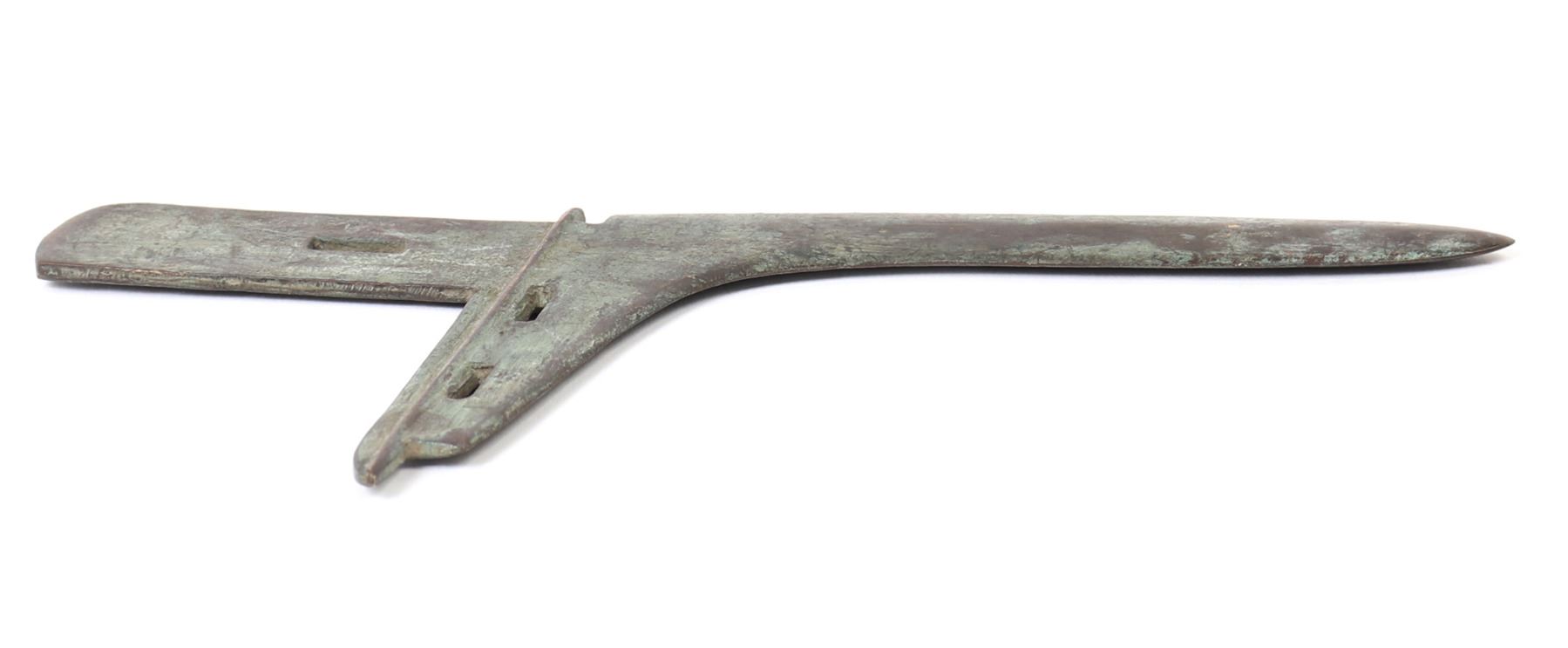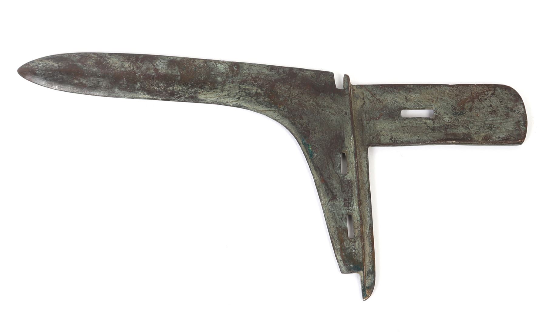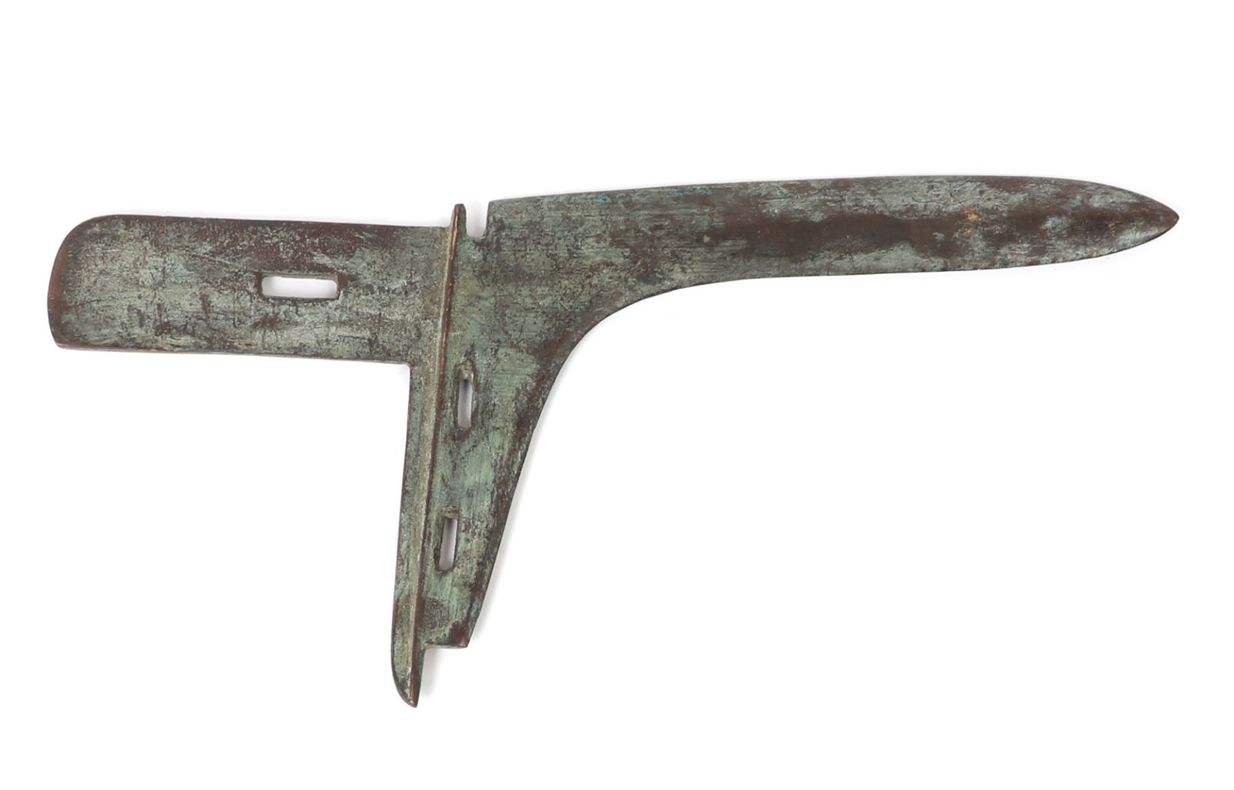 Chinese, Han dynasty ancient Ge bronze halberd blade with a series of slits to the shaft and spine with a sleek profile and curved double edged blade. Size 8 3/4" L, blade 6 1/2" L. Condition: Losses and patina throughout as shown.