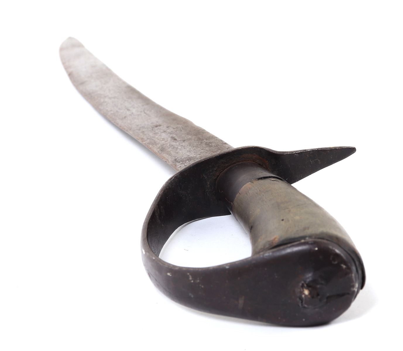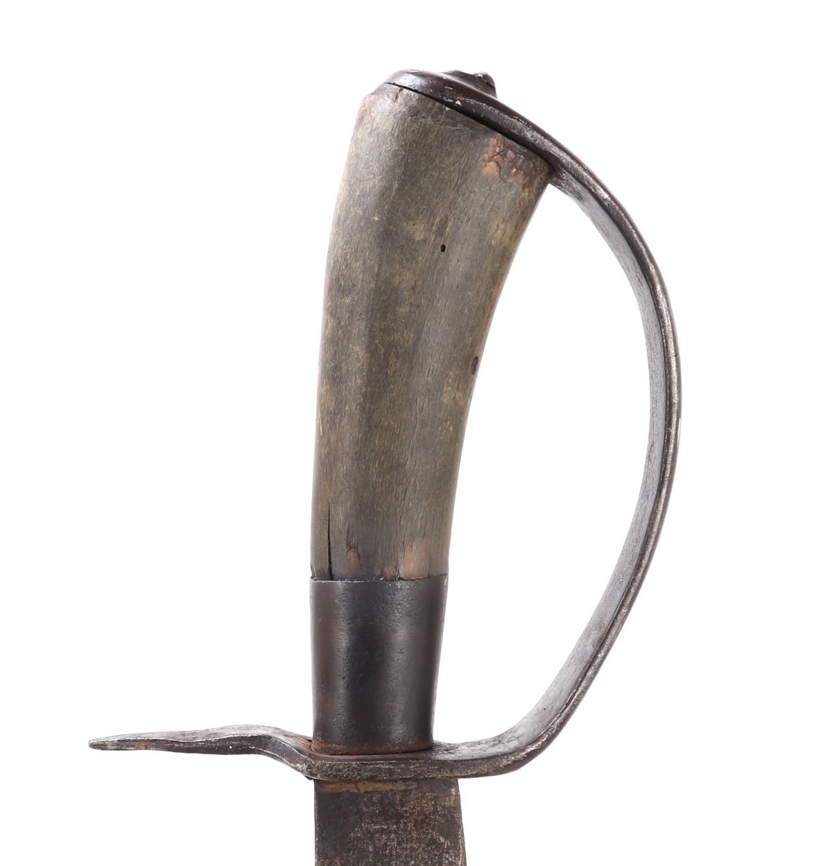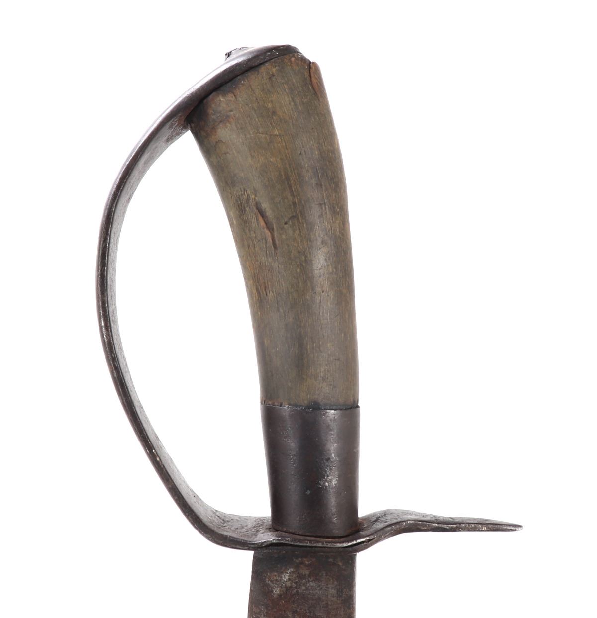 Philippines, Luzon sword of the Katipunan era or late 1800s. Curved edge straight blade with thick spine. D-shaped hand guard to handle in steel with a horn grip and iron sleeve to the base. Size 25 1/4" L, blade 20 1/4" L, spine at thickest point 3/10". Provenance: Ex-Southern California Moro Collection