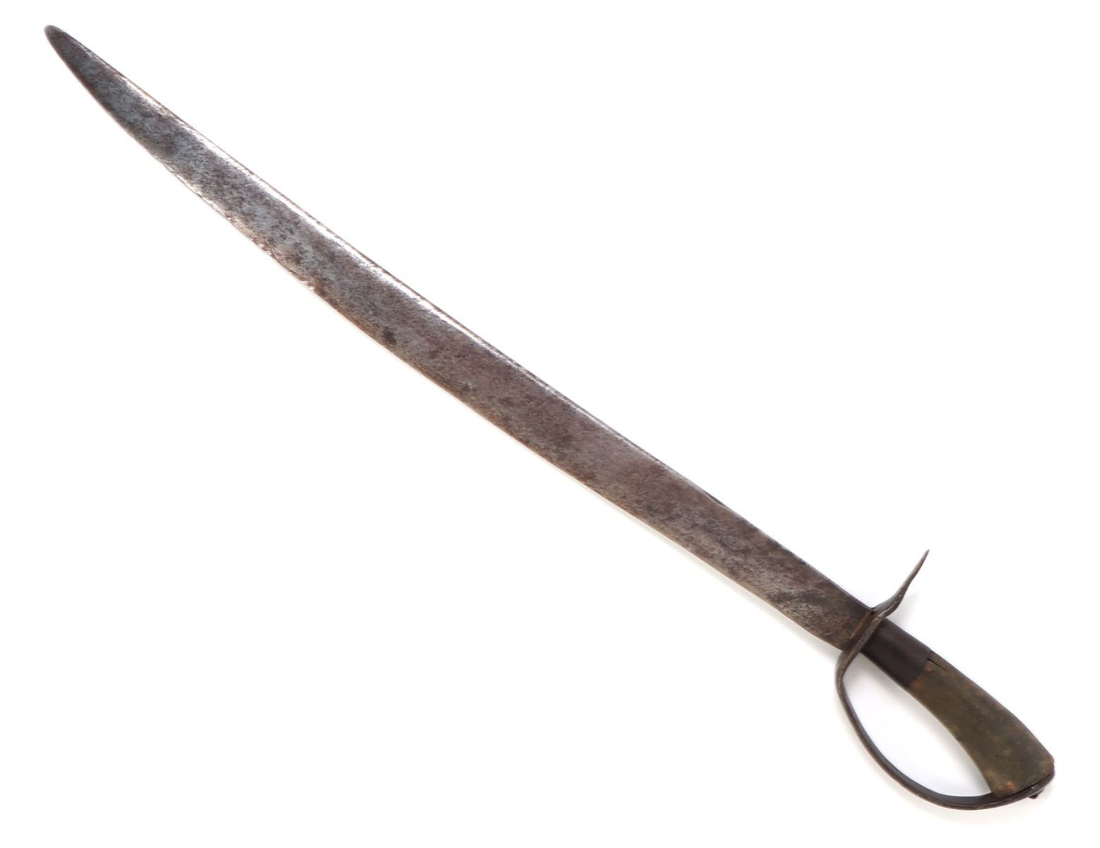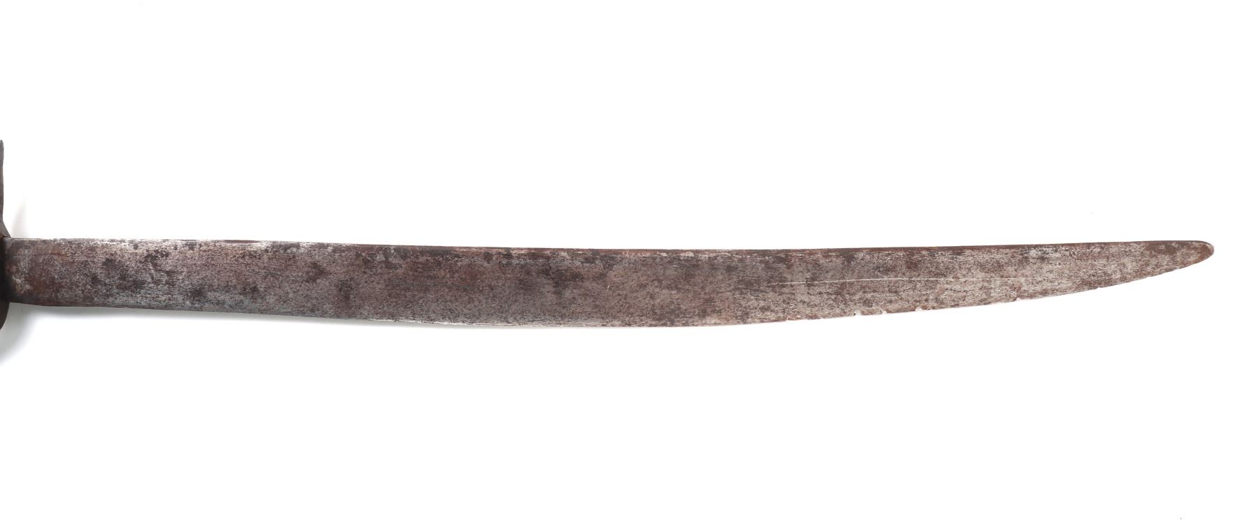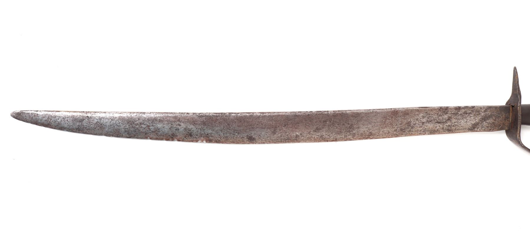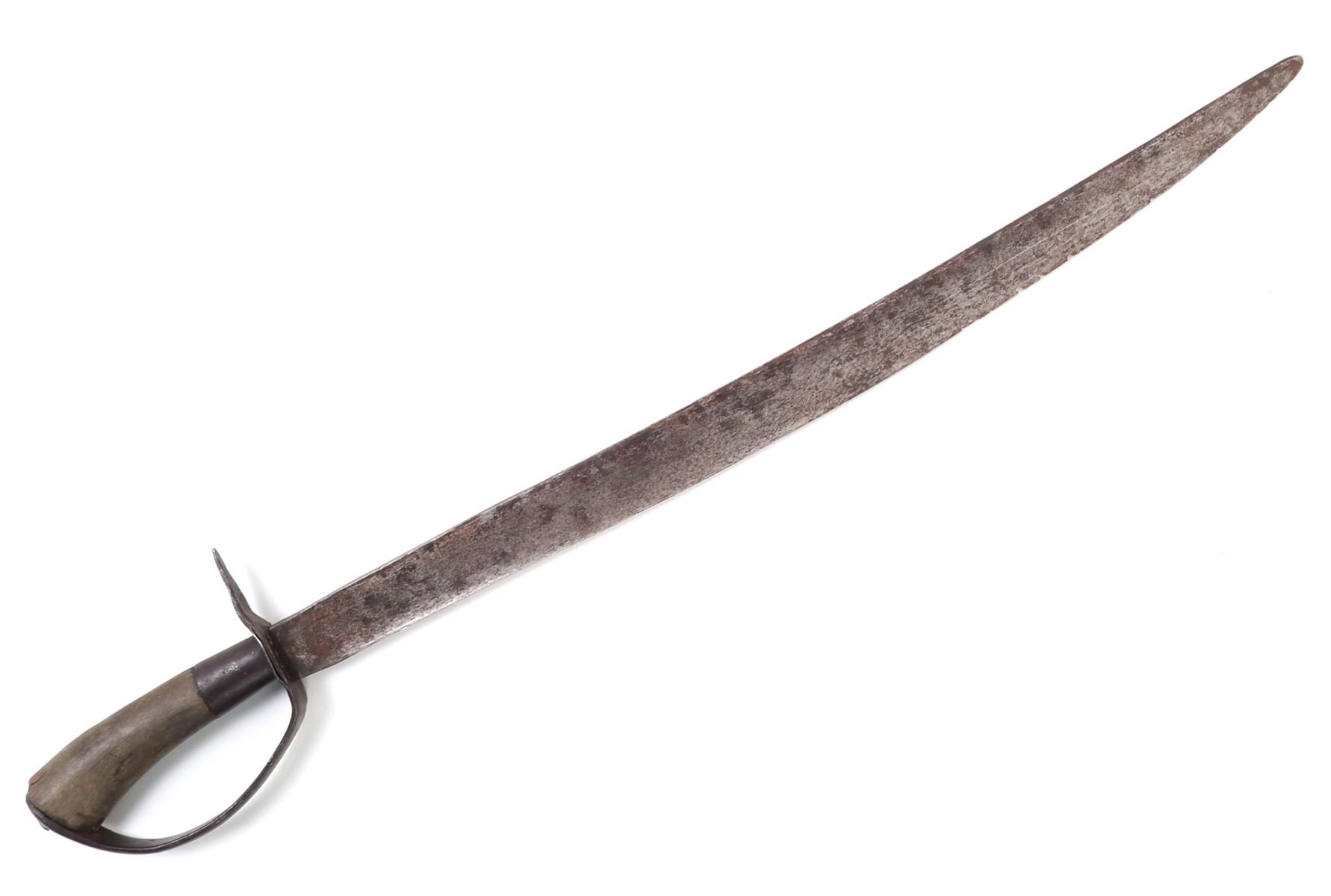 Philippines, Luzon sword of the Katipunan era or late 1800s. Curved edge straight blade with thick spine. D-shaped hand guard to handle in steel with a horn grip and iron sleeve to the base. Size 25 1/4" L, blade 20 1/4" L, spine at thickest point 3/10". Provenance: Ex-Southern California Moro Collection