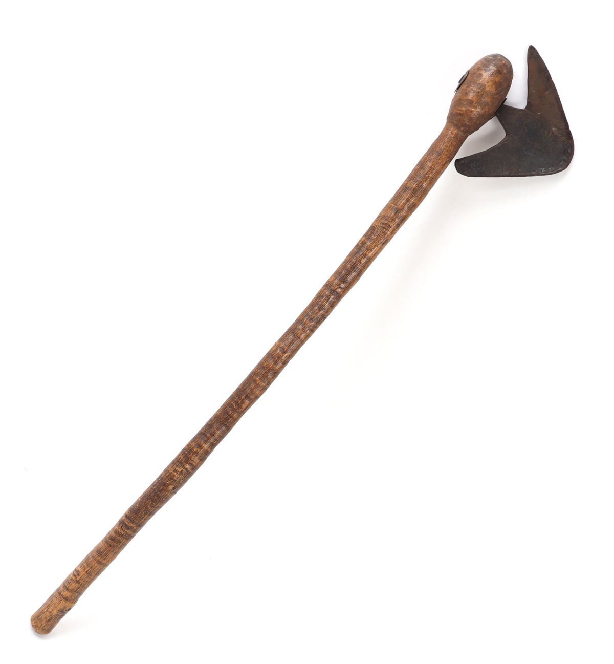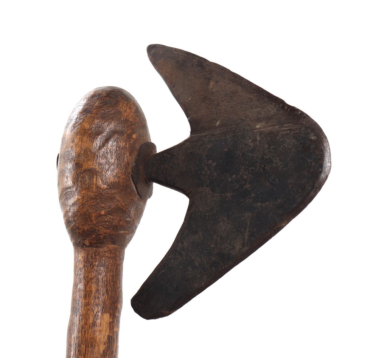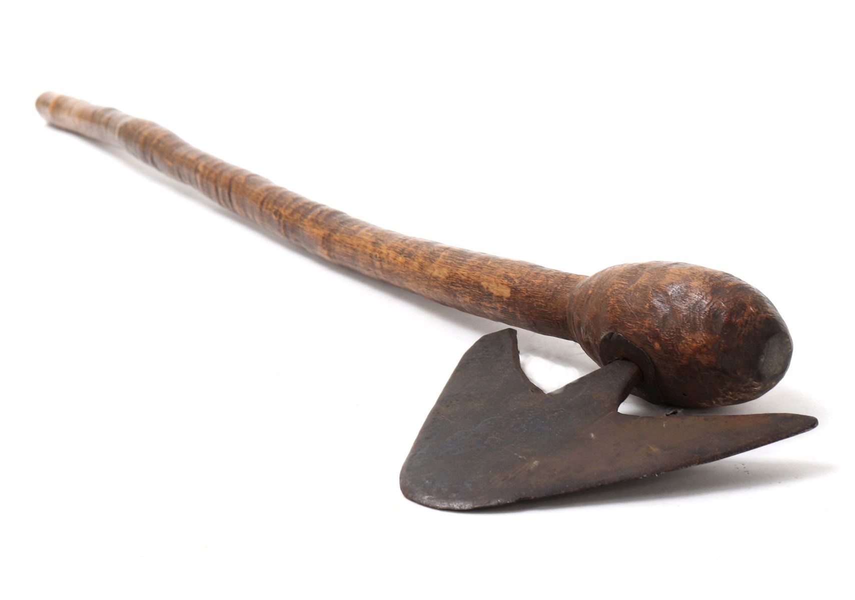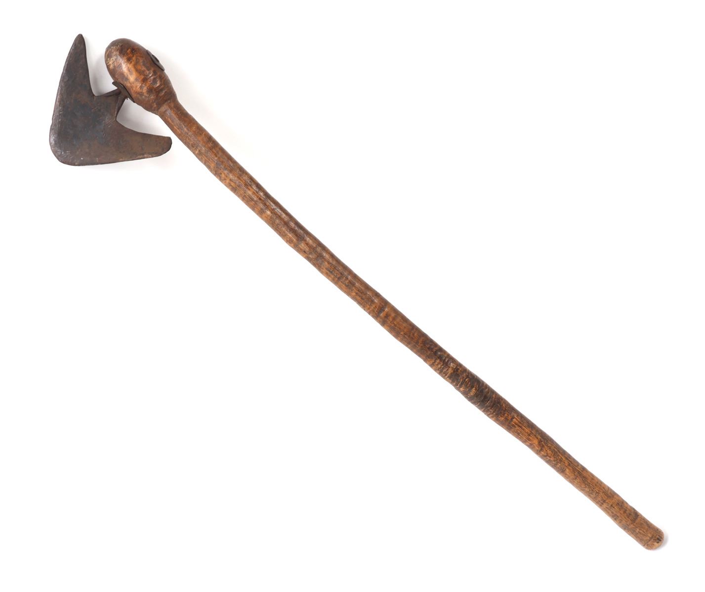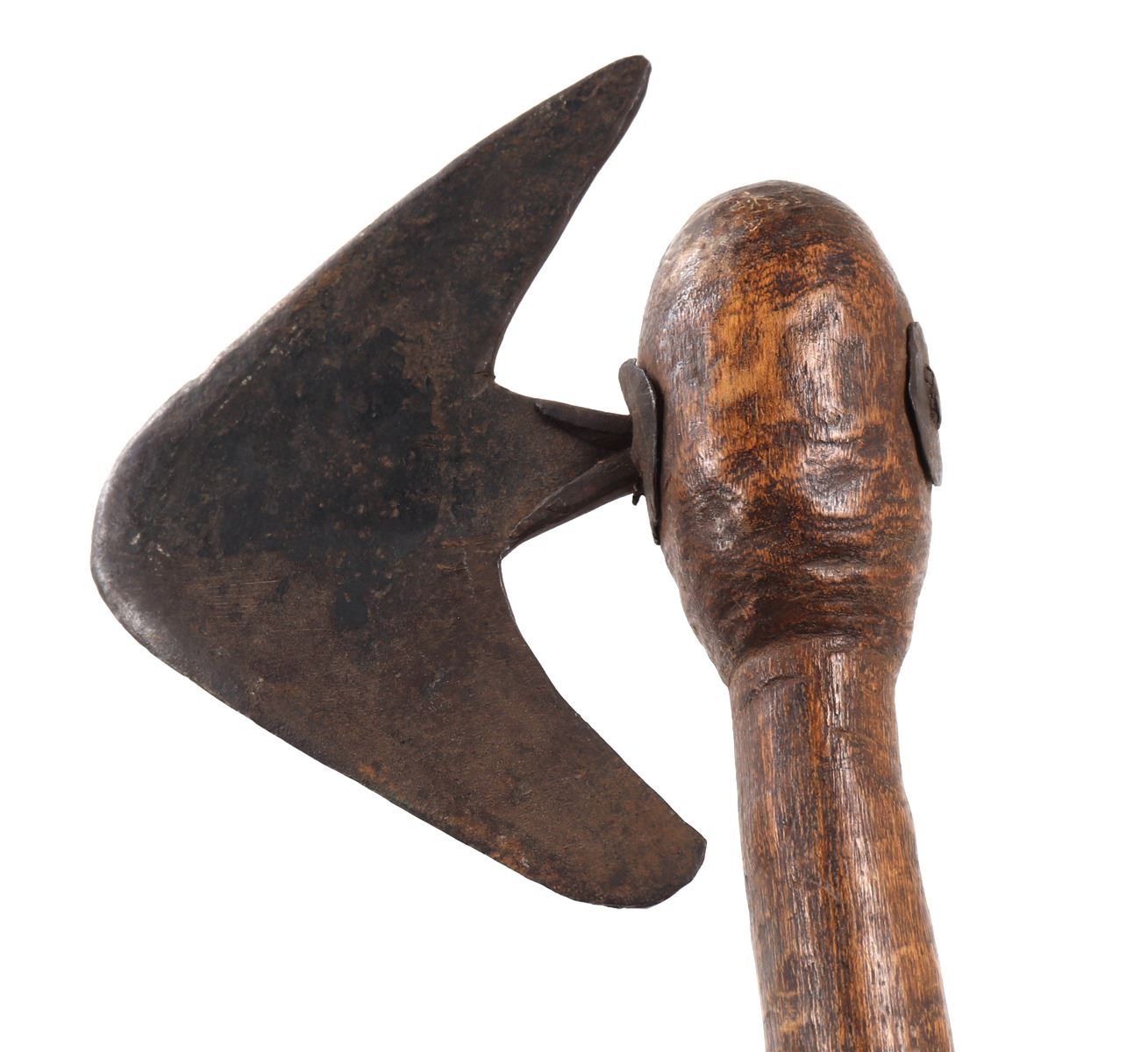 Nicely crafted African wood and steel tribal axe. Long wood shaft with steel axe head secured to the top. Steel axe head in an avian or arrowhead form with two in turned points. Size blade 6" L, size overall 26" L. Condition: Good overall condition with some patina present.