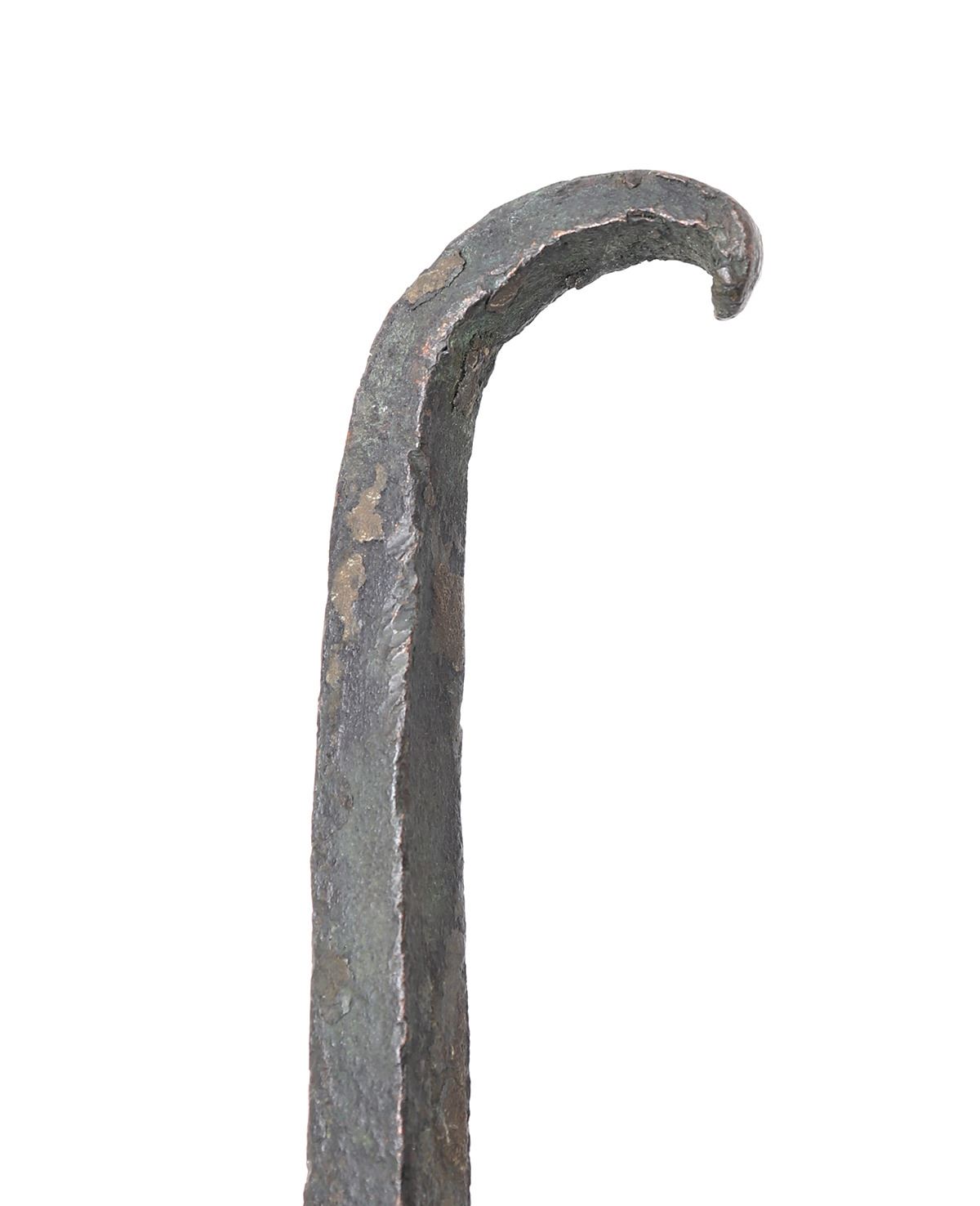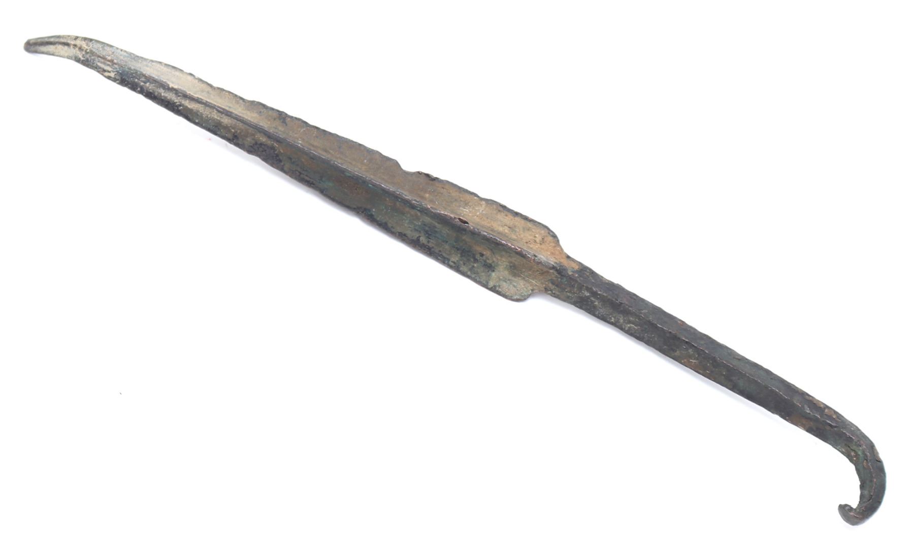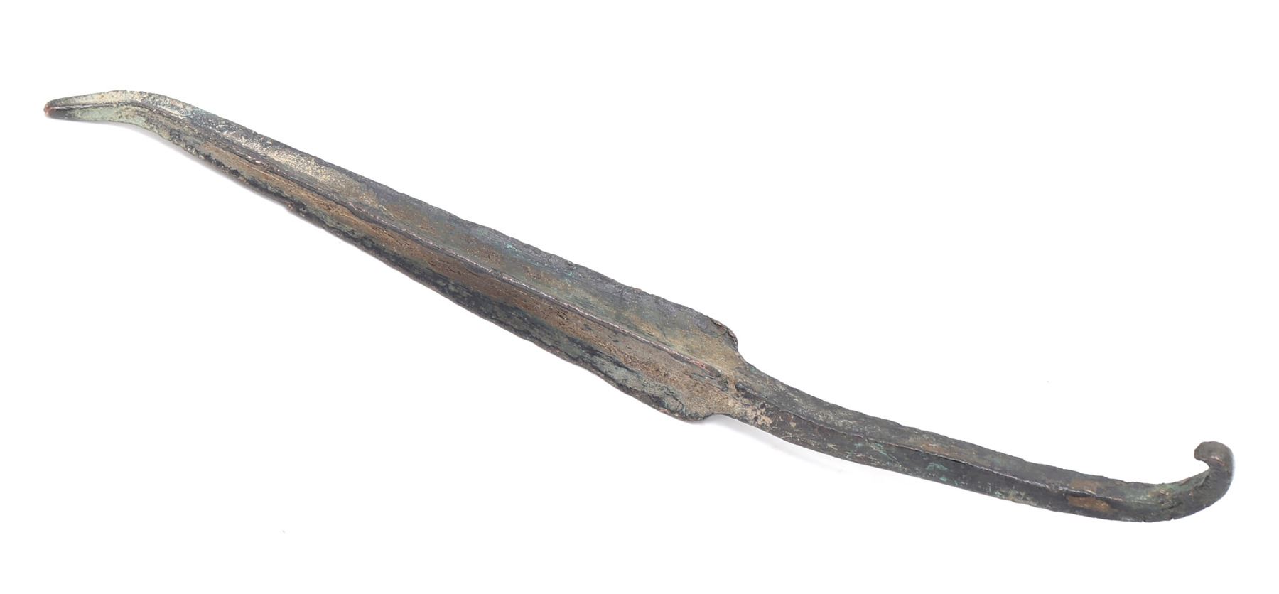 Ancient Mediterranean, Cyprus, Early Cypriot III Bronze Age 2100 BCE - 1901 BCE. Massive four sided spear with a heavy four sided tang which curls to a hook. Blade with four sides of leaves gradually terminating to a point. For a similar example see The Fitzwilliam Museum Cambridge (Accession Number: GR.5r.1939) Size 16" L. Condition: Good condition with bend to the tip from impact.. Provenance: Ex-Private USA Collection