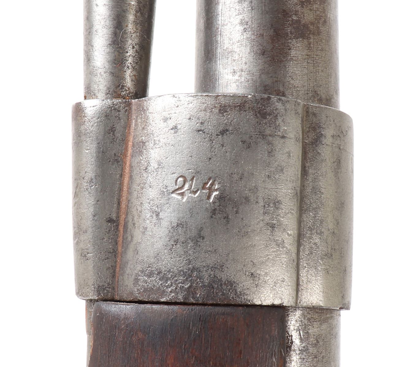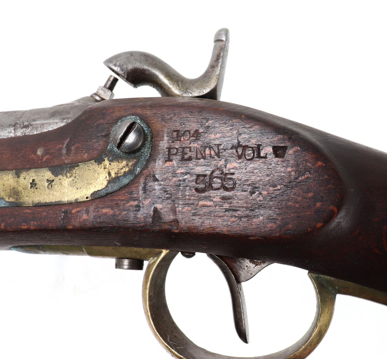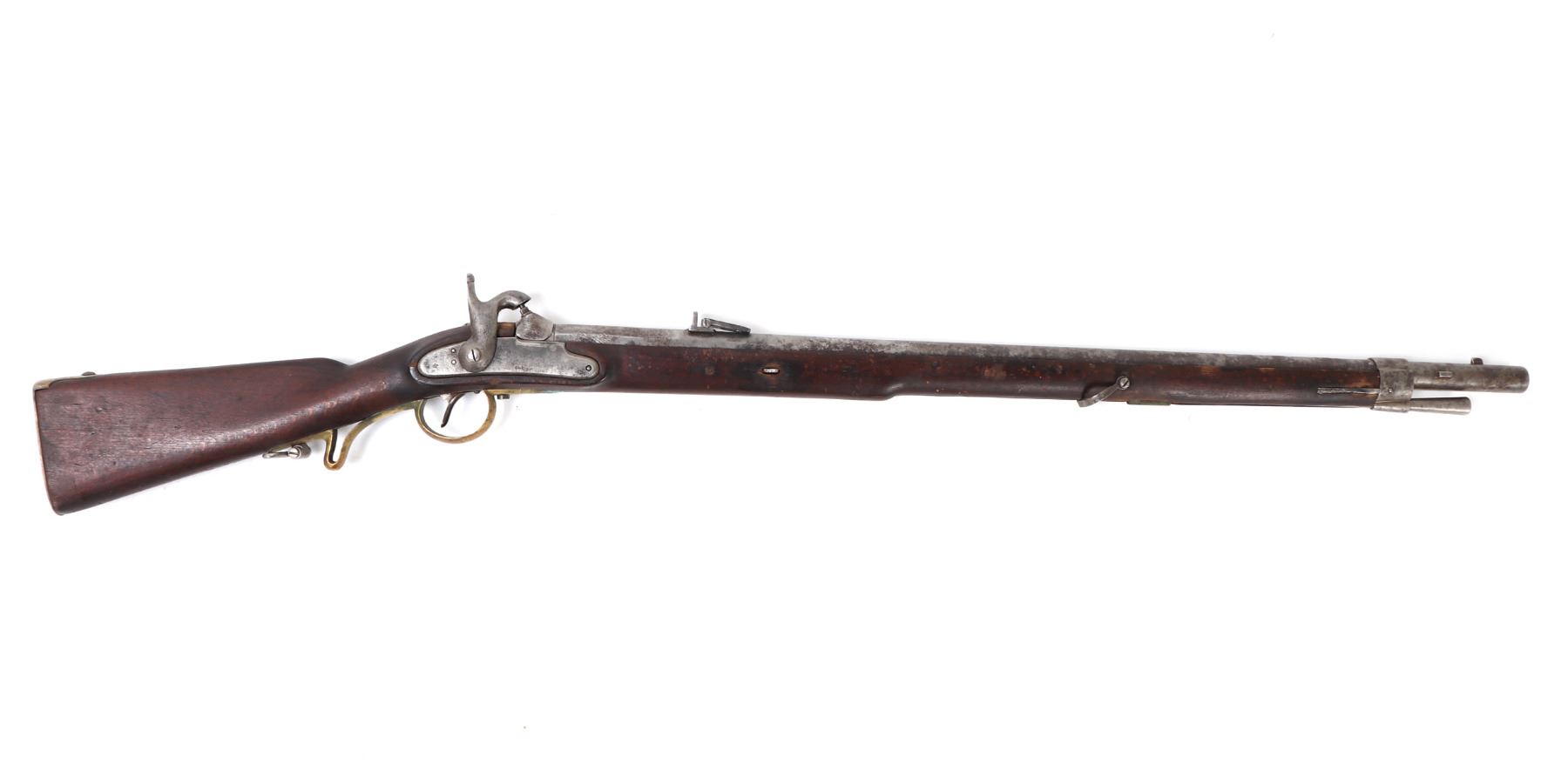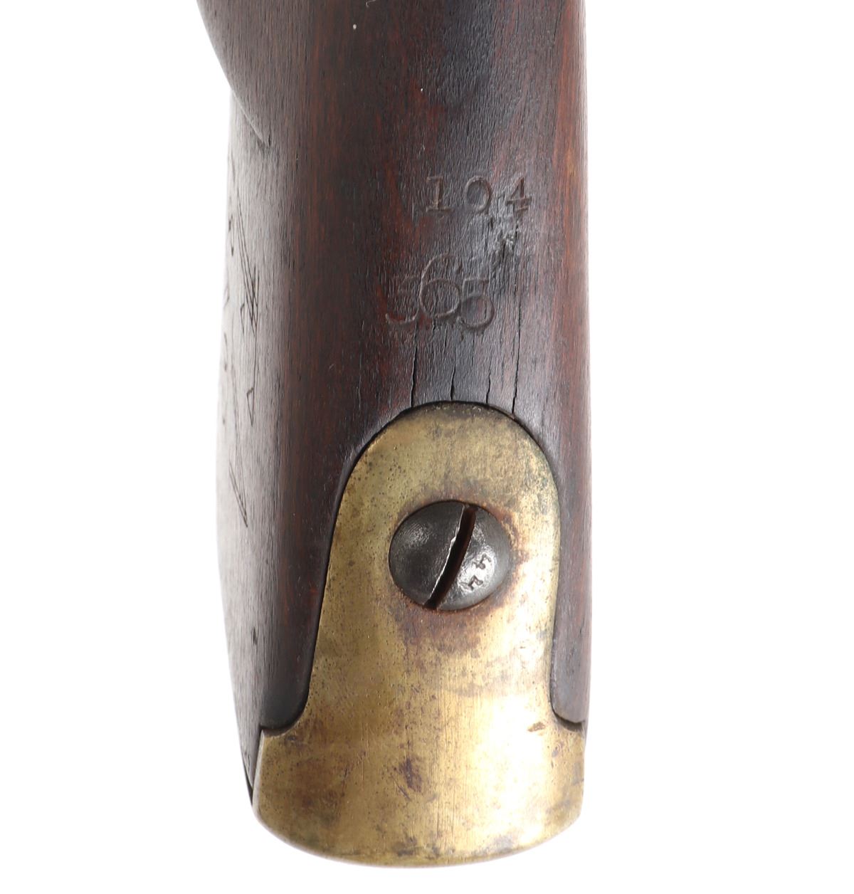 Civil War Confederate percussion musket M1849 Jaeger rifle. Lock plate marked (849). Proof marked (24) to brass side plate. Stock with several marked including opposite the lock plate (104, PENN, VOL ?, 565) and additionally (104, W, 565) to the underside and butt of the stock. Octagonal to round barrel with rear sights .71 caliber. Size 48" L, Barrel 35 1/4" L. Provenance: Ex-Southern California Collection