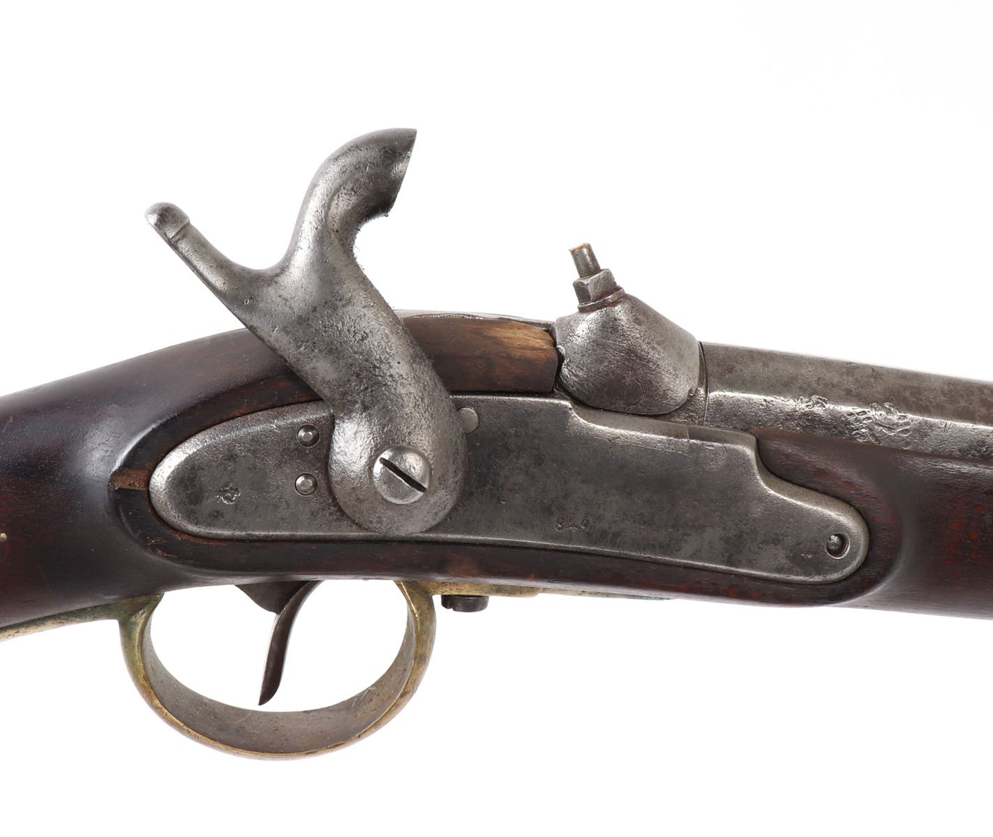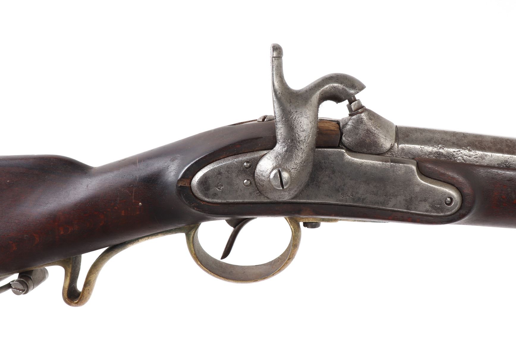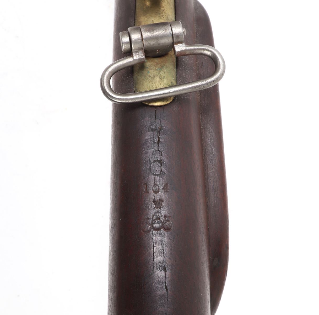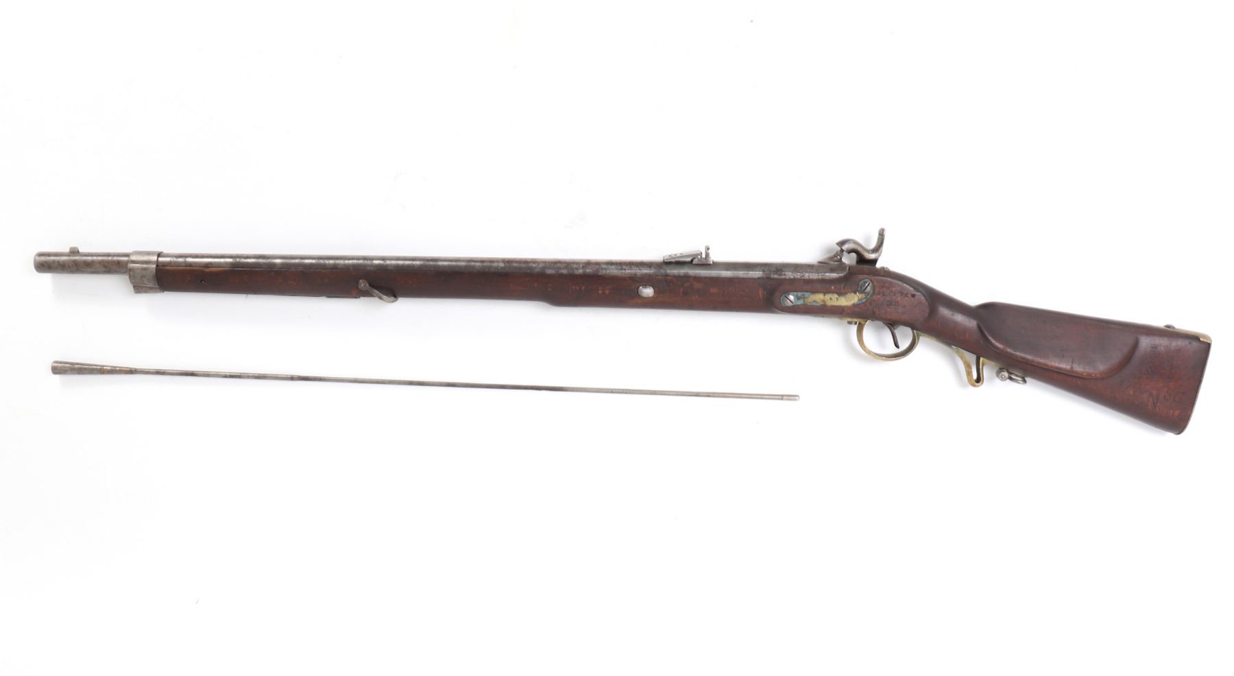 Civil War Confederate percussion musket M1849 Jaeger rifle. Lock plate marked (849). Proof marked (24) to brass side plate. Stock with several marked including opposite the lock plate (104, PENN, VOL ?, 565) and additionally (104, W, 565) to the underside and butt of the stock. Octagonal to round barrel with rear sights .71 caliber. Size 48" L, Barrel 35 1/4" L. Provenance: Ex-Southern California Collection
