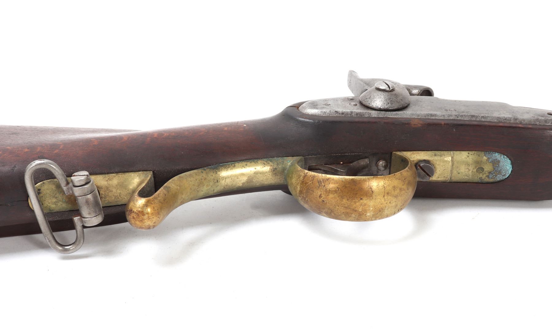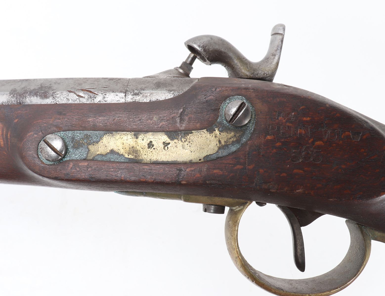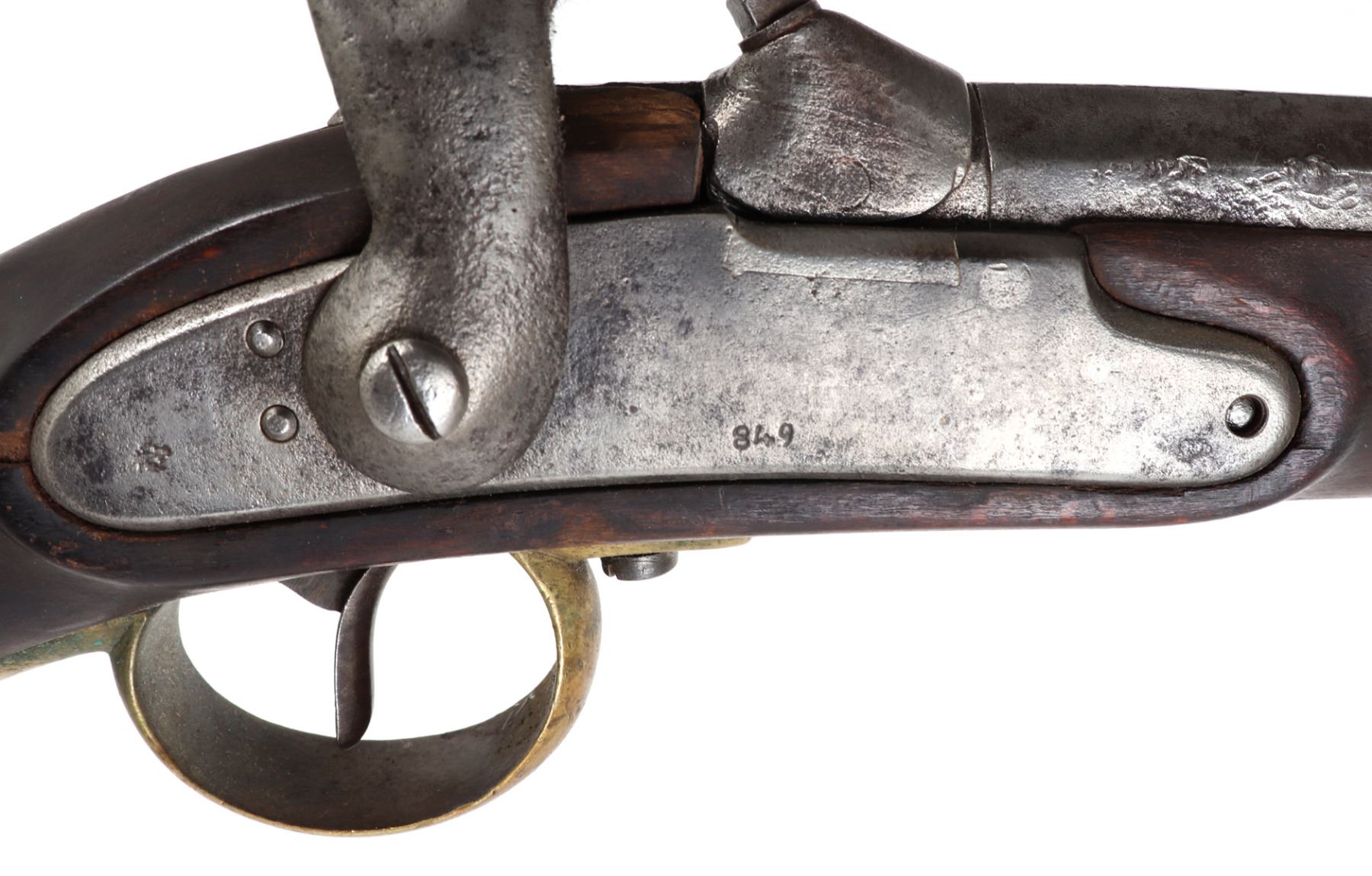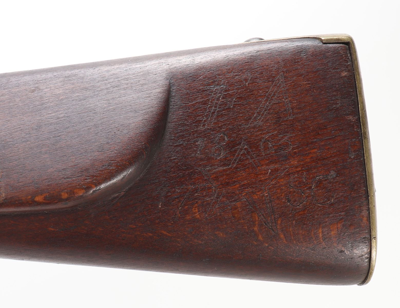 Civil War Confederate percussion musket M1849 Jaeger rifle. Lock plate marked (849). Proof marked (24) to brass side plate. Stock with several marked including opposite the lock plate (104, PENN, VOL ?, 565) and additionally (104, W, 565) to the underside and butt of the stock. Octagonal to round barrel with rear sights .71 caliber. Size 48" L, Barrel 35 1/4" L. Provenance: Ex-Southern California Collection