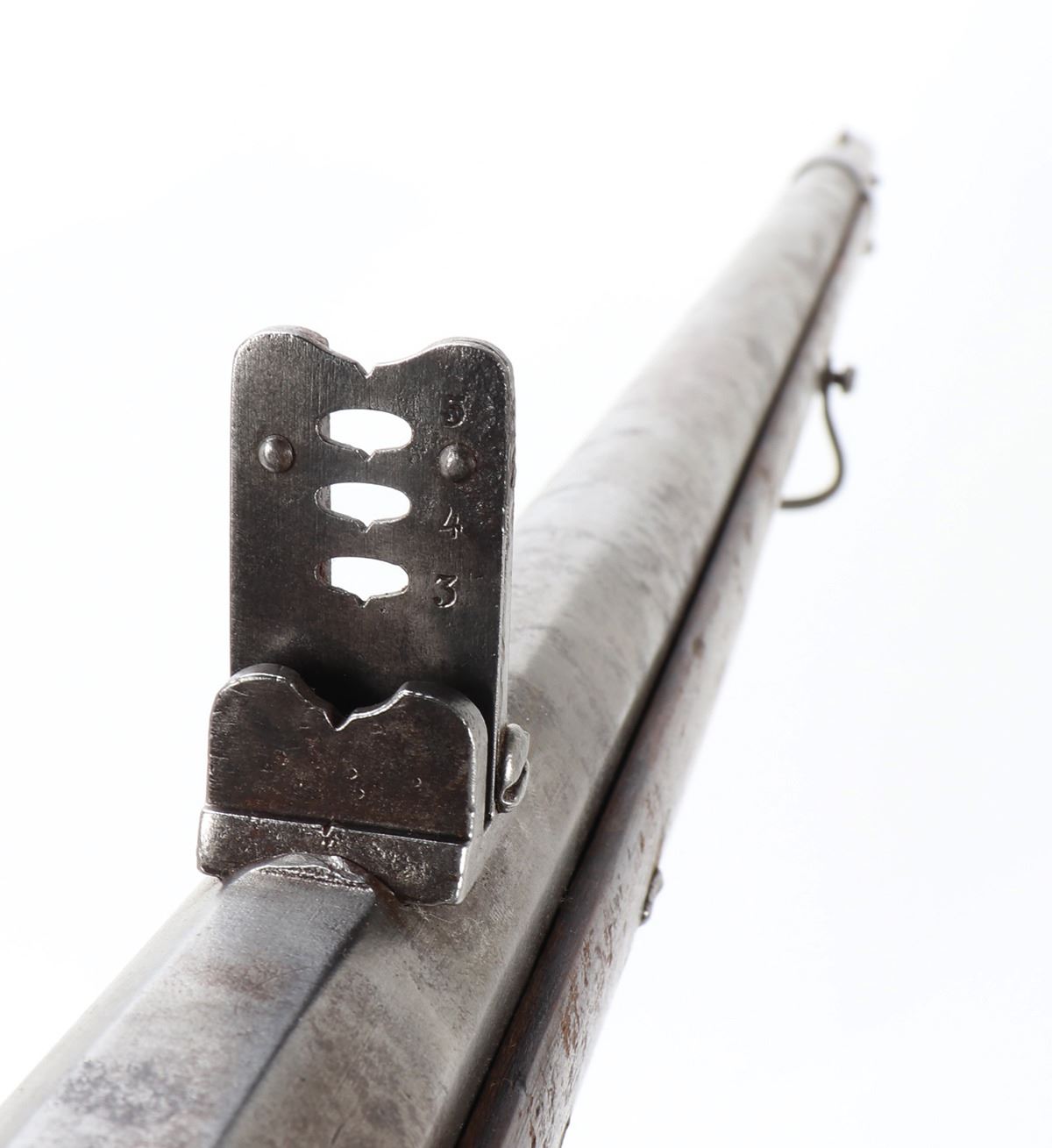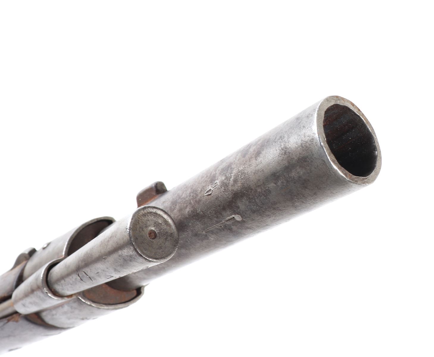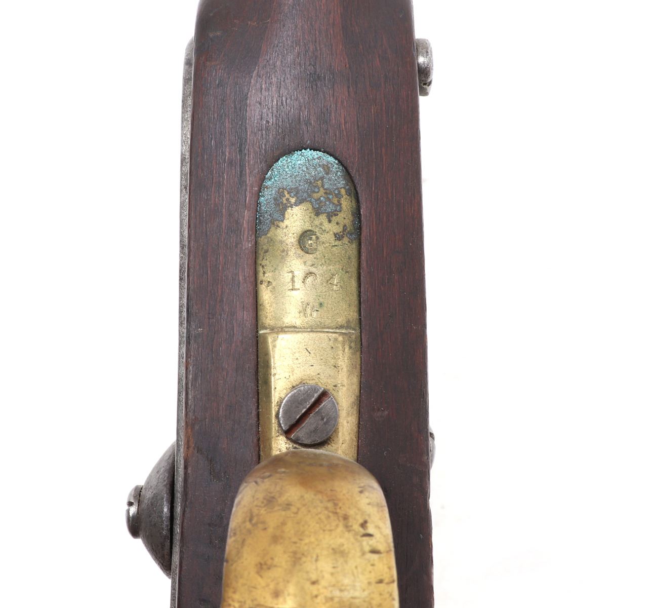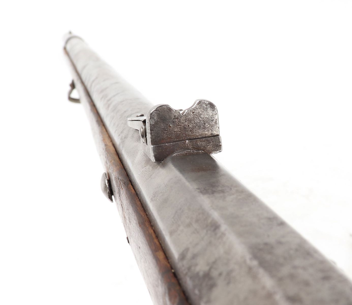 Civil War Confederate percussion musket M1849 Jaeger rifle. Lock plate marked (849). Proof marked (24) to brass side plate. Stock with several marked including opposite the lock plate (104, PENN, VOL ?, 565) and additionally (104, W, 565) to the underside and butt of the stock. Octagonal to round barrel with rear sights .71 caliber. Size 48" L, Barrel 35 1/4" L. Provenance: Ex-Southern California Collection