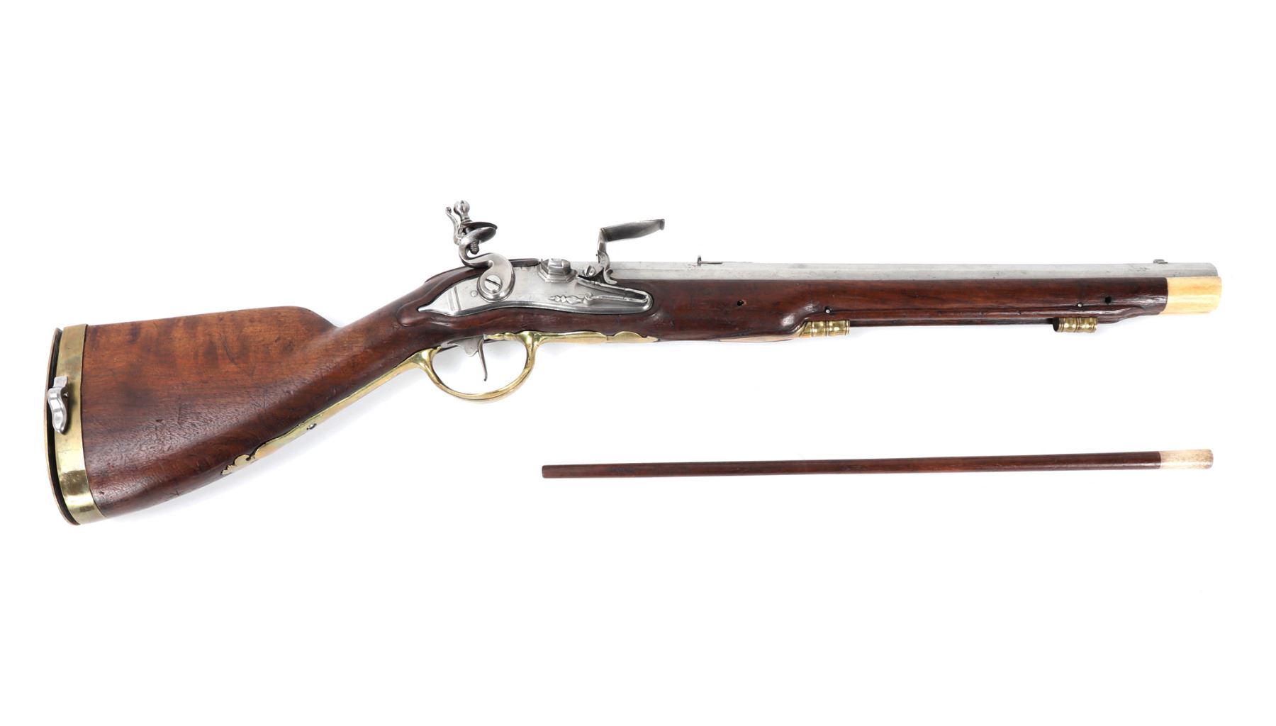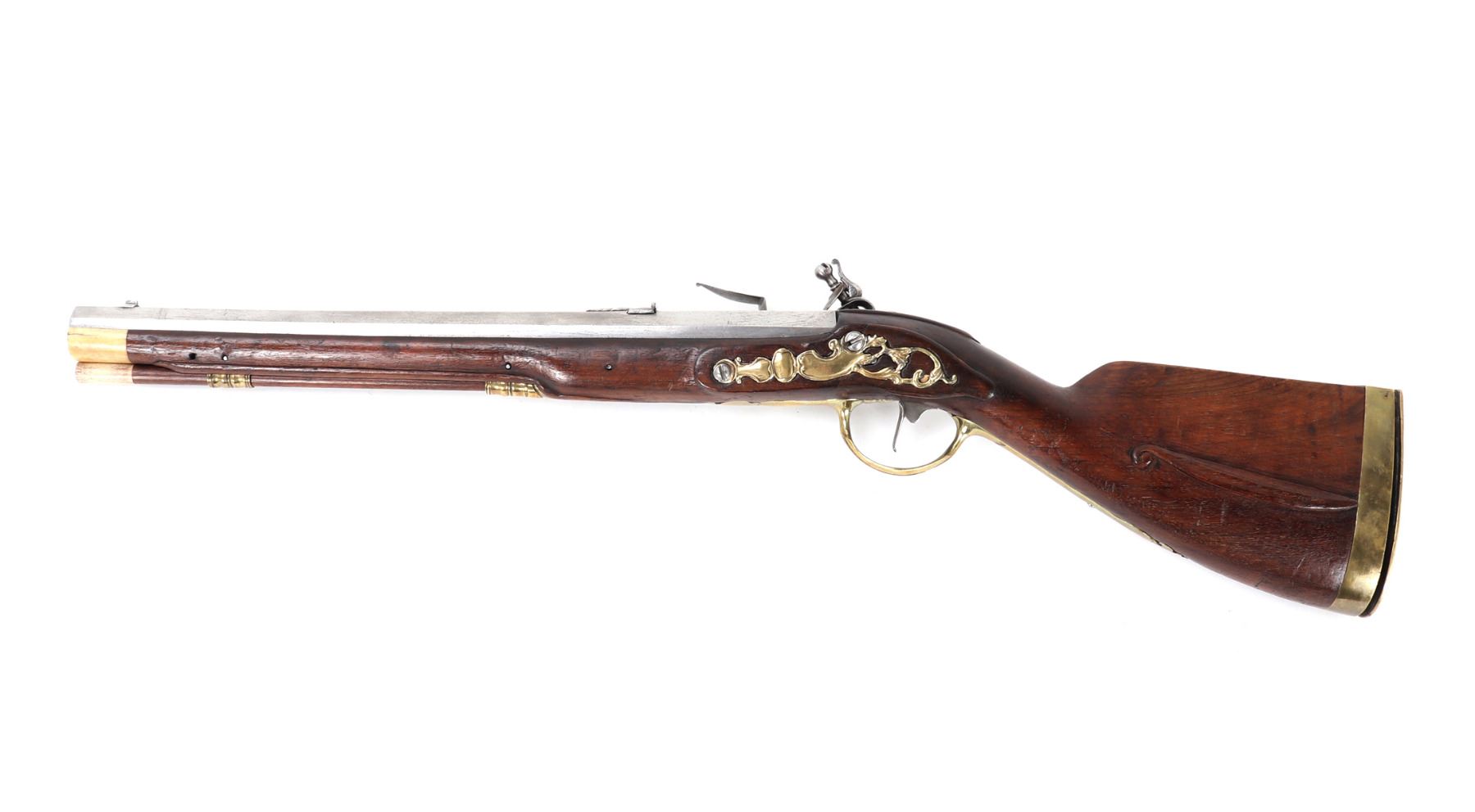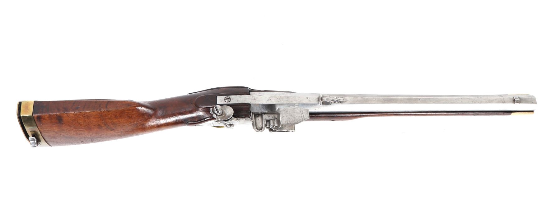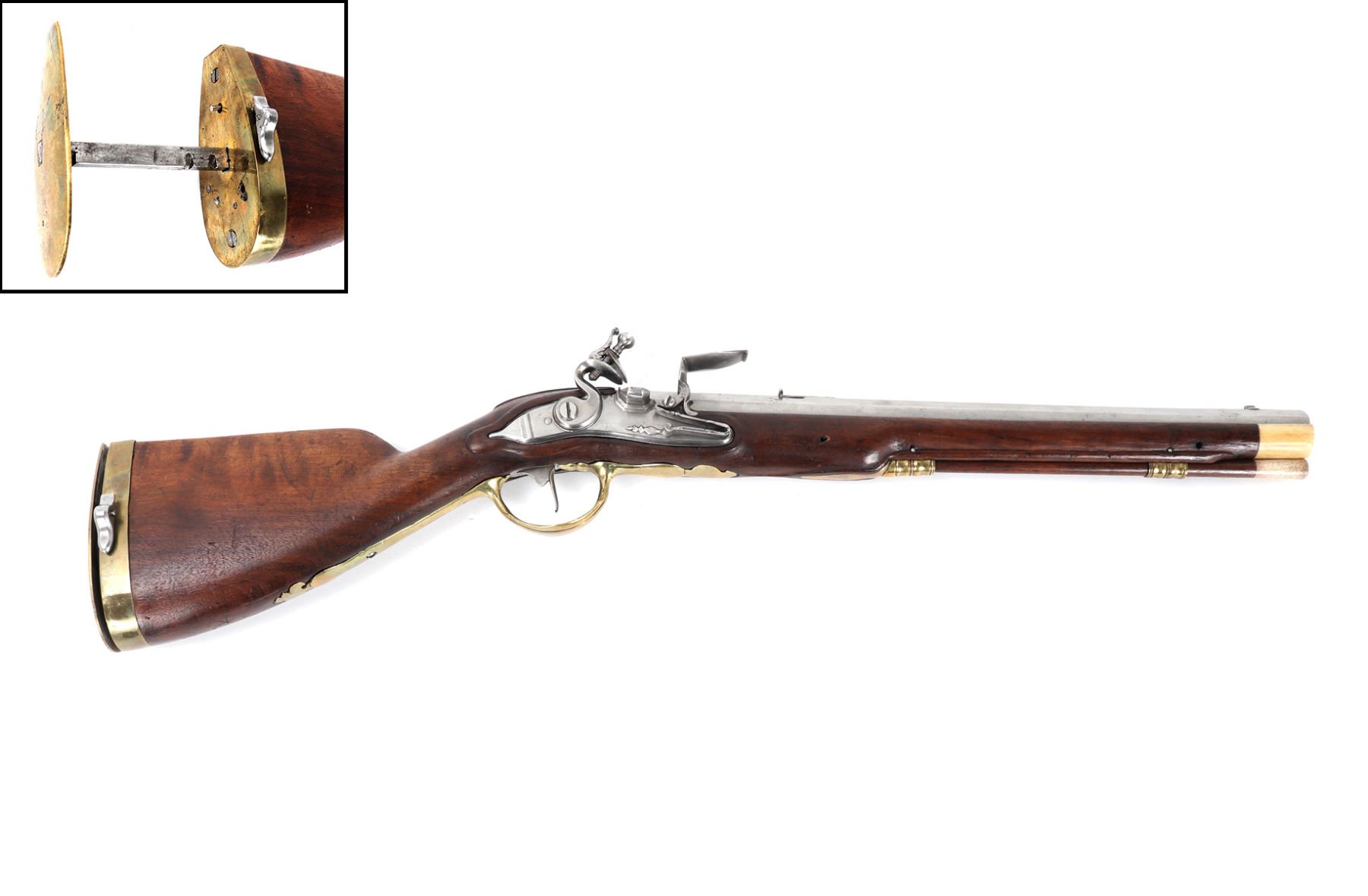 Fine and excellent quality flintlock carbine with expanding stock, 18th century. Stock in a maple or oak with brass mounts and chiseled steel lock plate. Barrel is a very stout octagonal form. Original ramrod. Strong action. Size 28" L, 32" L when expanded, barrel 16 1/2" L, weight 6 lbs. Provenance: Ex-Southwest Collection
