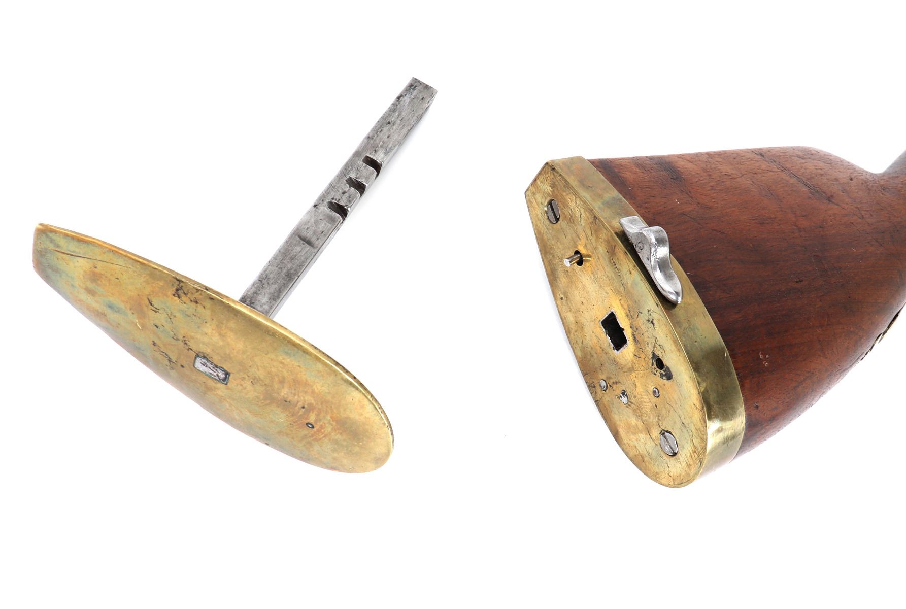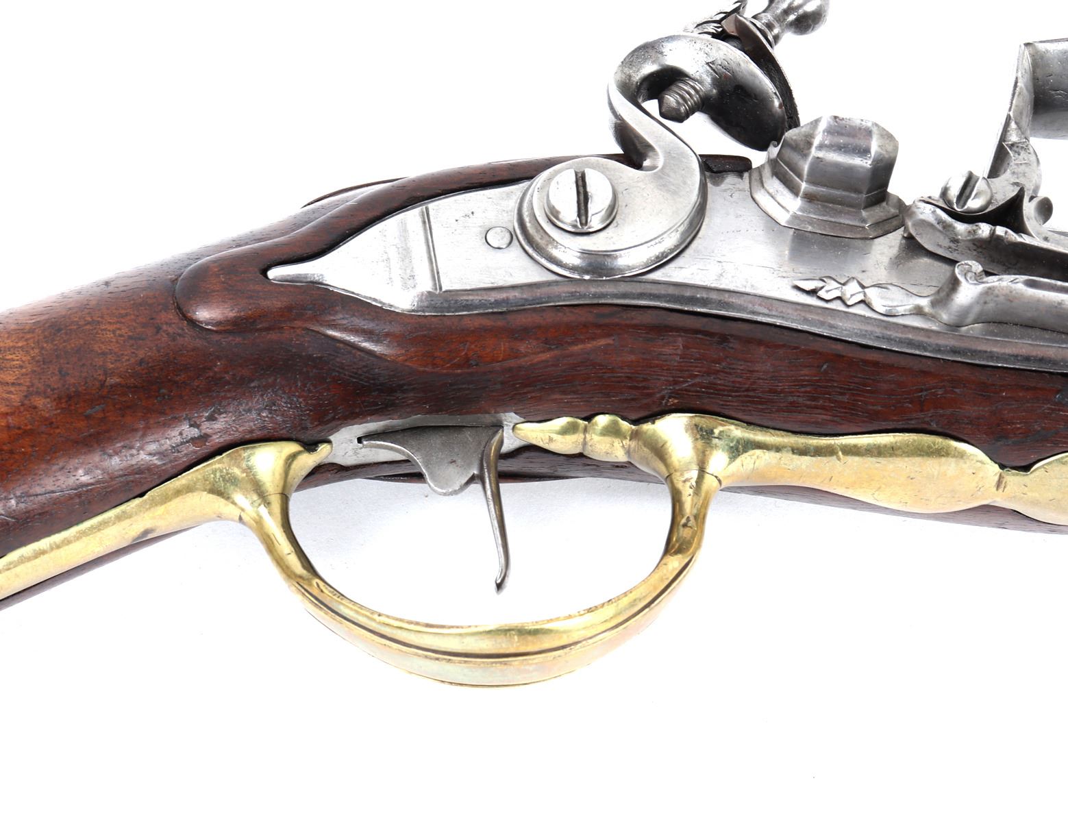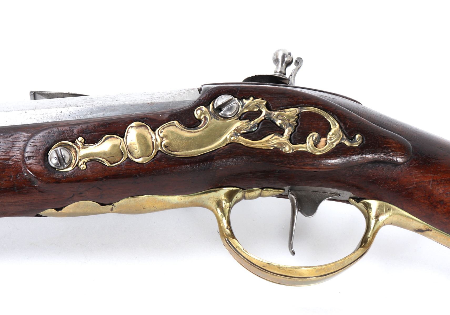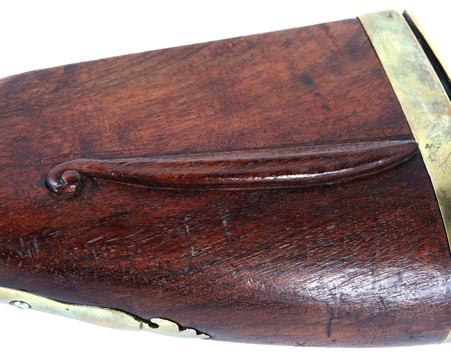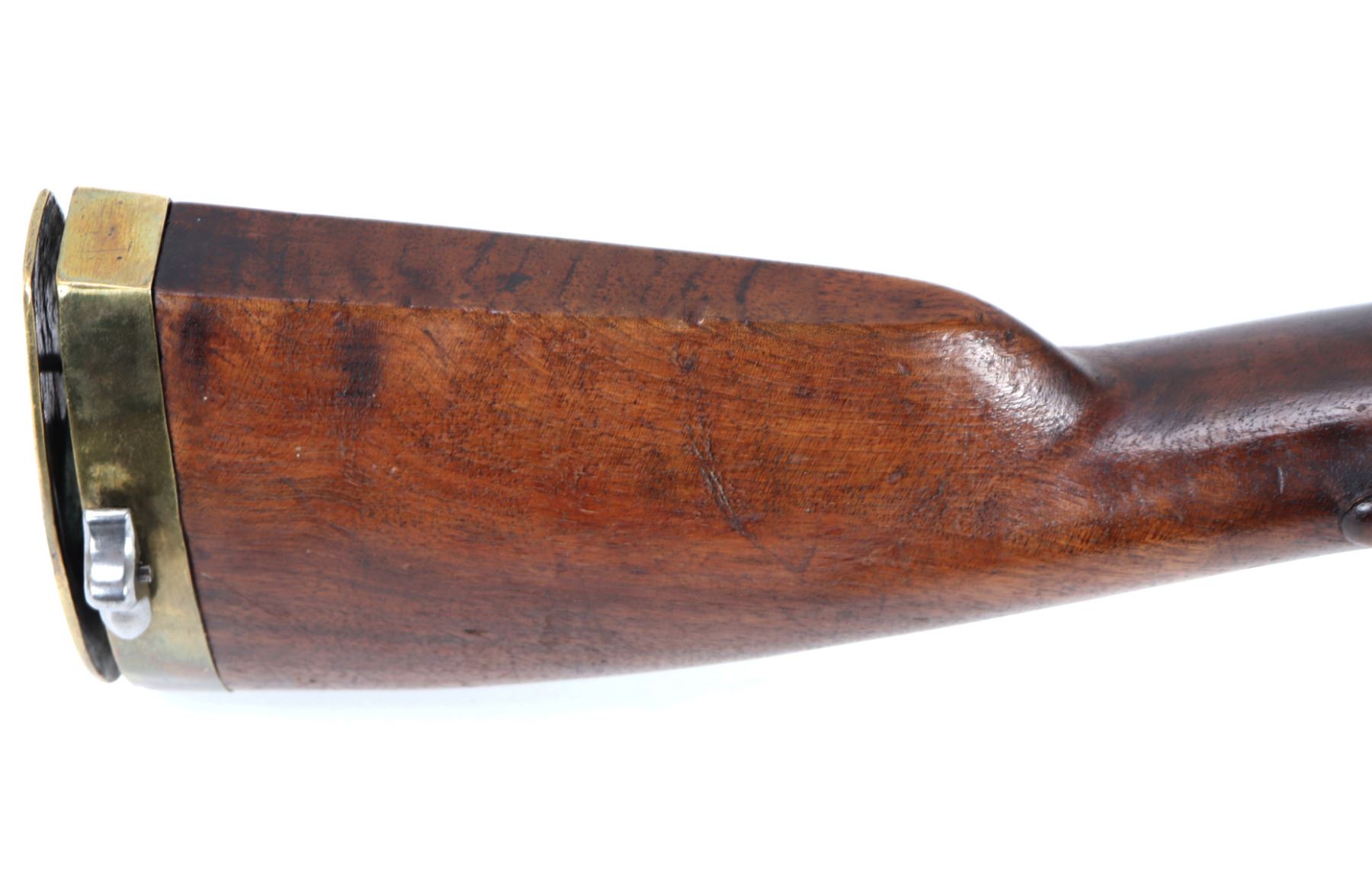 Fine and excellent quality flintlock carbine with expanding stock, 18th century. Stock in a maple or oak with brass mounts and chiseled steel lock plate. Barrel is a very stout octagonal form. Original ramrod. Strong action. Size 28" L, 32" L when expanded, barrel 16 1/2" L, weight 6 lbs. Provenance: Ex-Southwest Collection
