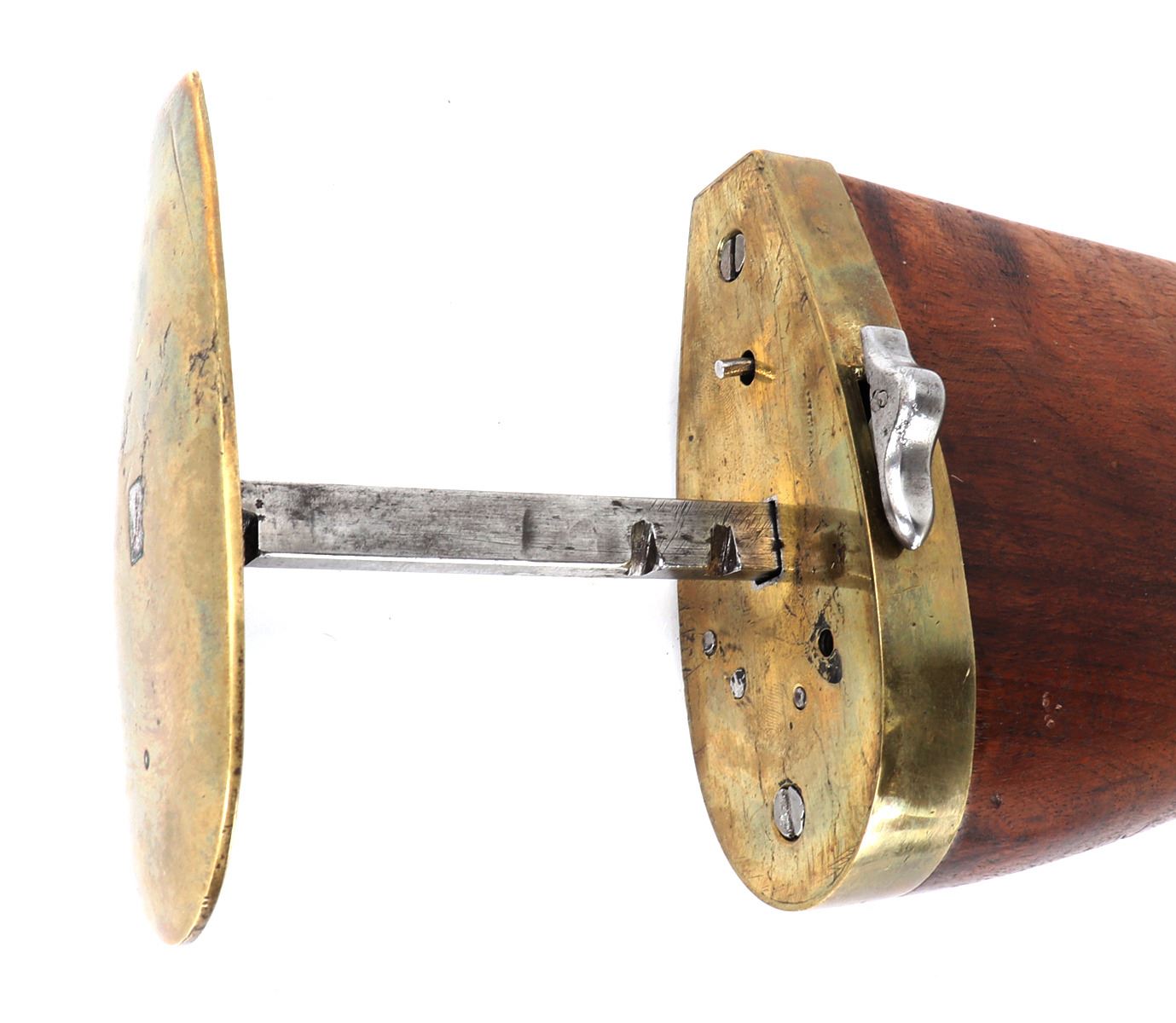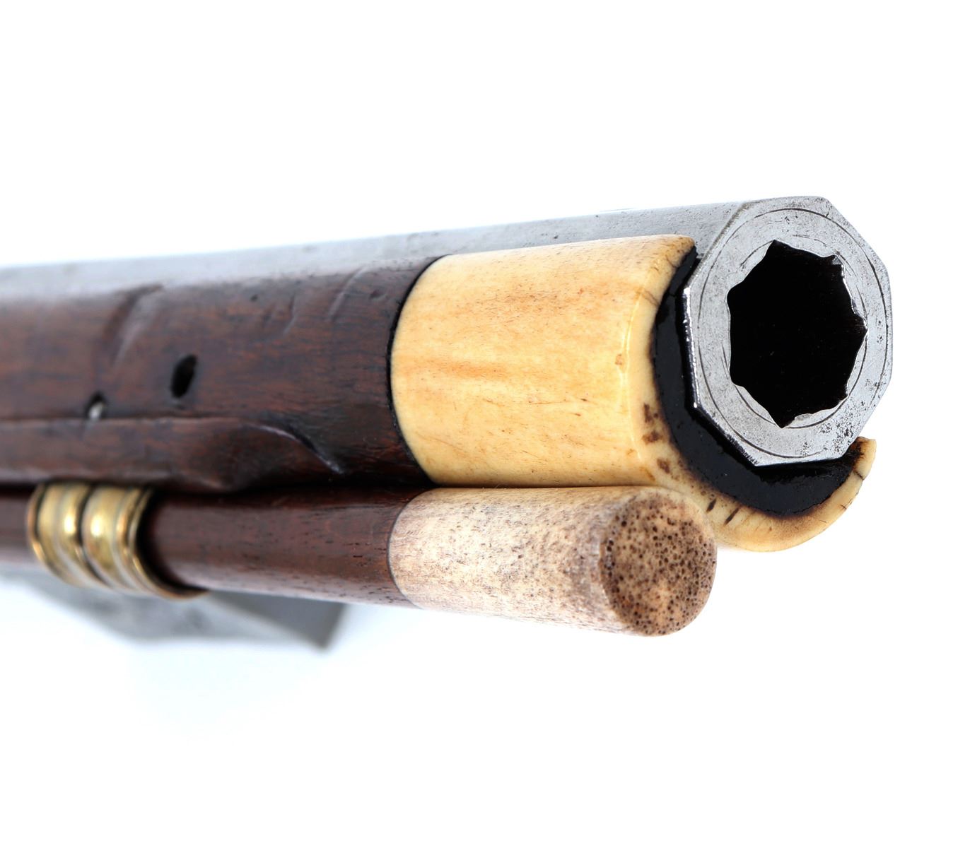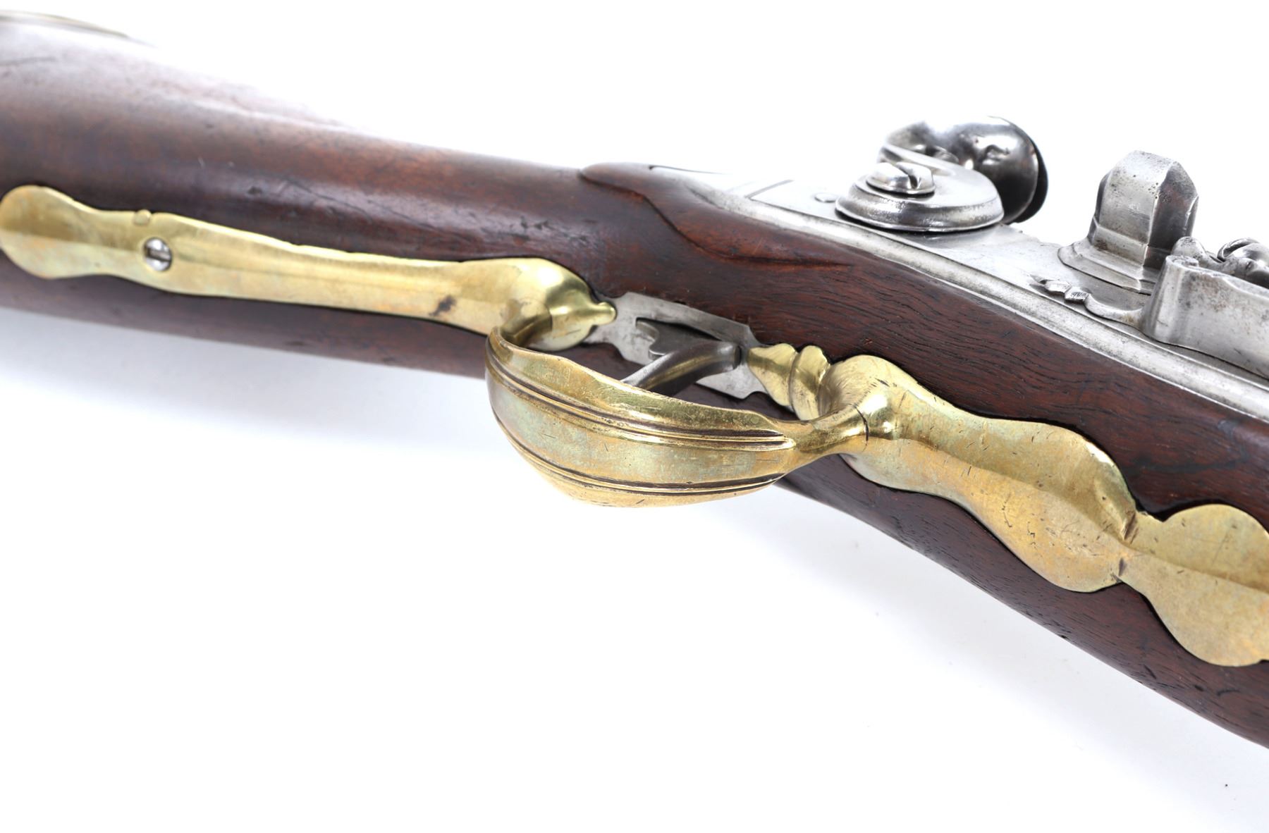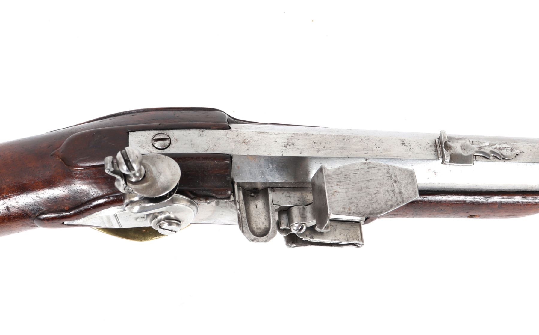 Fine and excellent quality flintlock carbine with expanding stock, 18th century. Stock in a maple or oak with brass mounts and chiseled steel lock plate. Barrel is a very stout octagonal form. Original ramrod. Strong action. Size 28" L, 32" L when expanded, barrel 16 1/2" L, weight 6 lbs. Provenance: Ex-Southwest Collection