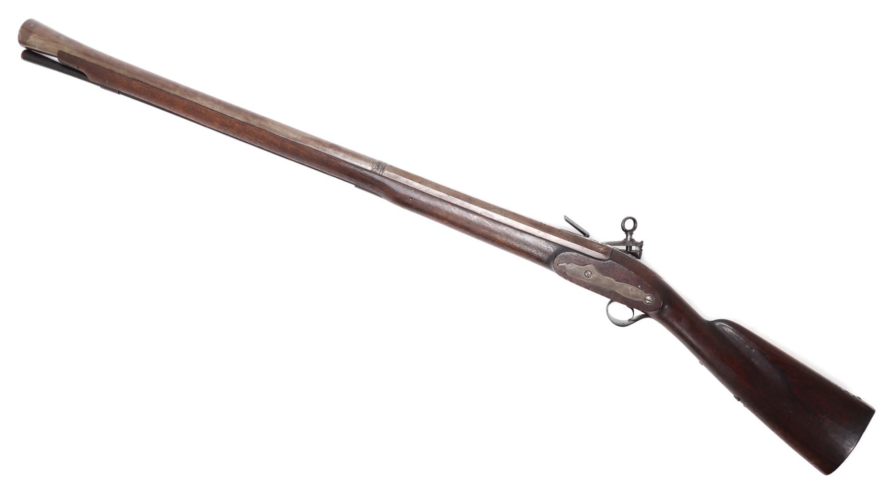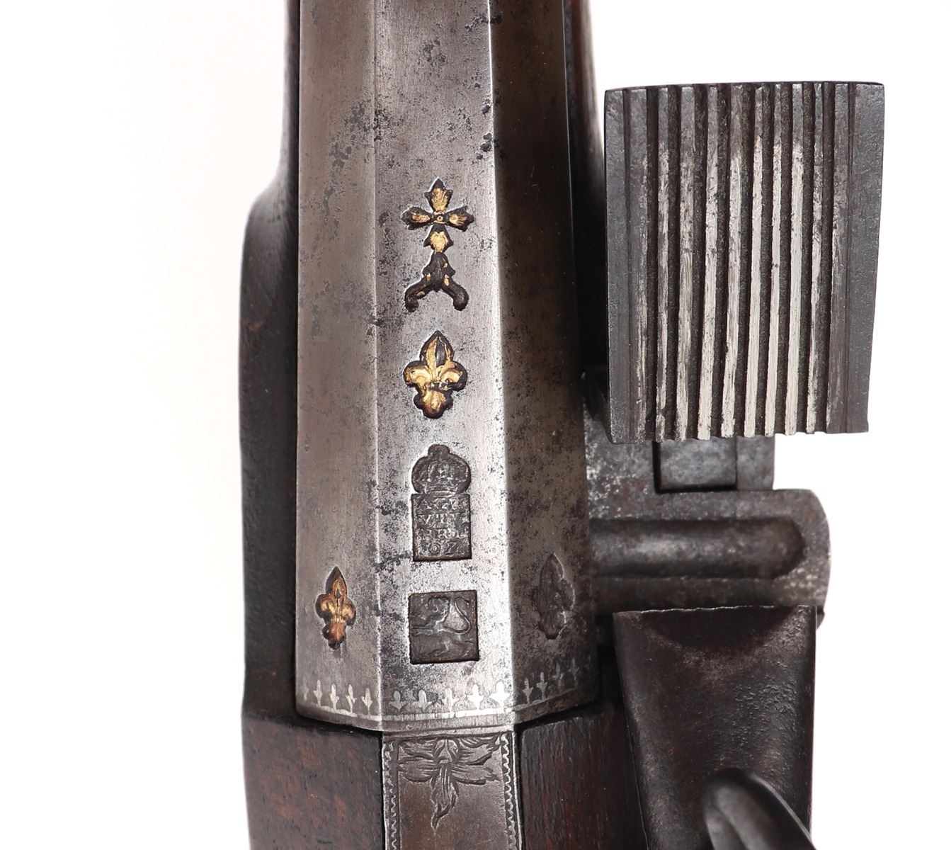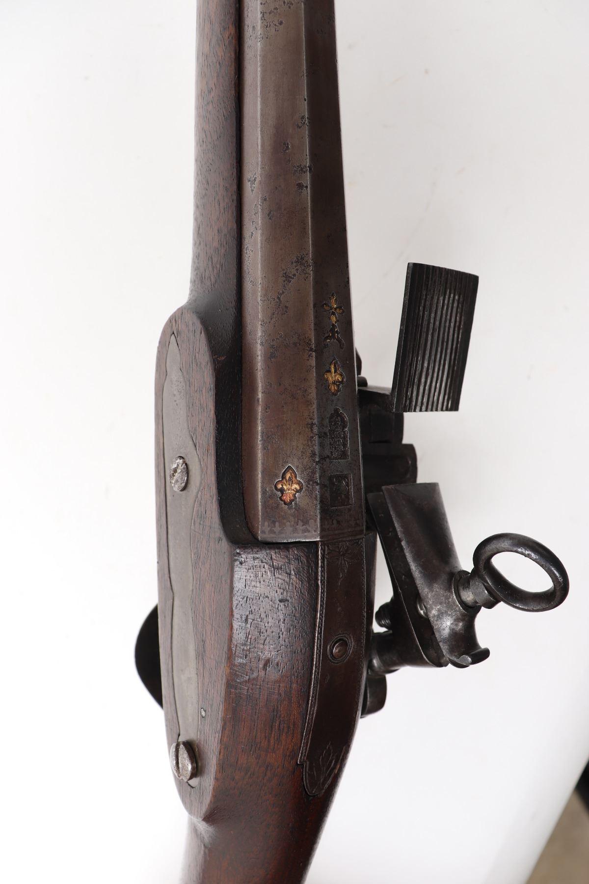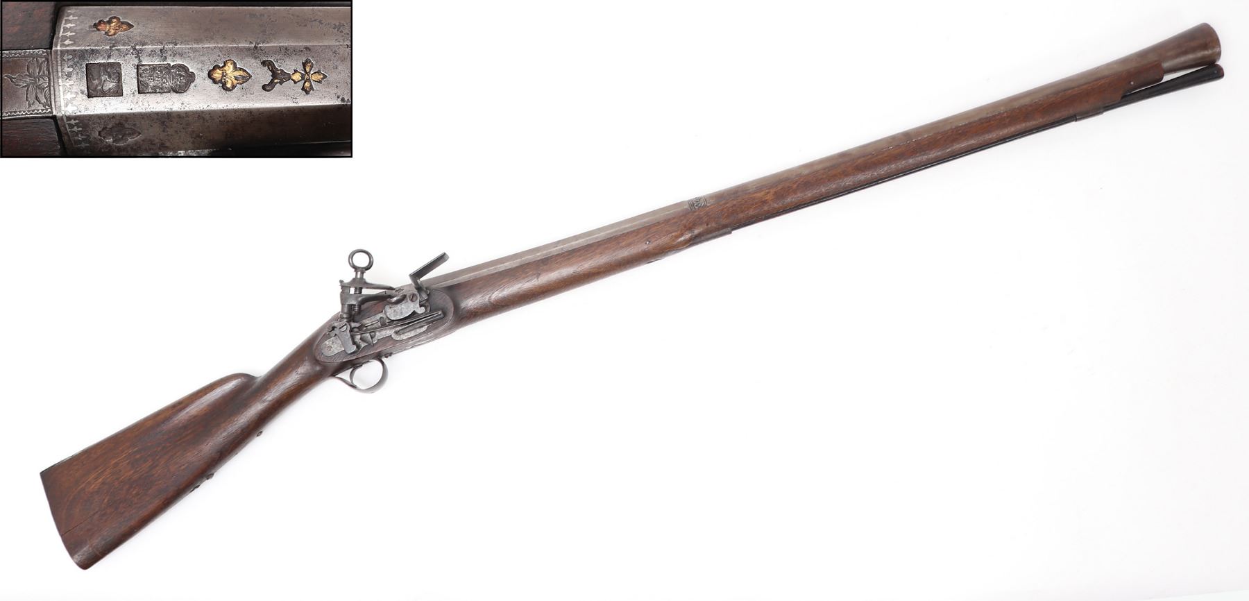 Iberian Peninsula, Spain, rare Spanish Trabuco military flintlock rifle 18th century. Heavy Iron chiseled lock with massive Frizzen, pan, and hammer in iron. Struck with a hammers mark to the lock plate reading "LA, SRI, ATE, CVI" under the Spanish crown. Fantastic original finish browned barrel with engraved tang. Octagonal to round with transitional chiseled and gilt band. Flared blunderbuss muzzle 1.5" opening. Inlaid with three gold fleur de lis, the Spanish cross, and silver inlaid series of fleur de lis to the base of the barrel. Two makers marks including a lower example of the rampant lion. Above a hallmark reading "AGN, YTV, RRL, OZ" under the Spanish Crown. Trigger guard frame also hallmarked and gilt "AL, BER, DT" under the crown. Walnut stock in original condition. Excellent working condition. Size 48 1/4" L, barrel 33 1/4" L. Condition: Very good untouched original condition, original ramrod.. Provenance: Ex-Private USA Collection