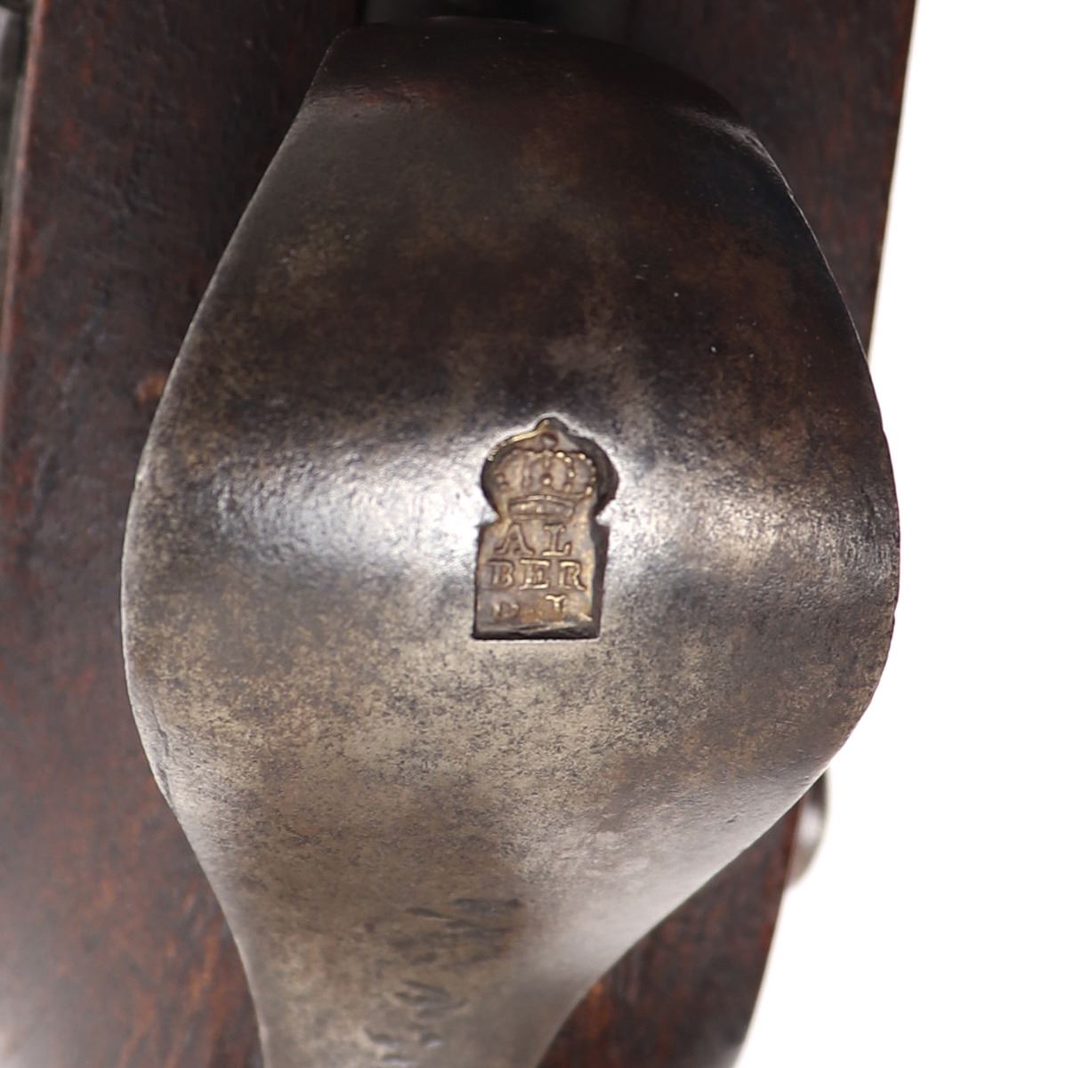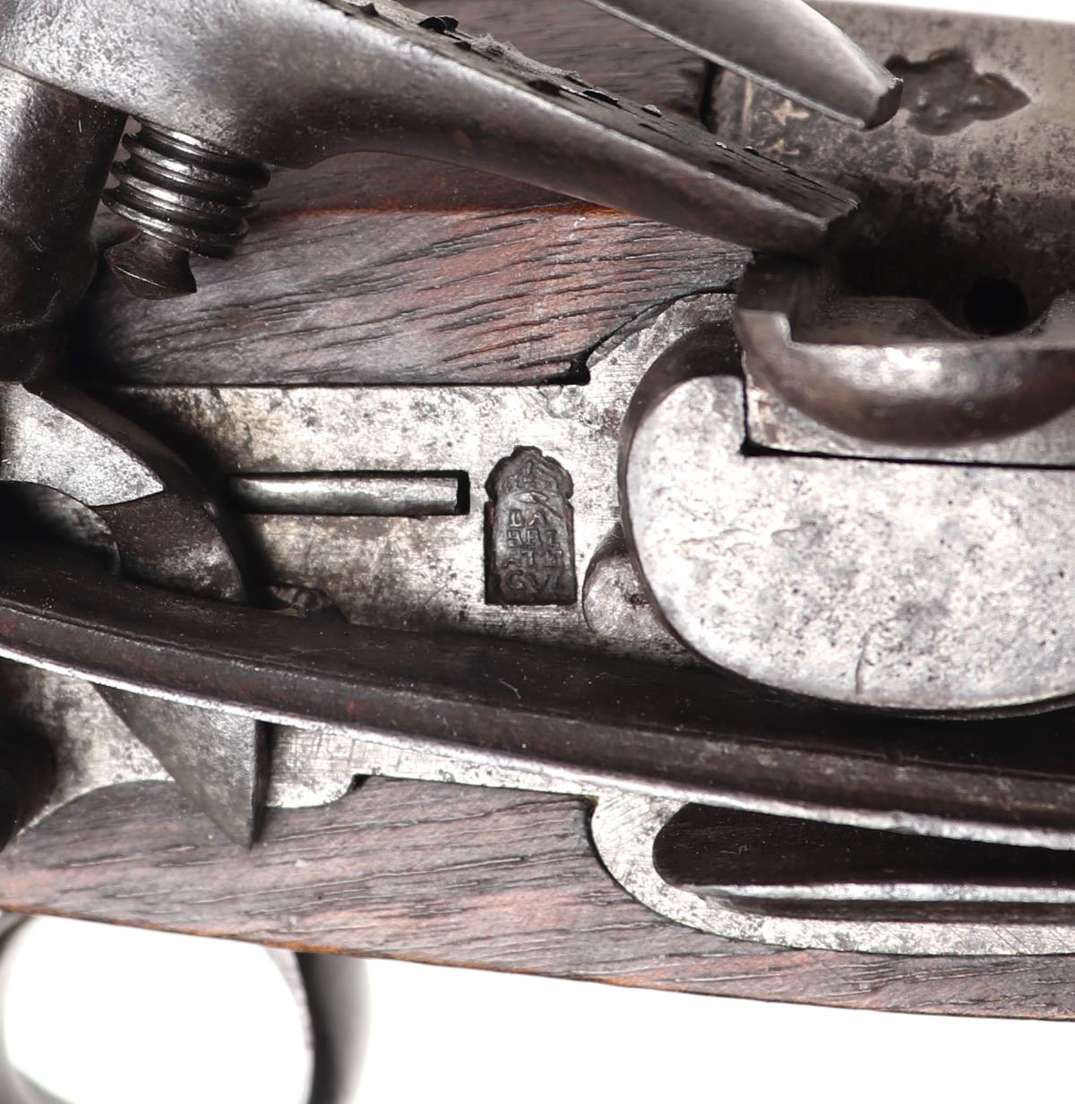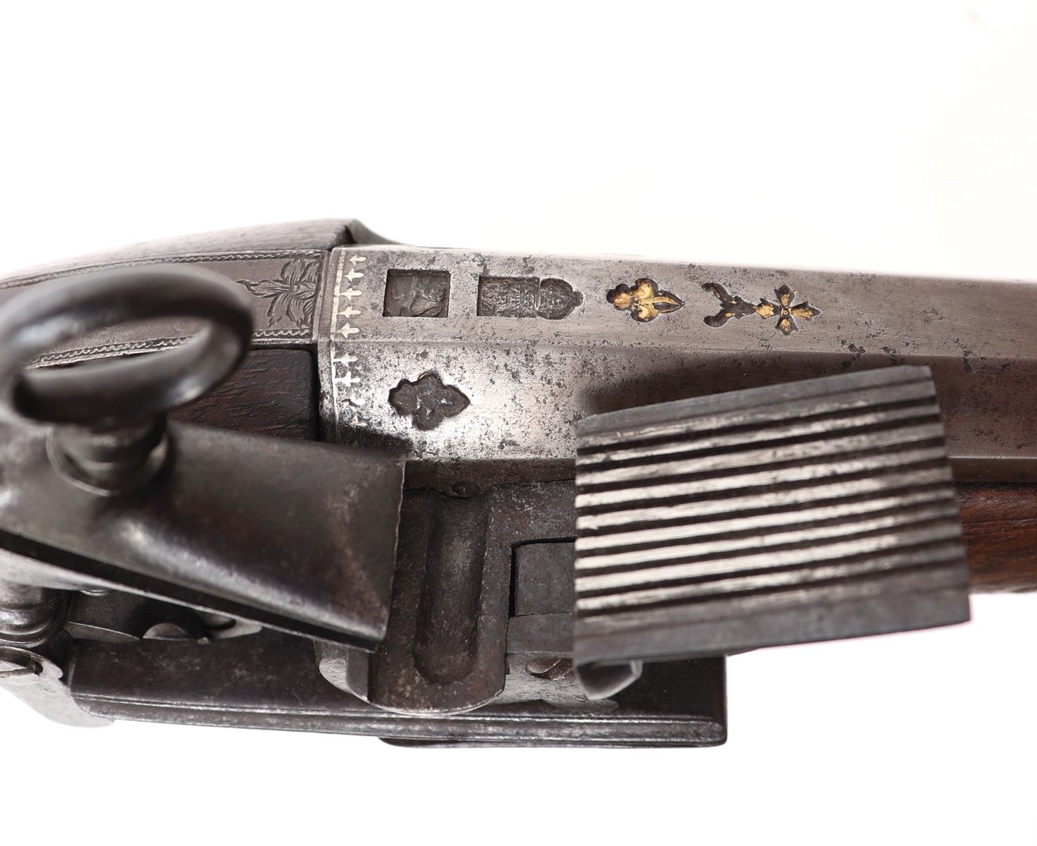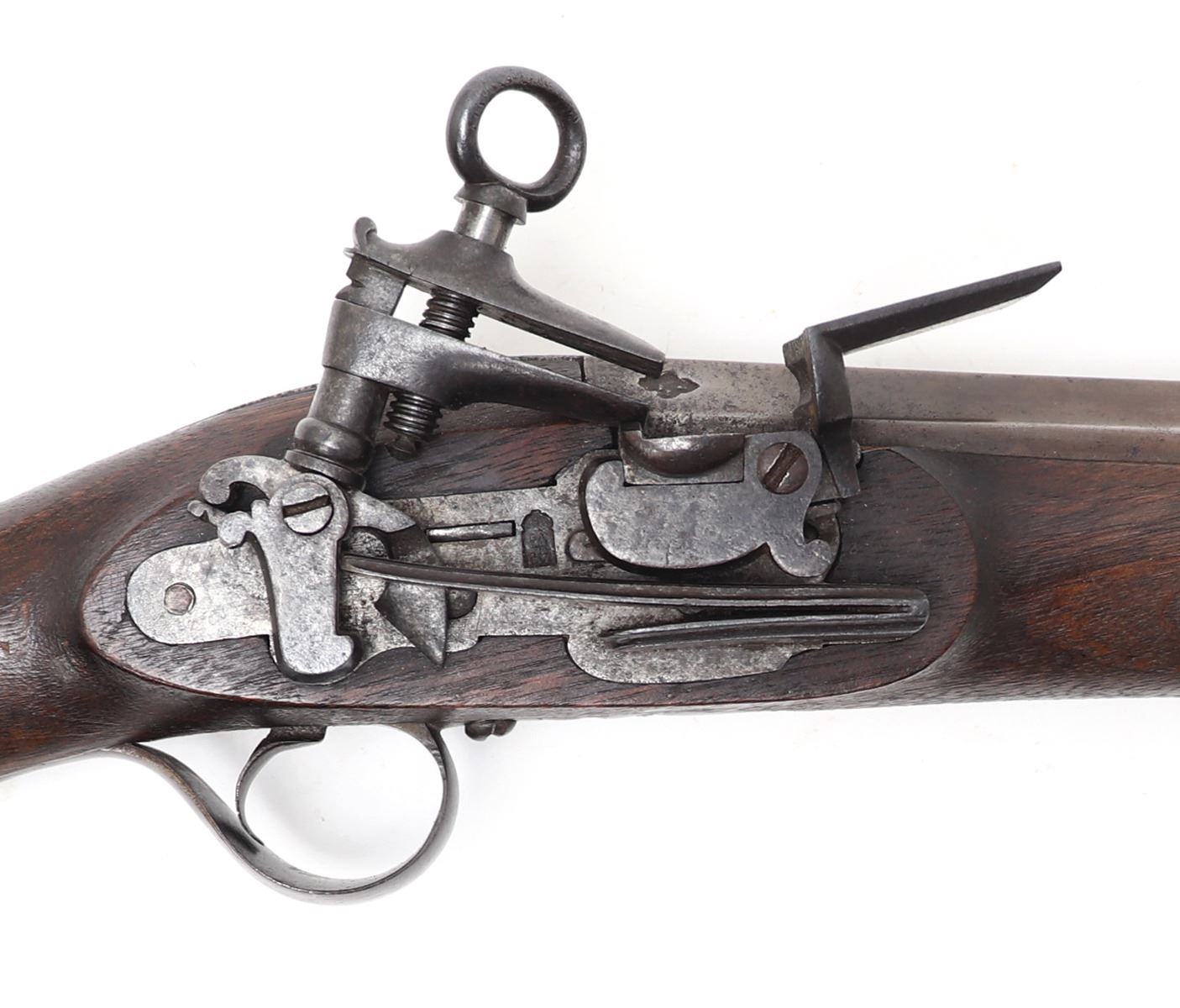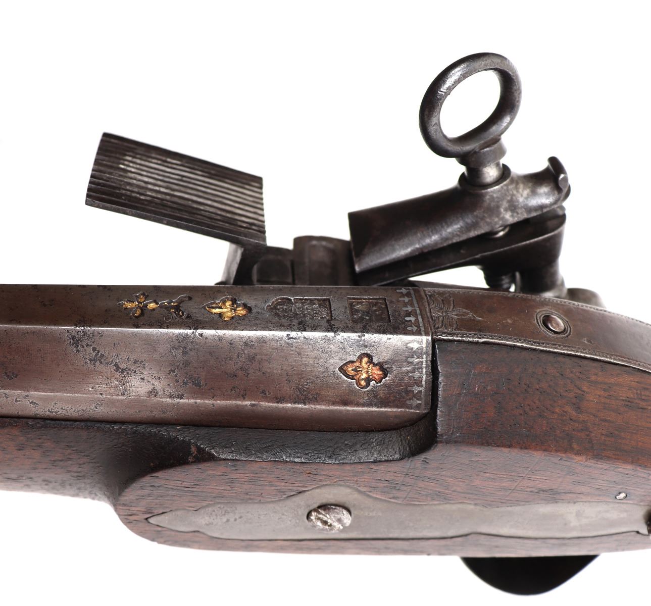 Iberian Peninsula, Spain, rare Spanish Trabuco military flintlock rifle 18th century. Heavy Iron chiseled lock with massive Frizzen, pan, and hammer in iron. Struck with a hammers mark to the lock plate reading "LA, SRI, ATE, CVI" under the Spanish crown. Fantastic original finish browned barrel with engraved tang. Octagonal to round with transitional chiseled and gilt band. Flared blunderbuss muzzle 1.5" opening. Inlaid with three gold fleur de lis, the Spanish cross, and silver inlaid series of fleur de lis to the base of the barrel. Two makers marks including a lower example of the rampant lion. Above a hallmark reading "AGN, YTV, RRL, OZ" under the Spanish Crown. Trigger guard frame also hallmarked and gilt "AL, BER, DT" under the crown. Walnut stock in original condition. Excellent working condition. Size 48 1/4" L, barrel 33 1/4" L. Condition: Very good untouched original condition, original ramrod.. Provenance: Ex-Private USA Collection