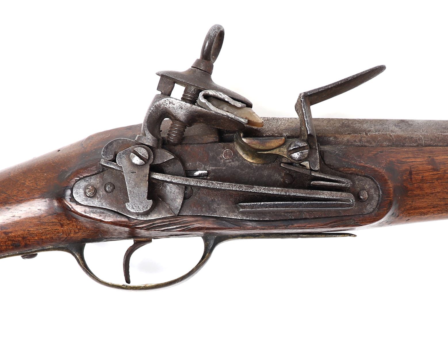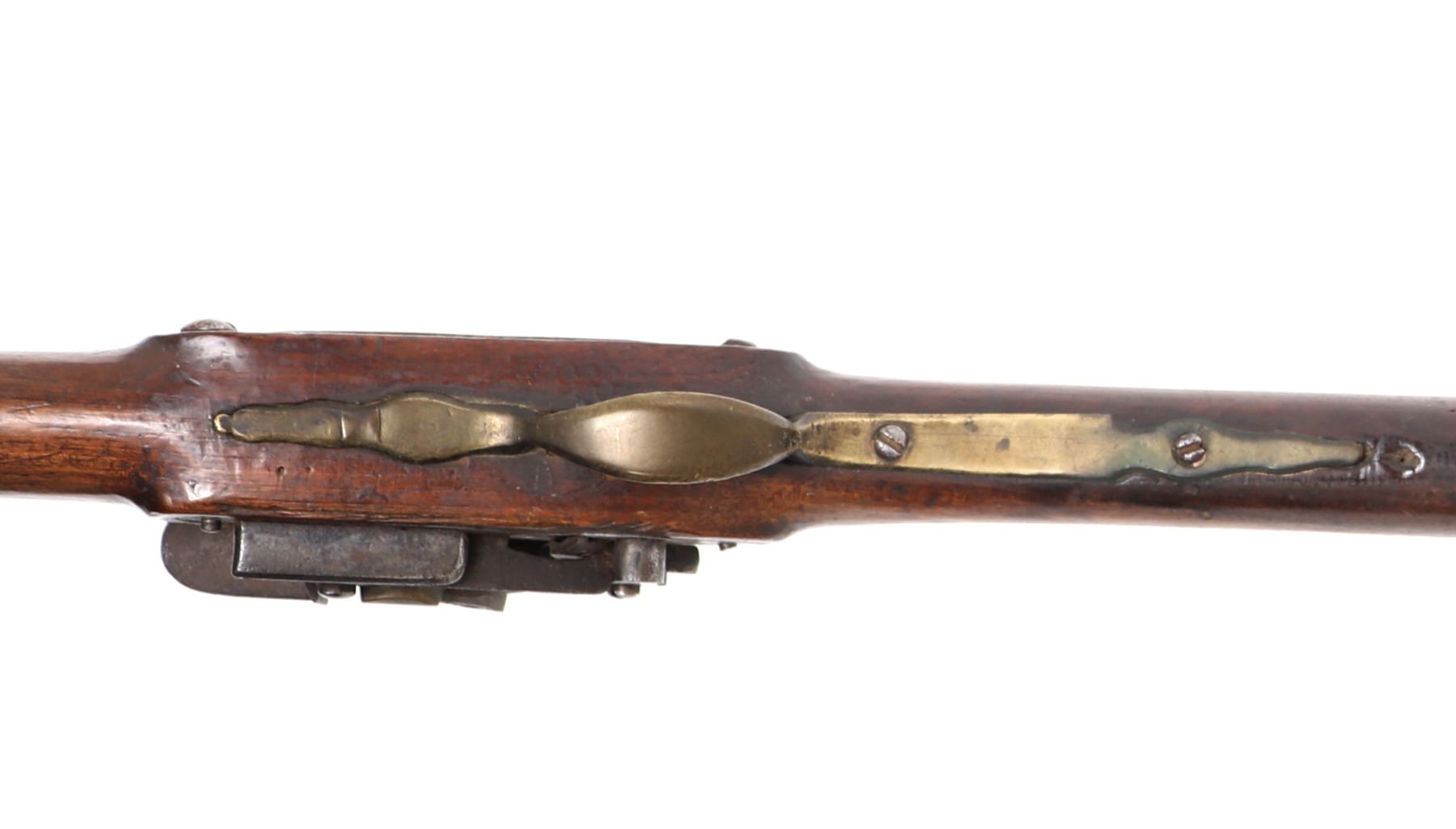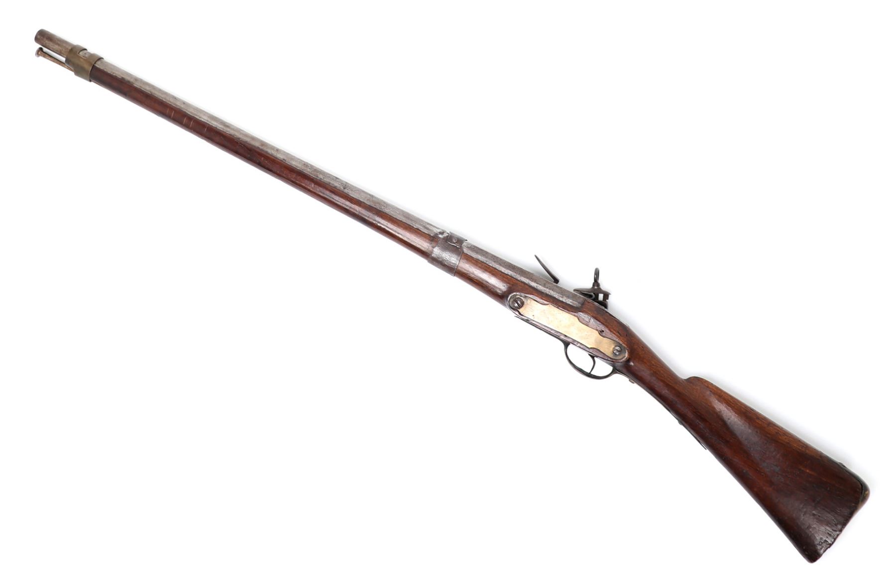 Spanish Military flintlock rifle, 18th century. Heavy rifle with a silver side plate. Miquelet flintlock firing mechanism with brass pan and characteristic wide Spanish frizzen. Brass trigger guard. Octagonal to round barrel. Large bore. Size 46 3/4" L, barrel 31 1/2" L. Provenance: Ex-Southwest Arms and Armour Collection