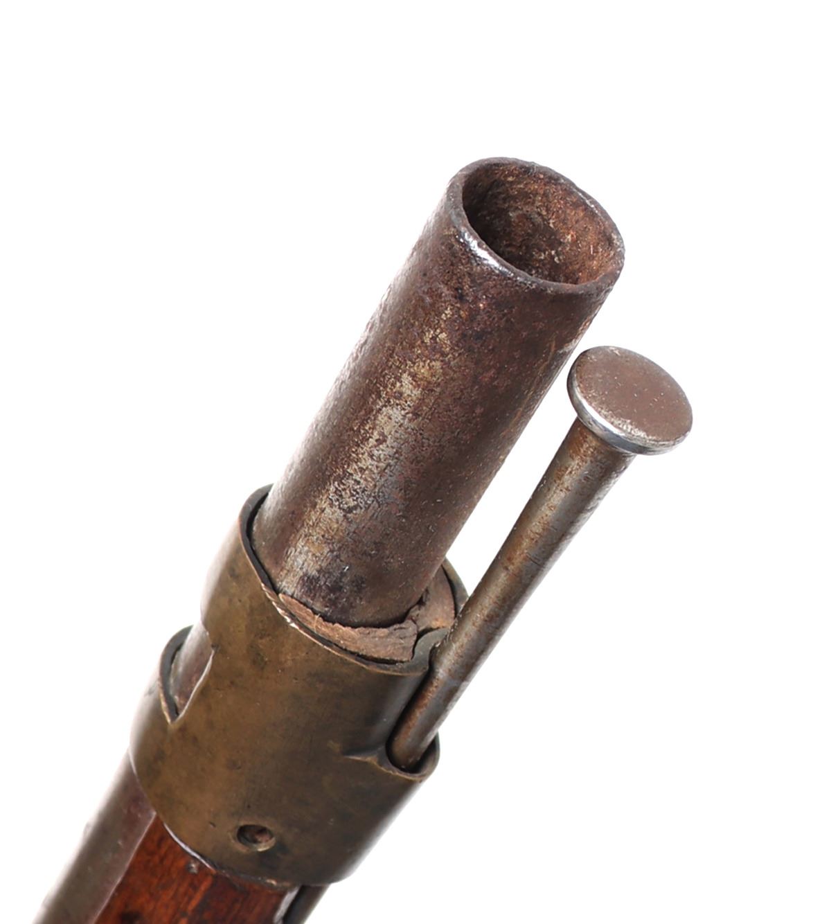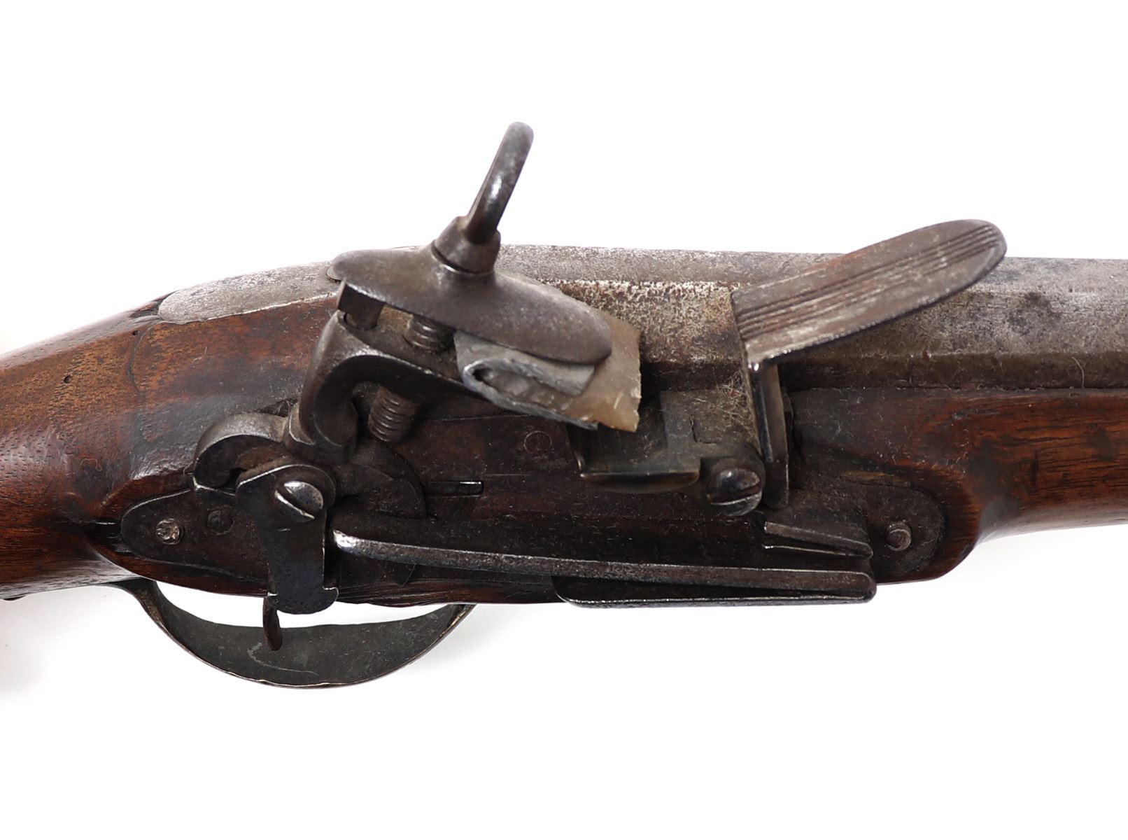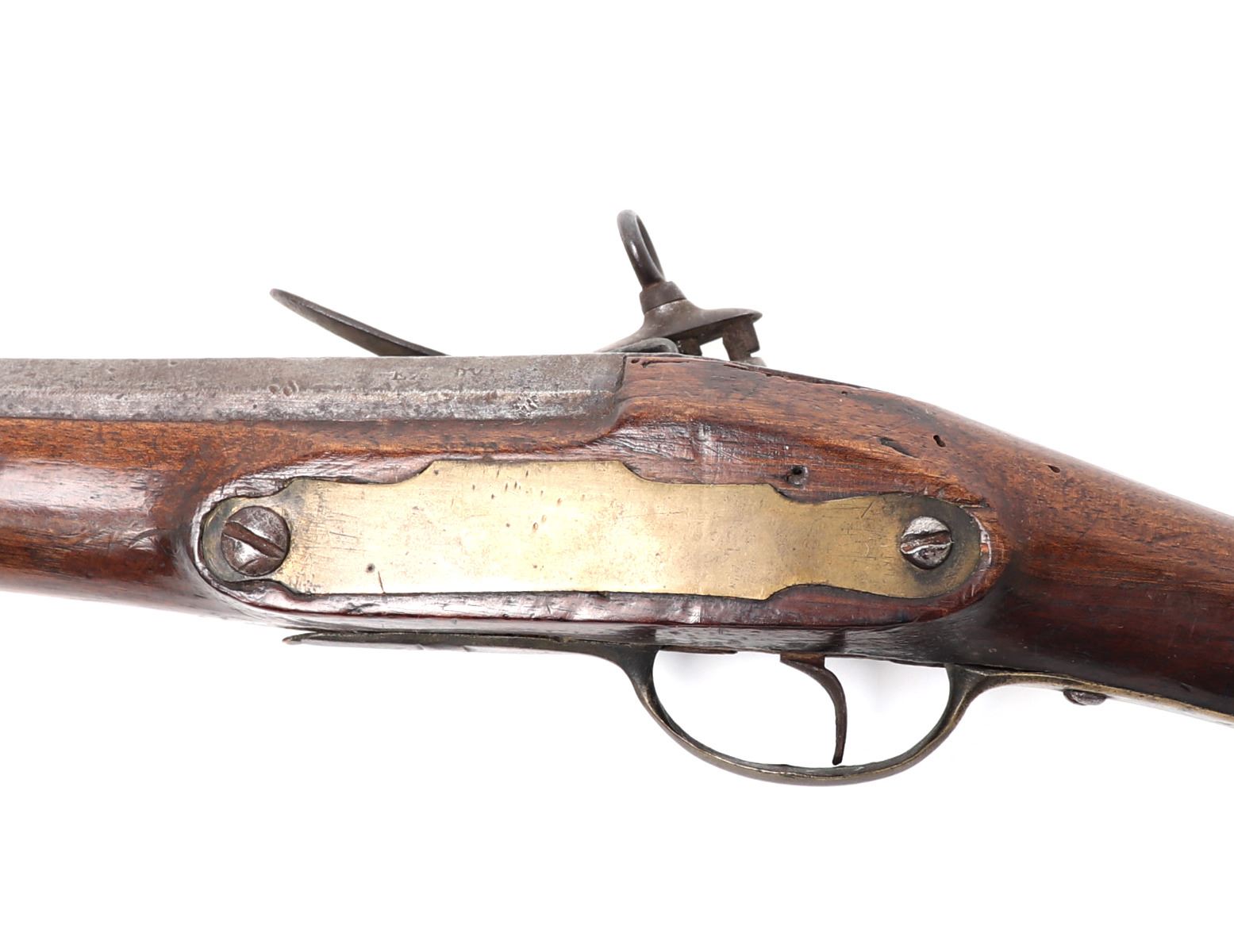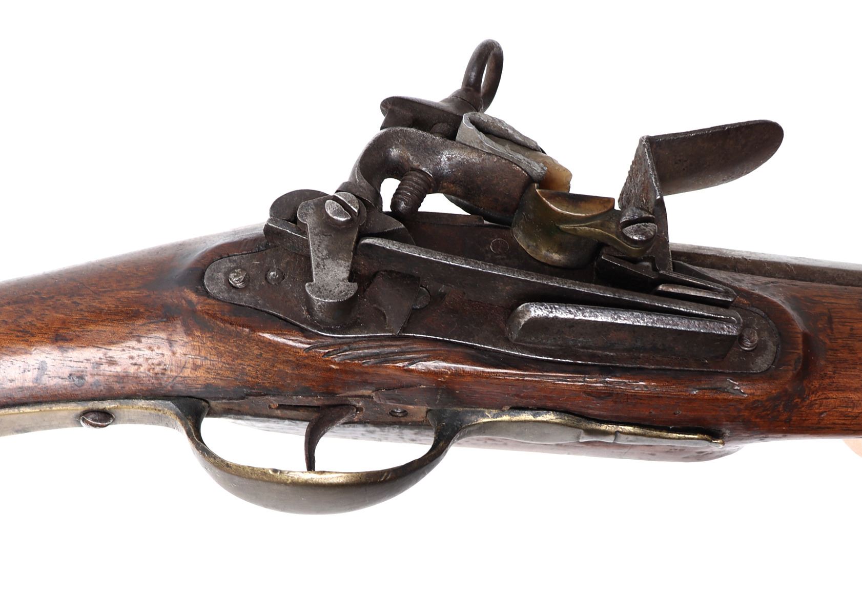 Spanish Military flintlock rifle, 18th century. Heavy rifle with a silver side plate. Miquelet flintlock firing mechanism with brass pan and characteristic wide Spanish frizzen. Brass trigger guard. Octagonal to round barrel. Large bore. Size 46 3/4" L, barrel 31 1/2" L. Provenance: Ex-Southwest Arms and Armour Collection
