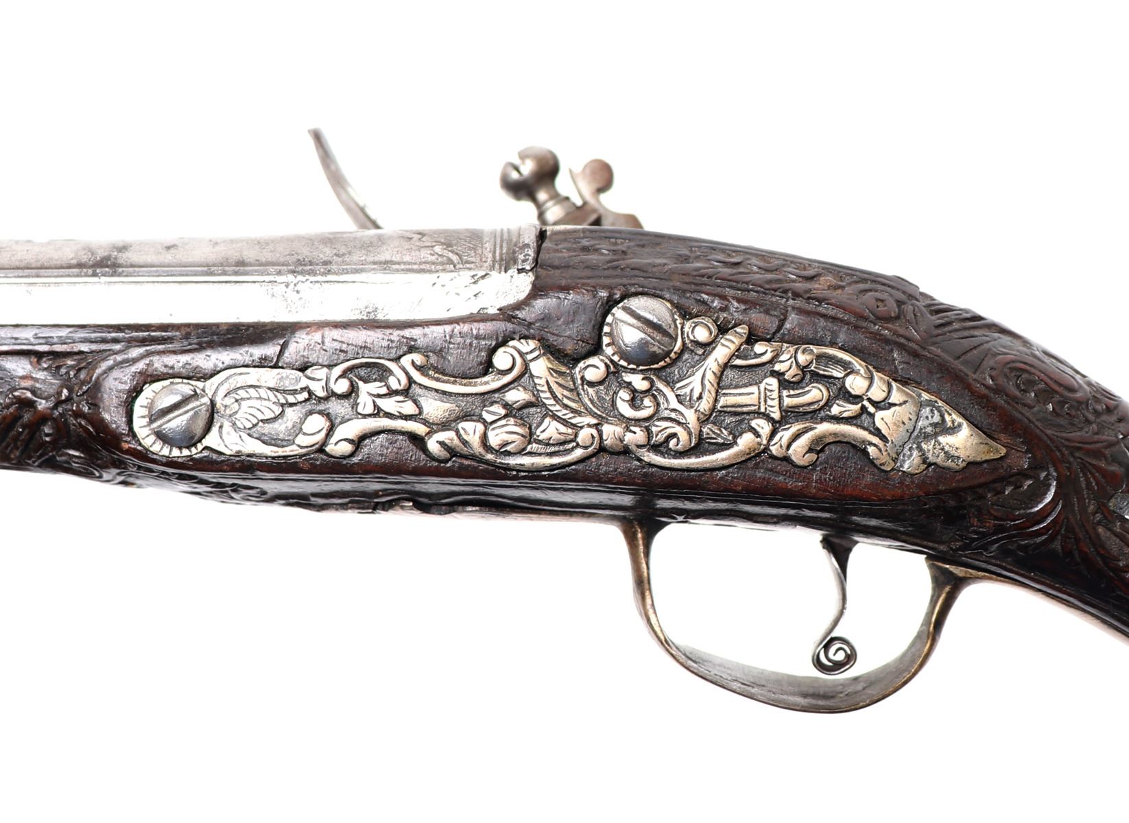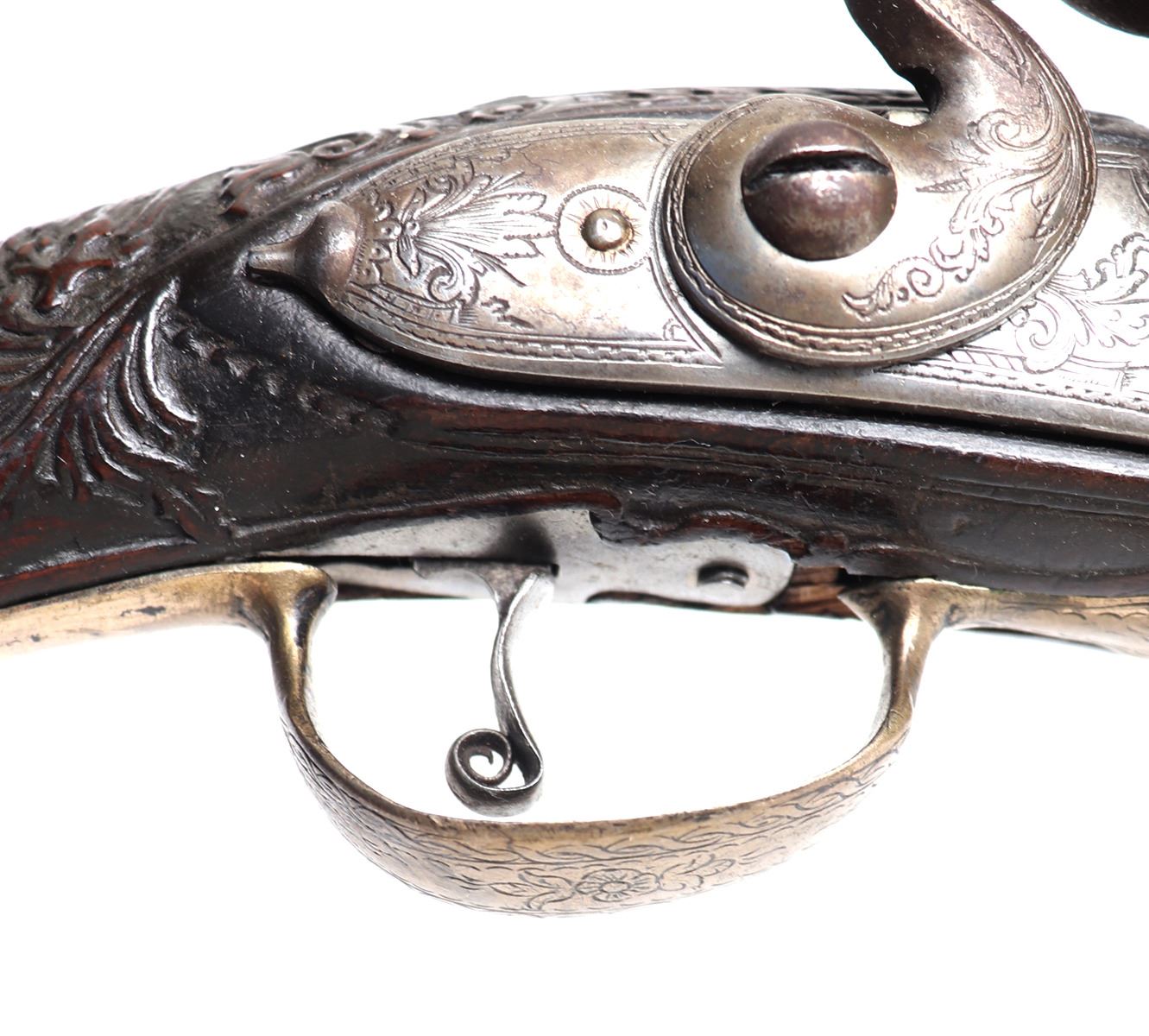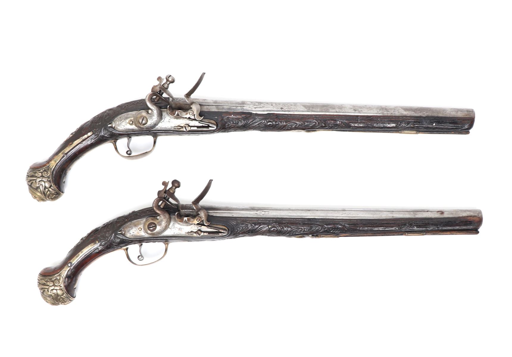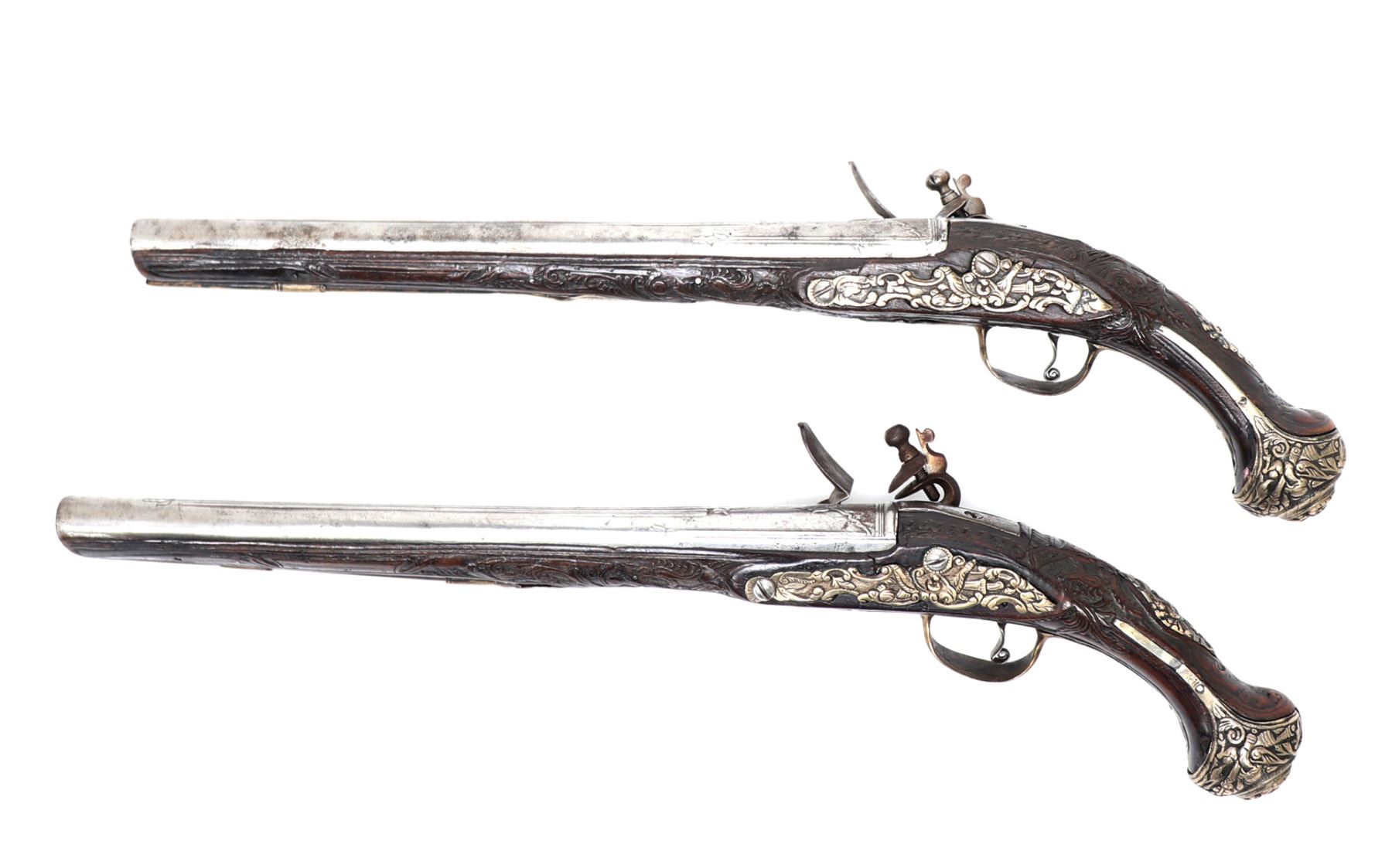 Late 18th century heavy and well carved pair or brace of cavalry pistols for the markets of eastern Europe, Greece and Italy. Each stock of dark wood ornatly carved with highly detailed images of scrolling and floral patterns. Silver cast panels throughout inlaid with motifs of panoply of arms among scrolling. Engraved flintlock lock plate and curlicue trigger. Large caliber bore barrels. Size 20" L, barrel 13 1/2" L. Provenance: Ex-USA Collection