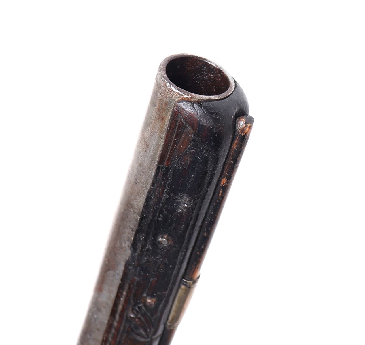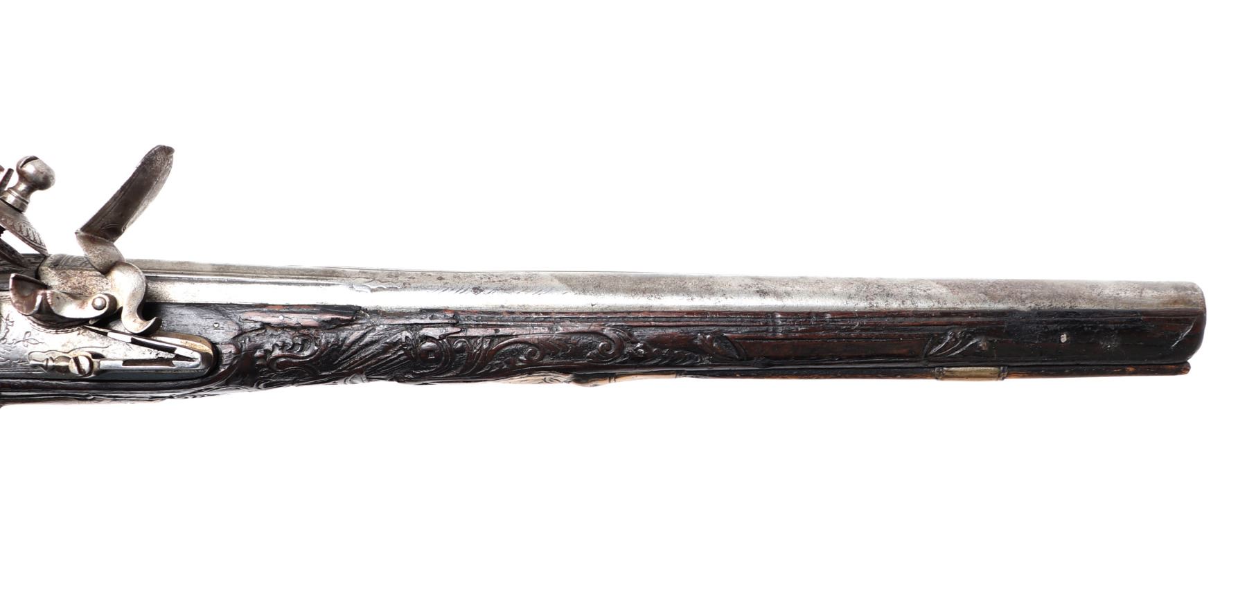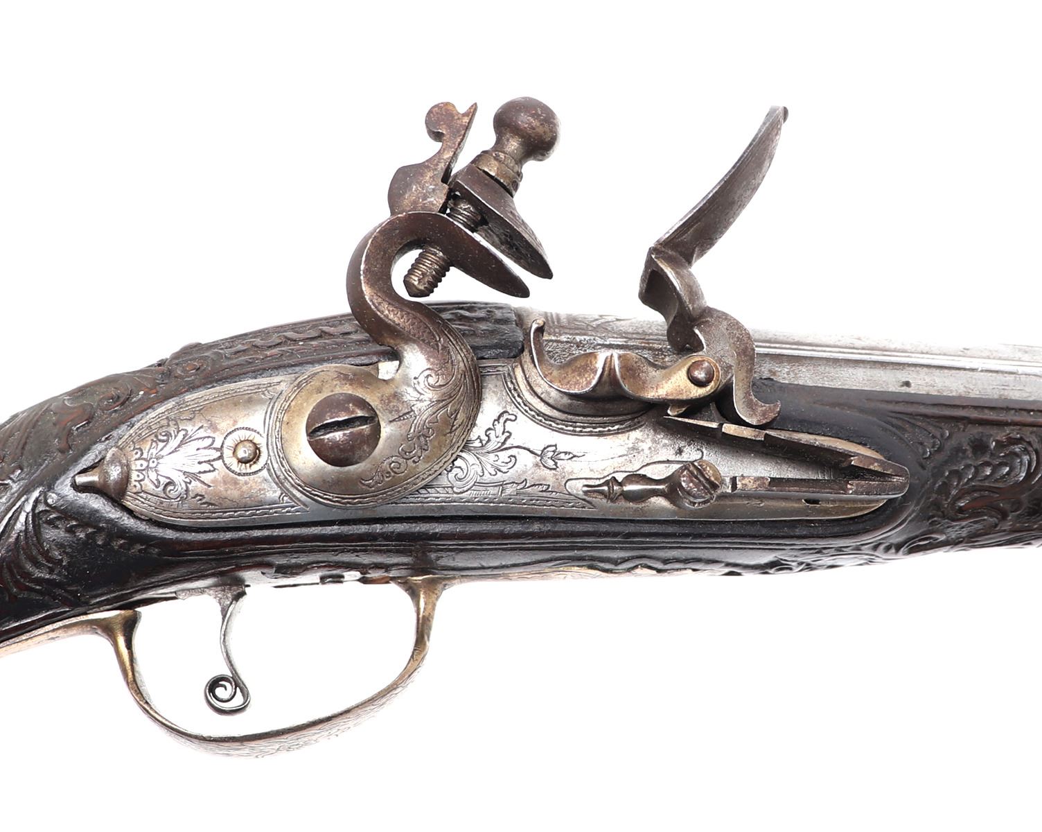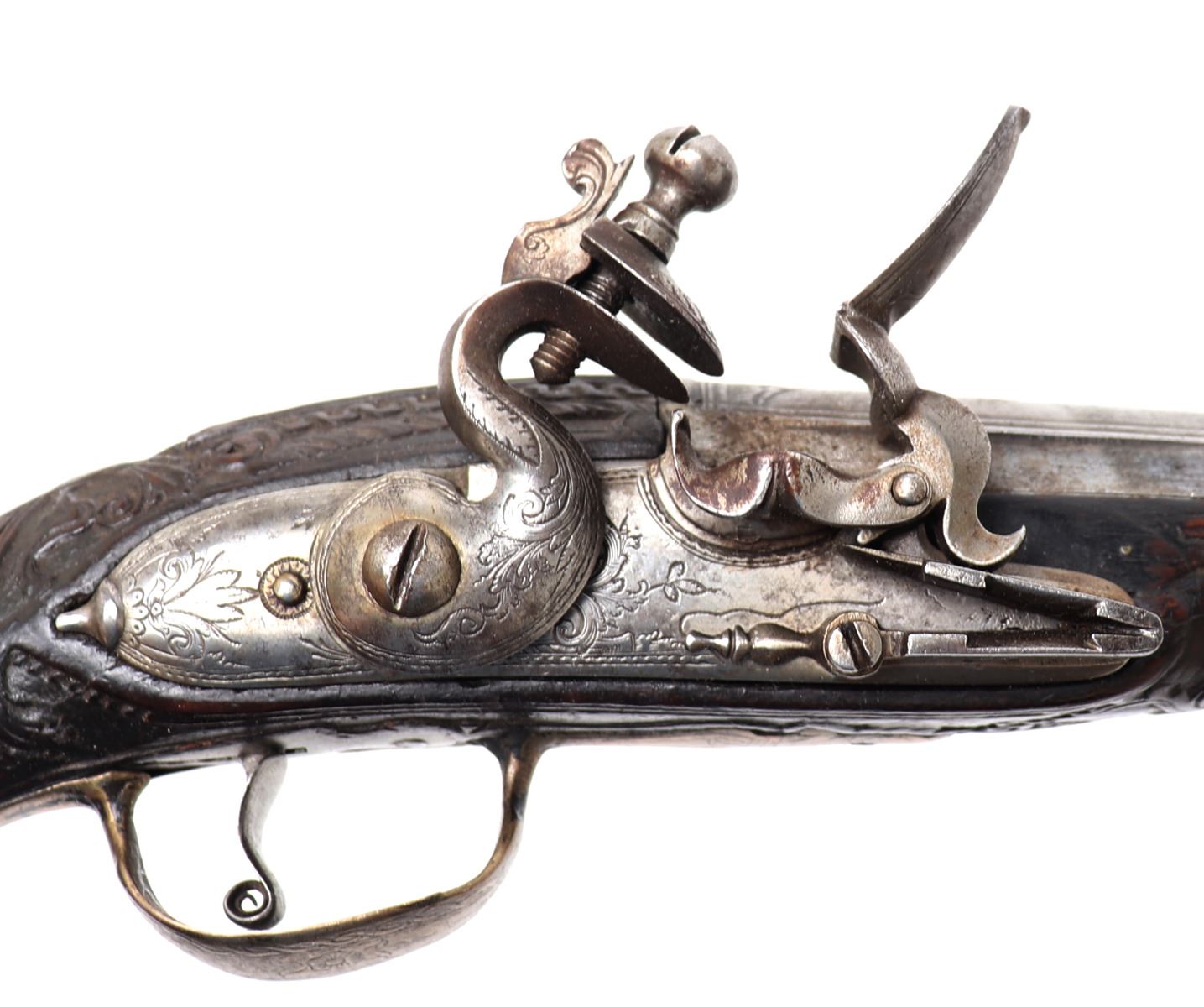 Late 18th century heavy and well carved pair or brace of cavalry pistols for the markets of eastern Europe, Greece and Italy. Each stock of dark wood ornatly carved with highly detailed images of scrolling and floral patterns. Silver cast panels throughout inlaid with motifs of panoply of arms among scrolling. Engraved flintlock lock plate and curlicue trigger. Large caliber bore barrels. Size 20" L, barrel 13 1/2" L. Provenance: Ex-USA Collection