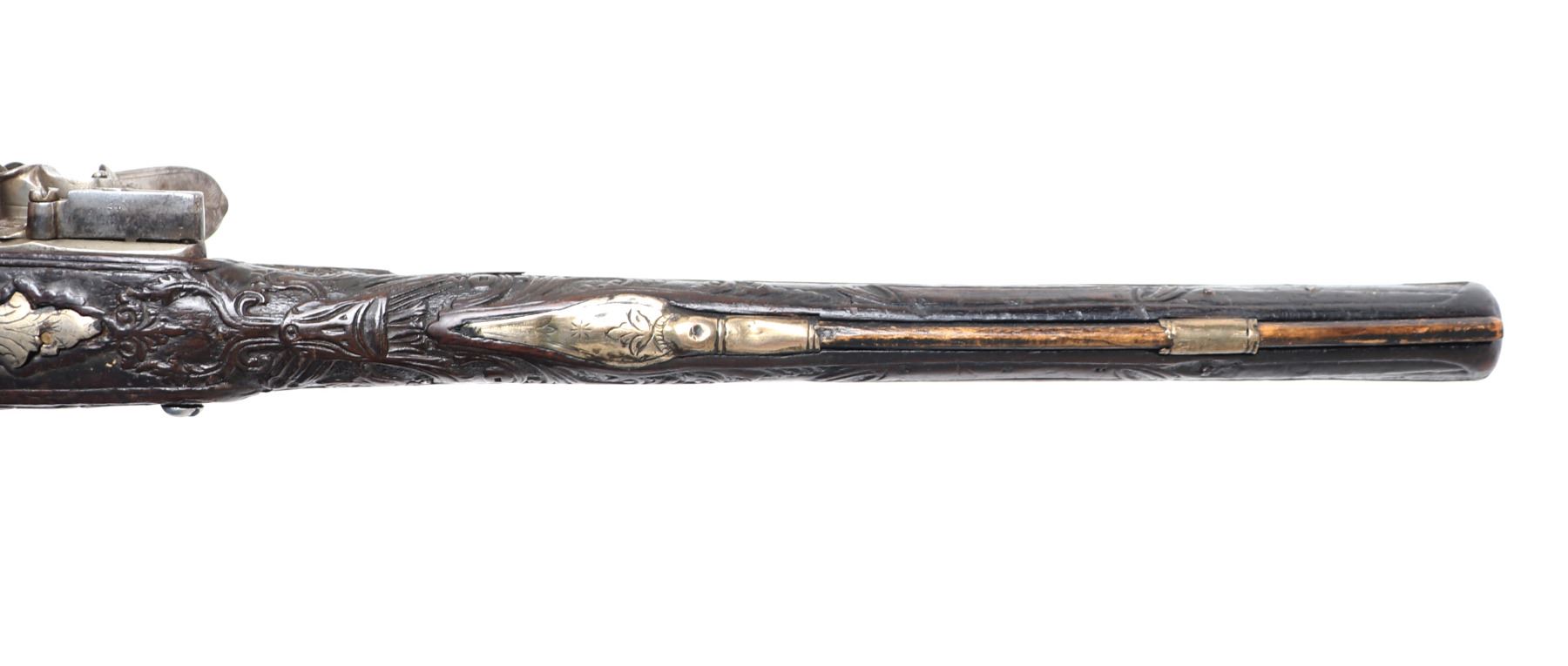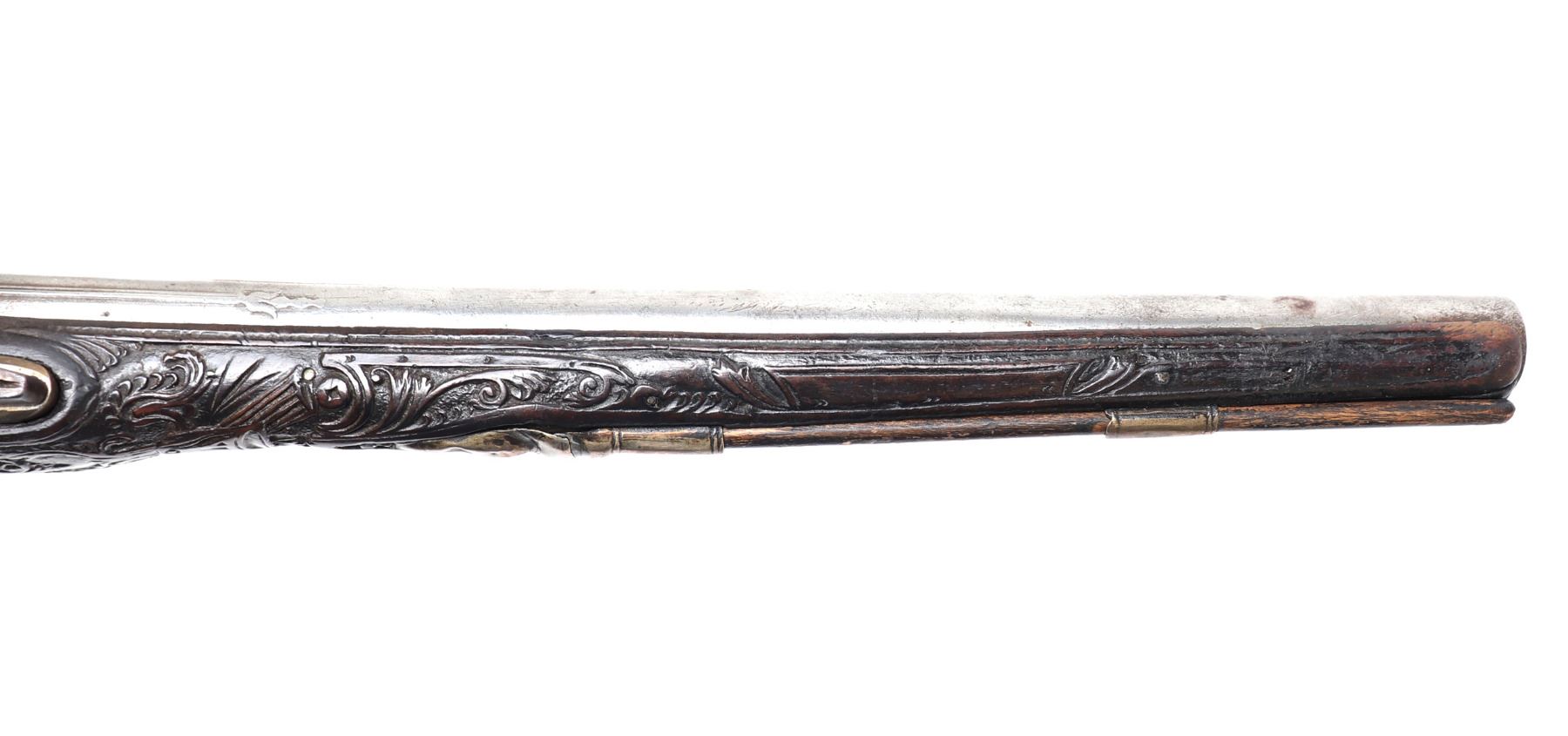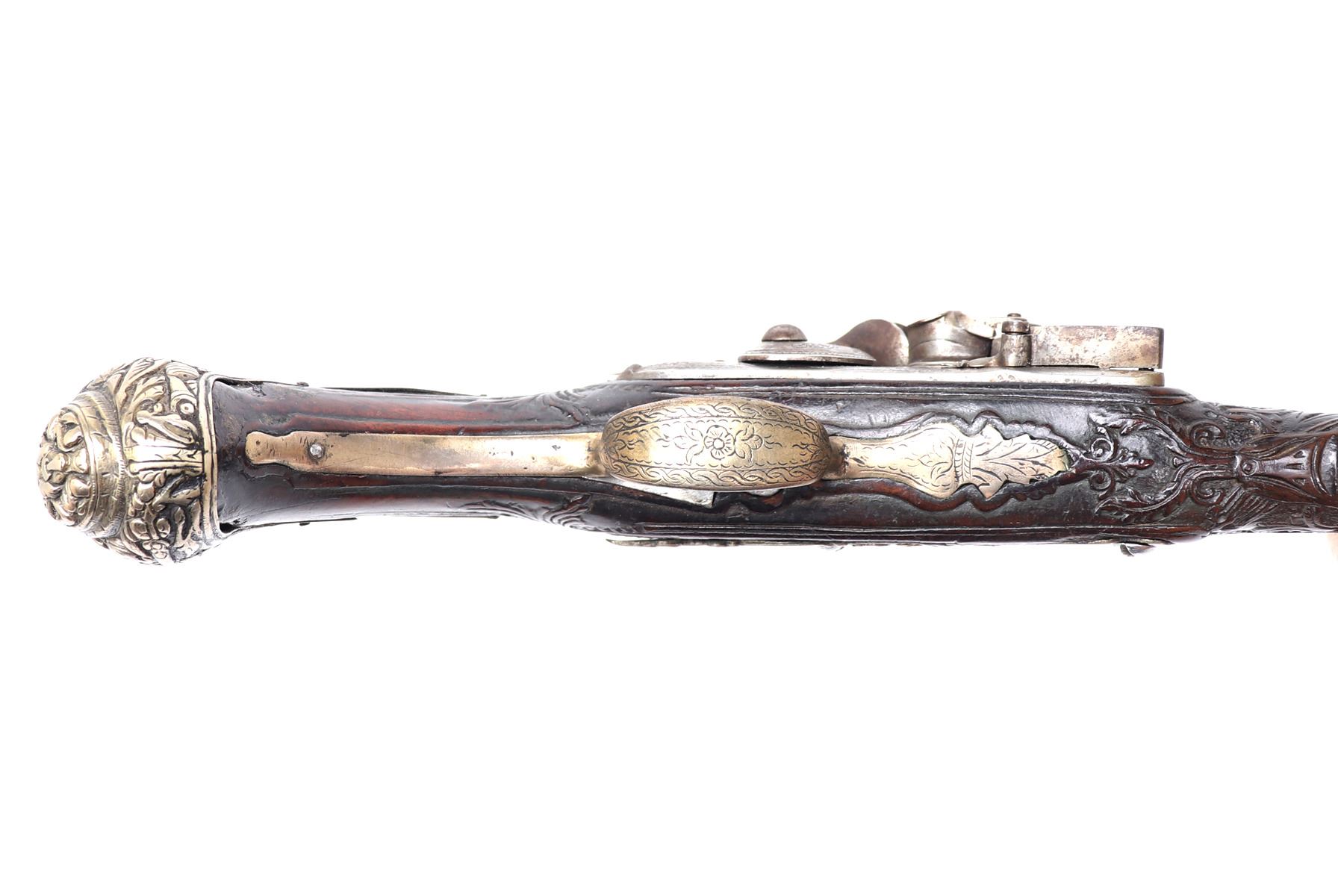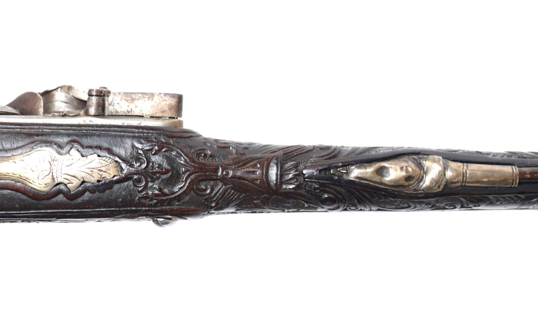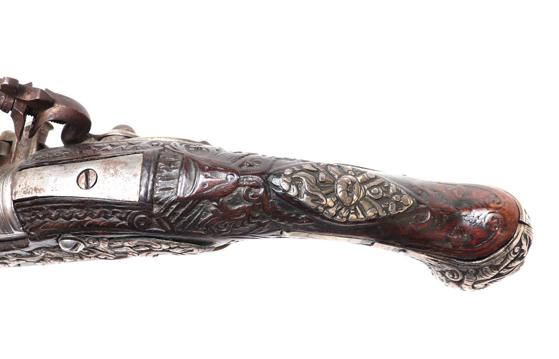 Lot 94 Brace of Ornate Silver & Carved Stock Cavalry Pistols, 18th c.