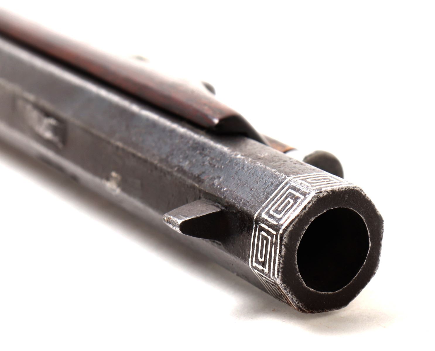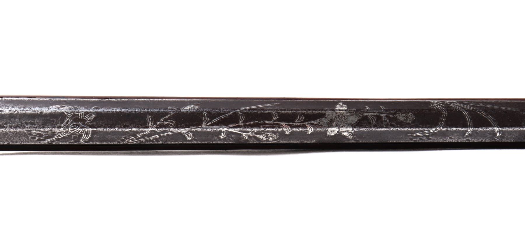 Antique Japanese Tanegashima matchlock rifle, 18th century with later restoration. Barrel original, octagonal and silver inlaid. Forward sight to barrel with silver inlaid key fret pattern to muzzle the remainder covered in large patterns of floral motifs and birds all in silver. Matchlock mechanism with rebuilt spring and hammer and original brass receiving tray to barrel. Stock in a fine brown wood inlaid with brass floral motifs and inlays. Size 50 1/2" L, barrel 34 1/4" L. Provenance: Ex-Southern California Collection