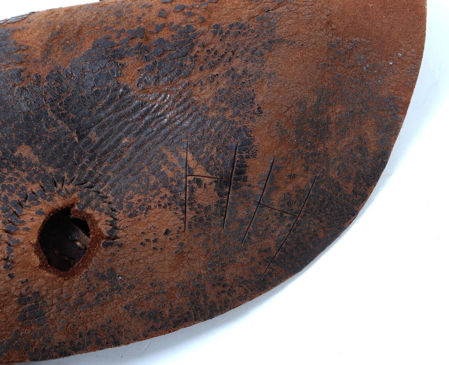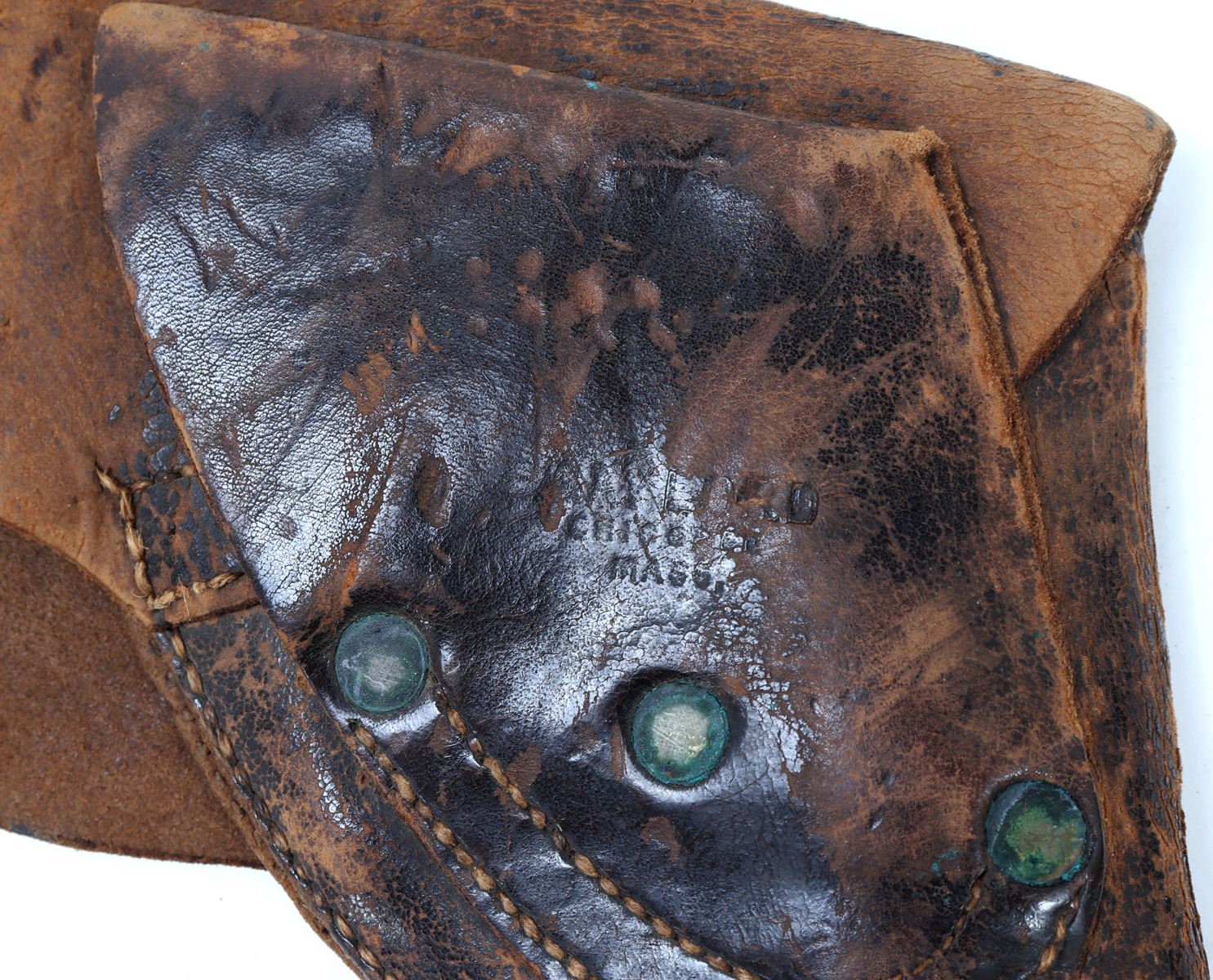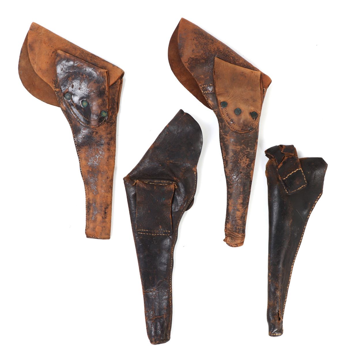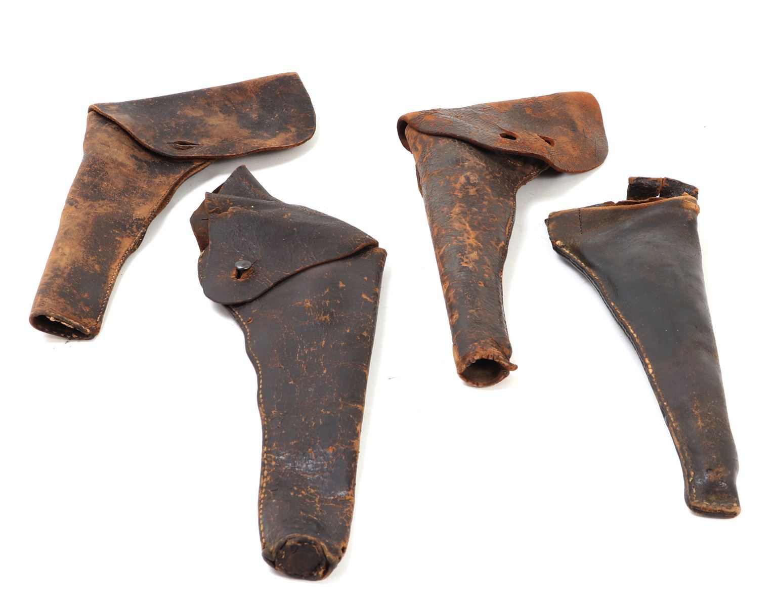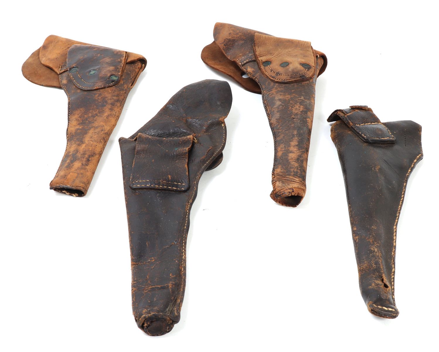 Group of four distinct pre-Civil War era holsters, craftsmanship of the mid-19th century or earlier. Each holster, made from leather and shows unique characteristics and wear consistent with age and historical use. Size 15 1/2" L. Provenance: Ex-Southern California Collection