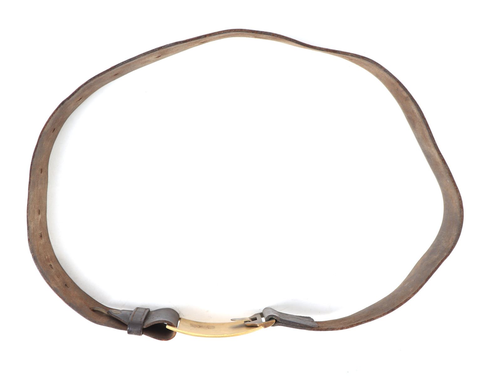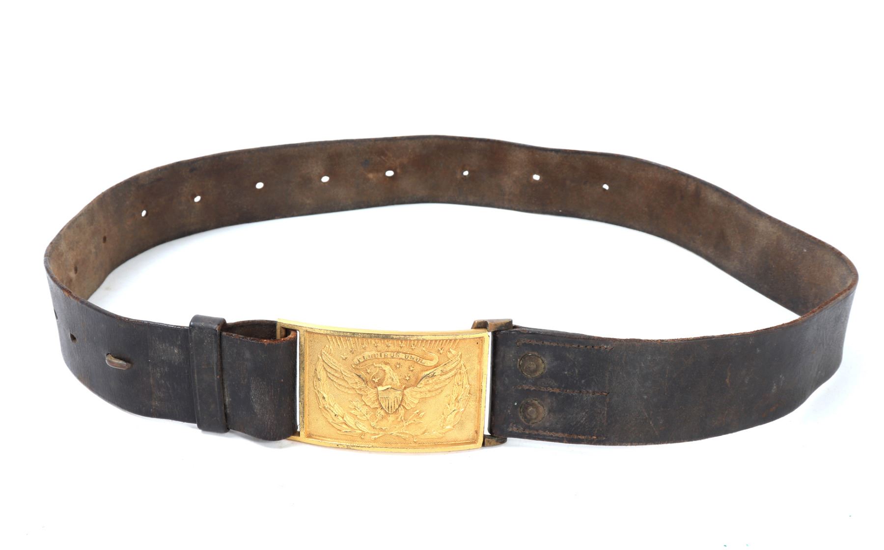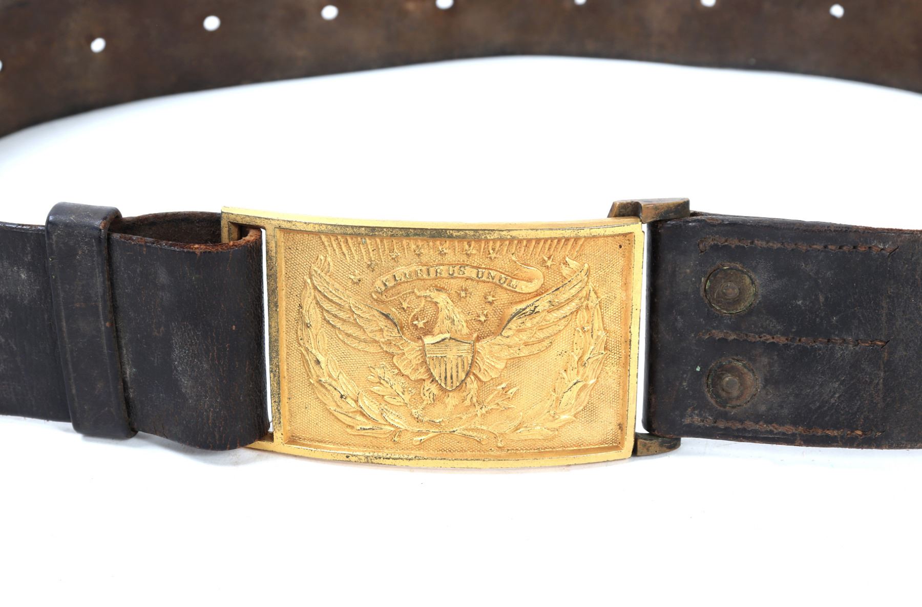 Finely crafted American Civil War belt with a gilt brass the buckle depicting the iconic American eagle motif surrounded by laurel wreaths and reading E Pluribus Unum above. Size 40 1/2" L, Buckle 3" W. Provenance: Ex-Southern California Collection