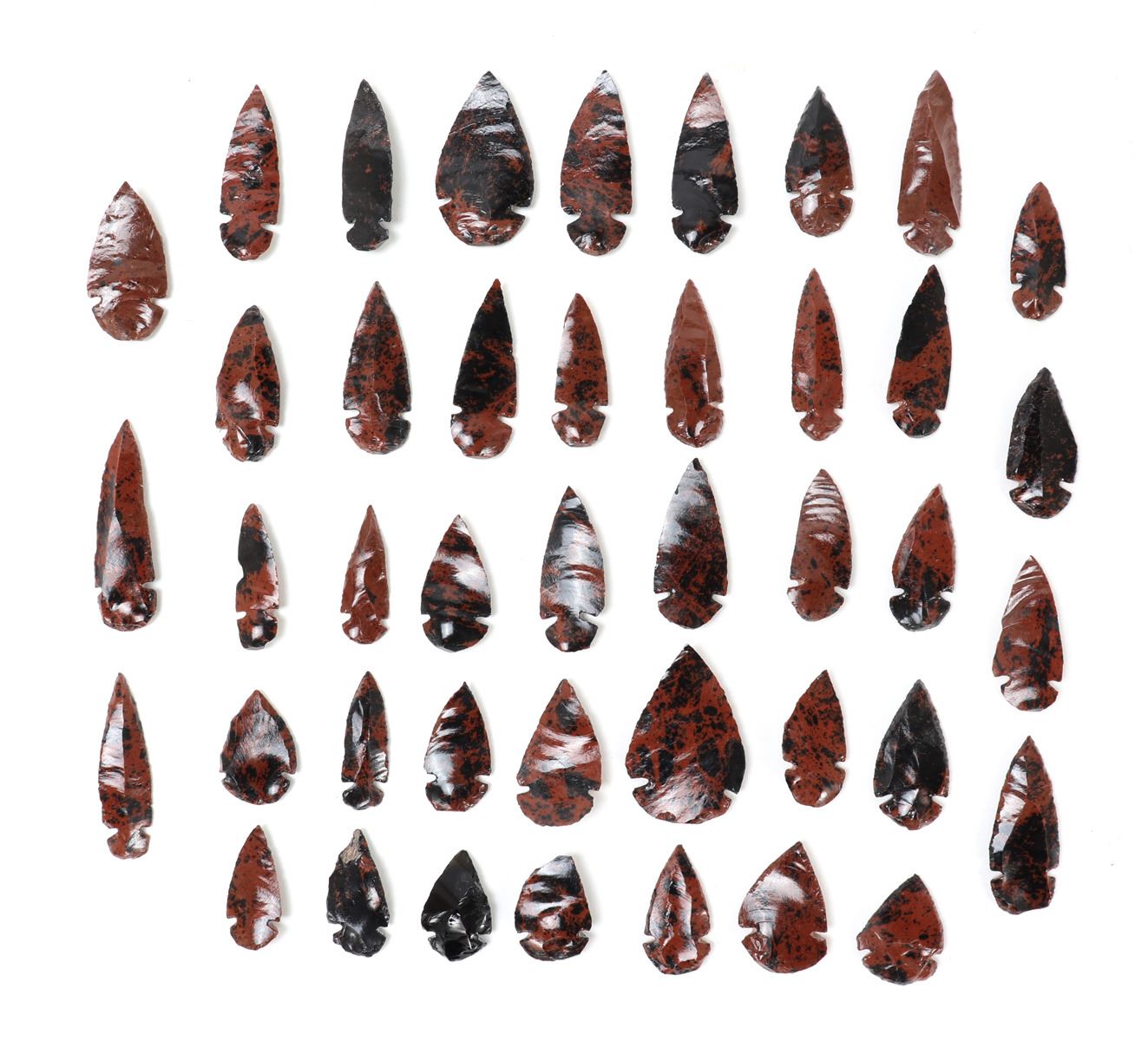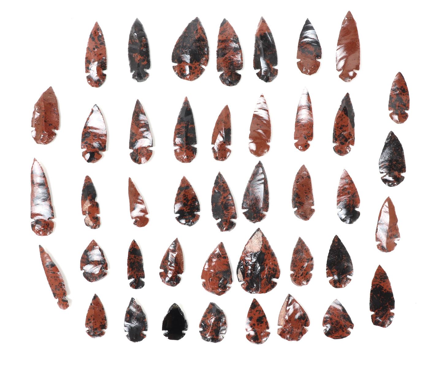 Fine collection of arrowheads comprised of naturally mixed red jasper and obsidian stone. All forty-two pieces are classicly shaped with a knotched base for securing to the shaft of the arrow with a deadly point. Size 2 5/8" L, total weight 12 g, case measures 15 3/4" L x 11 7/8" W x 1" H. Condition: Well preserved overall condition.
