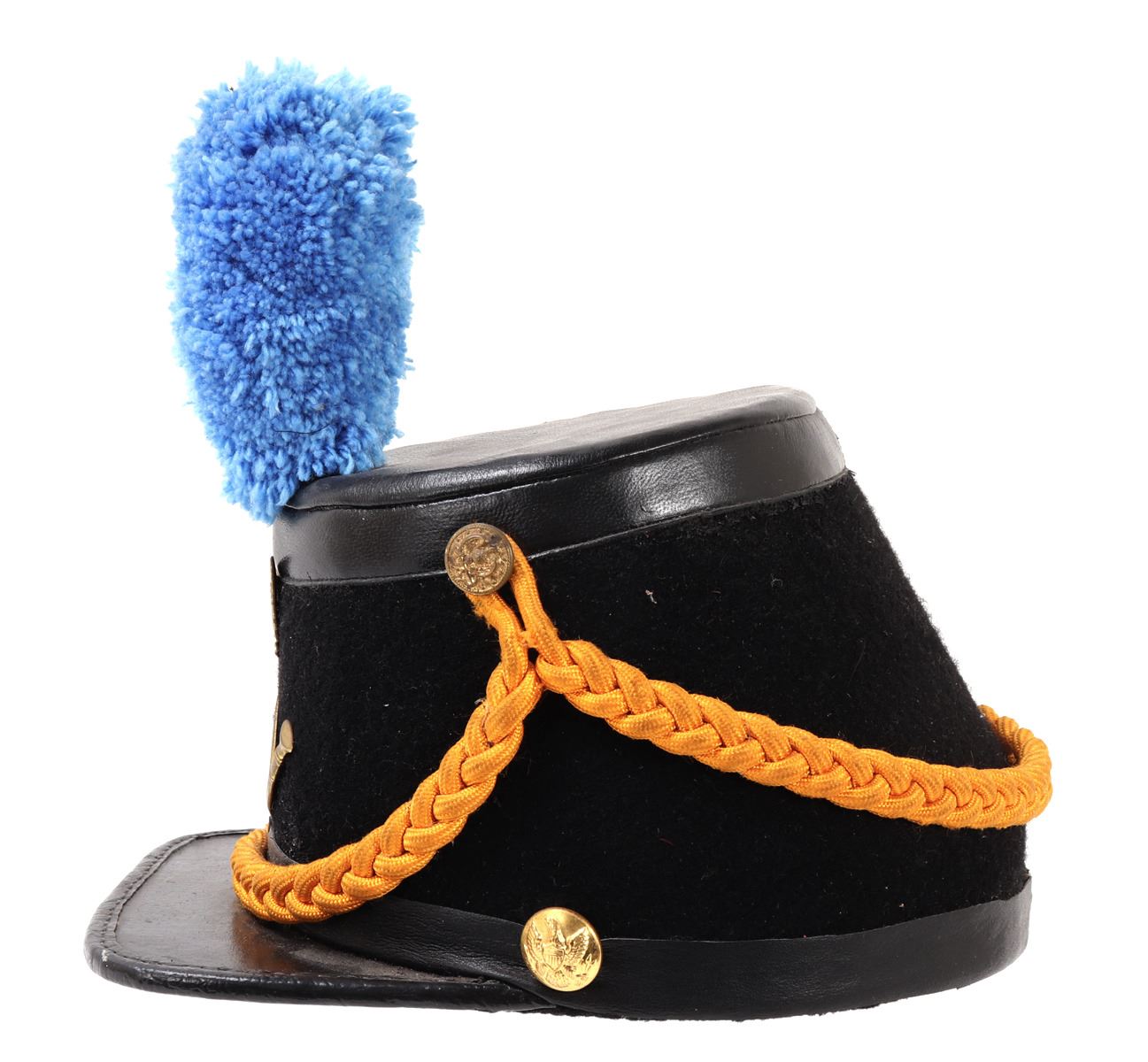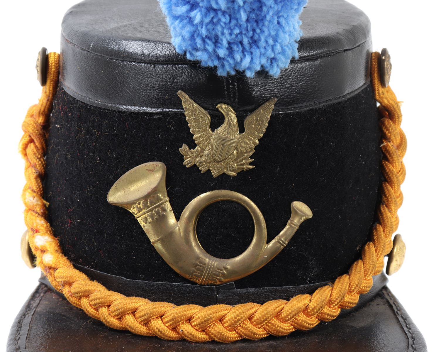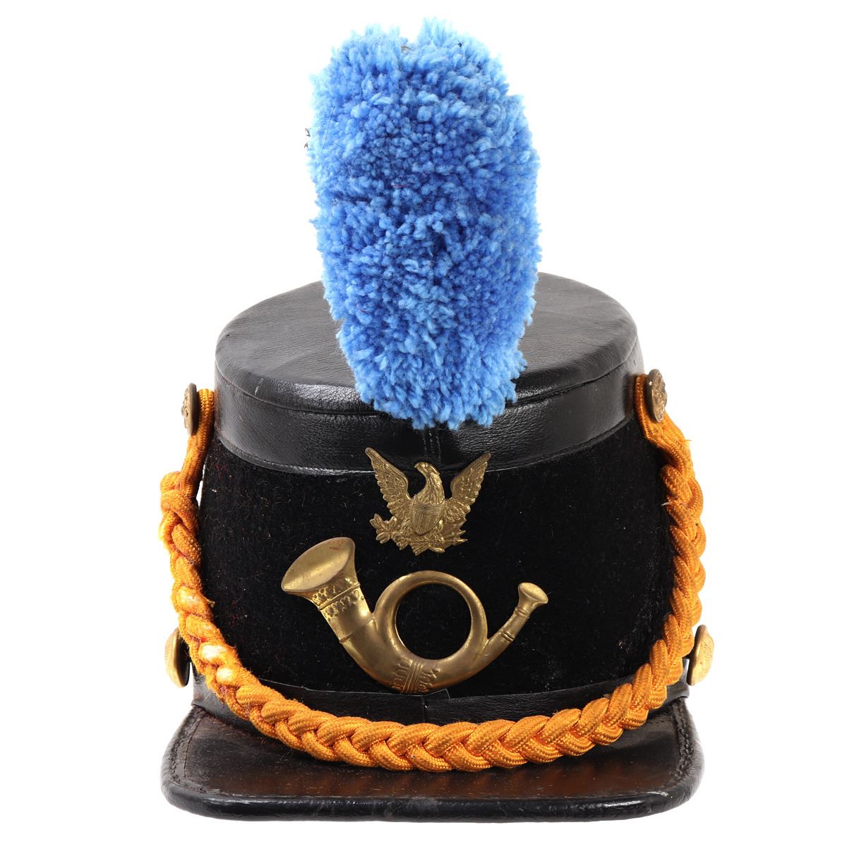 Probably modeled after the 1872 Infantry Officers Shako hat. Felt body with bright yellow intertwined cord. Bright blue plum. Plaques to the front of an American eagle and trumpet below. American eagle buttons at either side. Size 10 1/2" L x 7 3/8" W x 6" H, 10" H with feather. Condition: Wearable condition. Provenance: Ex-Southern California Militaria Collection