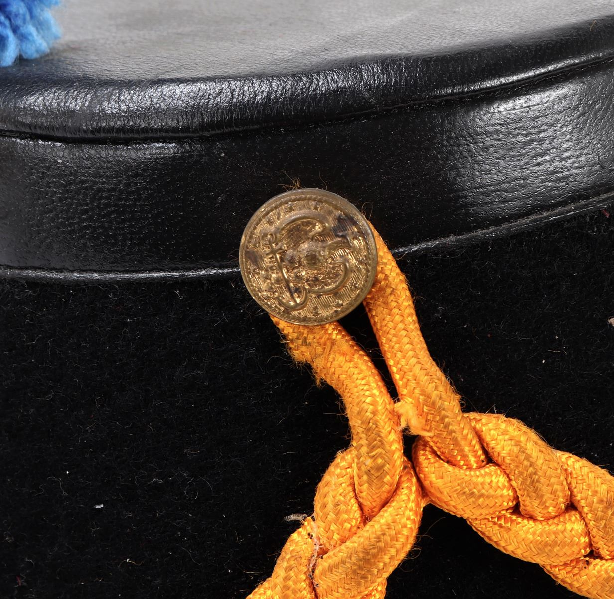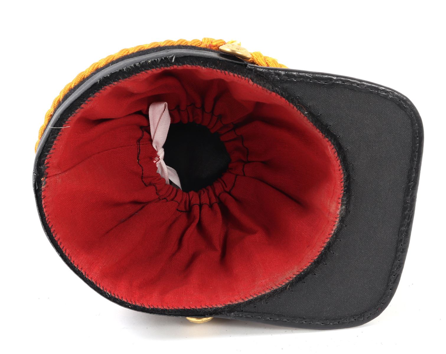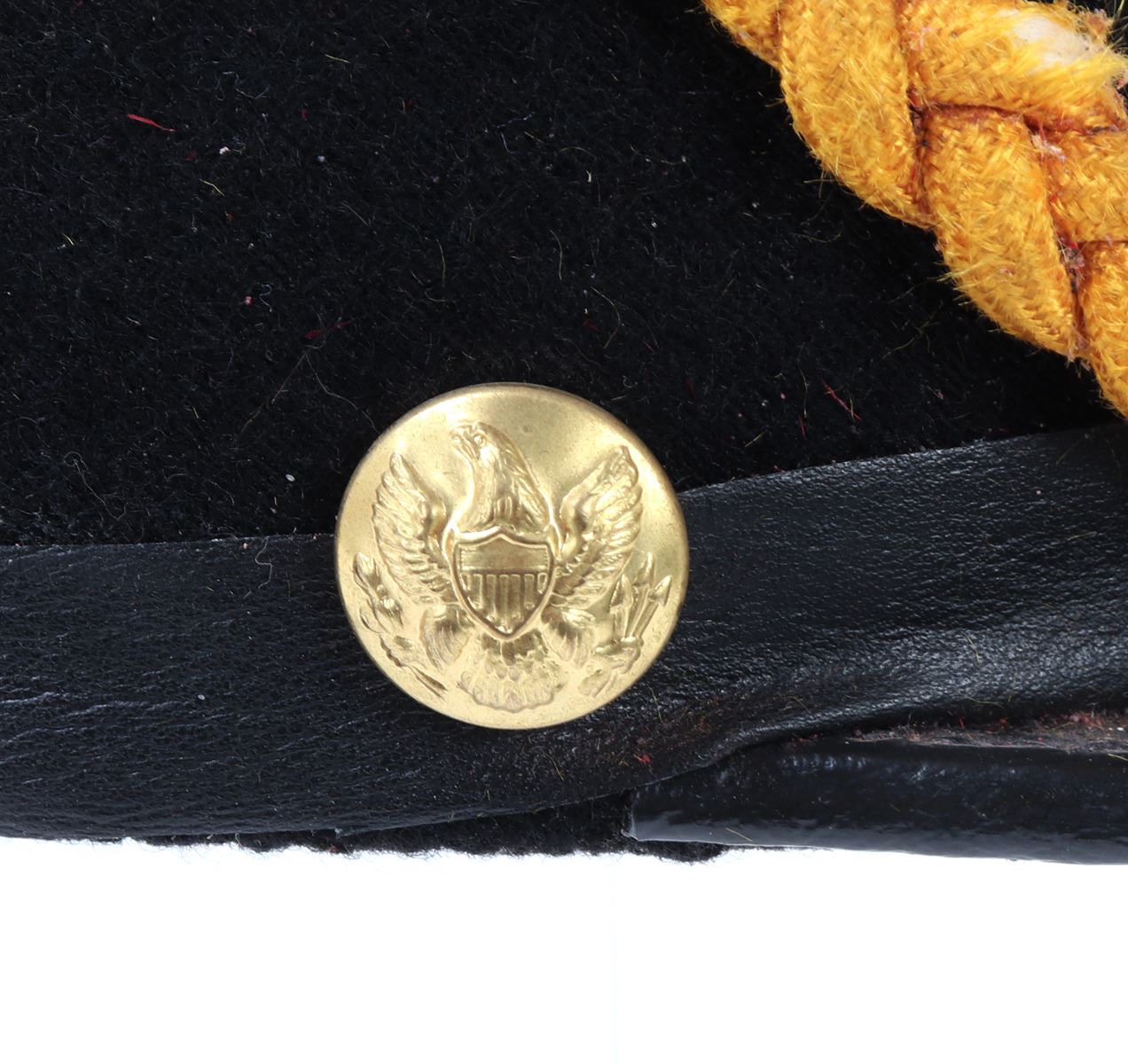 Probably modeled after the 1872 Infantry Officers Shako hat. Felt body with bright yellow intertwined cord. Bright blue plum. Plaques to the front of an American eagle and trumpet below. American eagle buttons at either side. Size 10 1/2" L x 7 3/8" W x 6" H, 10" H with feather. Condition: Wearable condition. Provenance: Ex-Southern California Militaria Collection