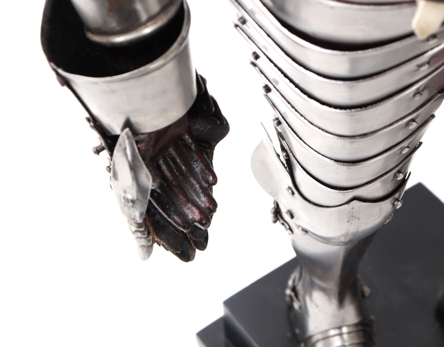 Antique Tower produced miniature suit of armor on stand with mannequin. The suit with a fully armour plate of articulating armour riveted together with leather straps and buckles. Each gauntlet comprised of multiple lames and fingers affixed to leather. Expertly crafted overall with striking accuracy. Size 4" L x 8" W x 23" H, weight 6lbs. Provenance: Ex-Southern California Collection
