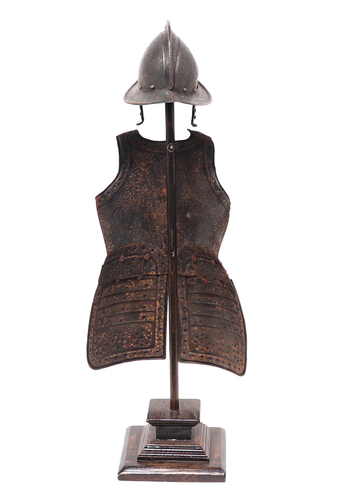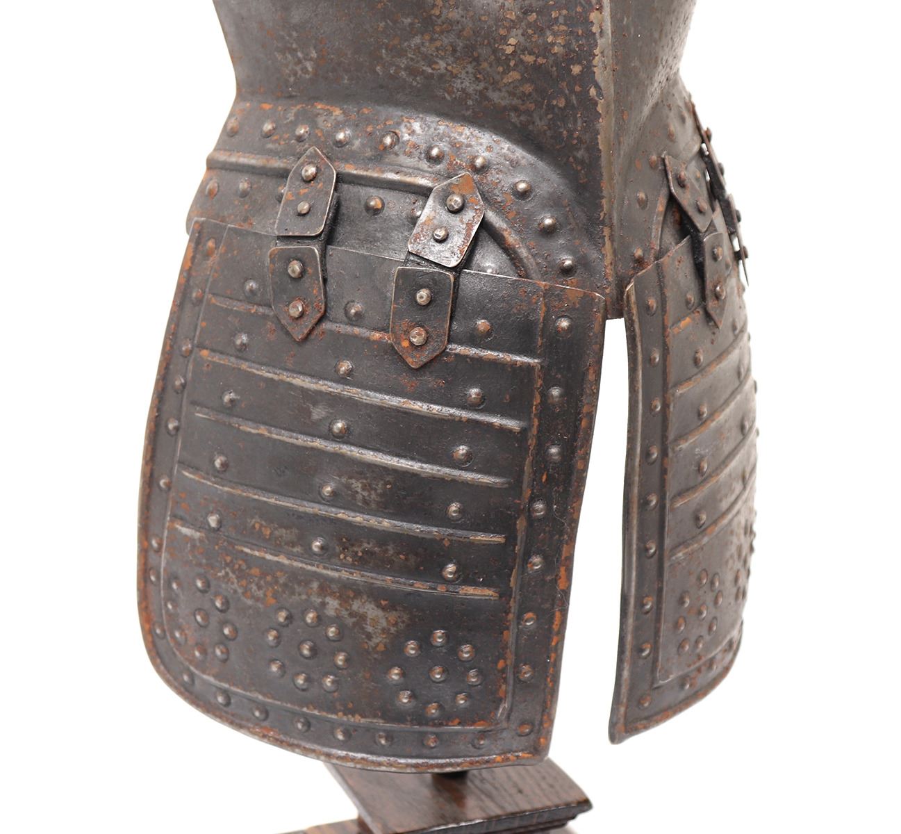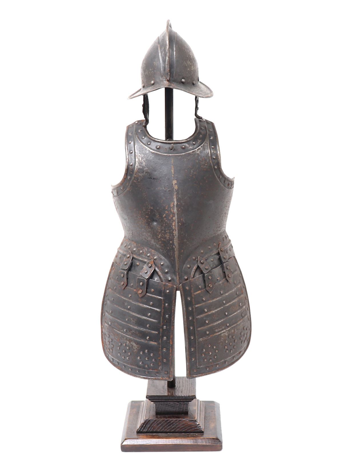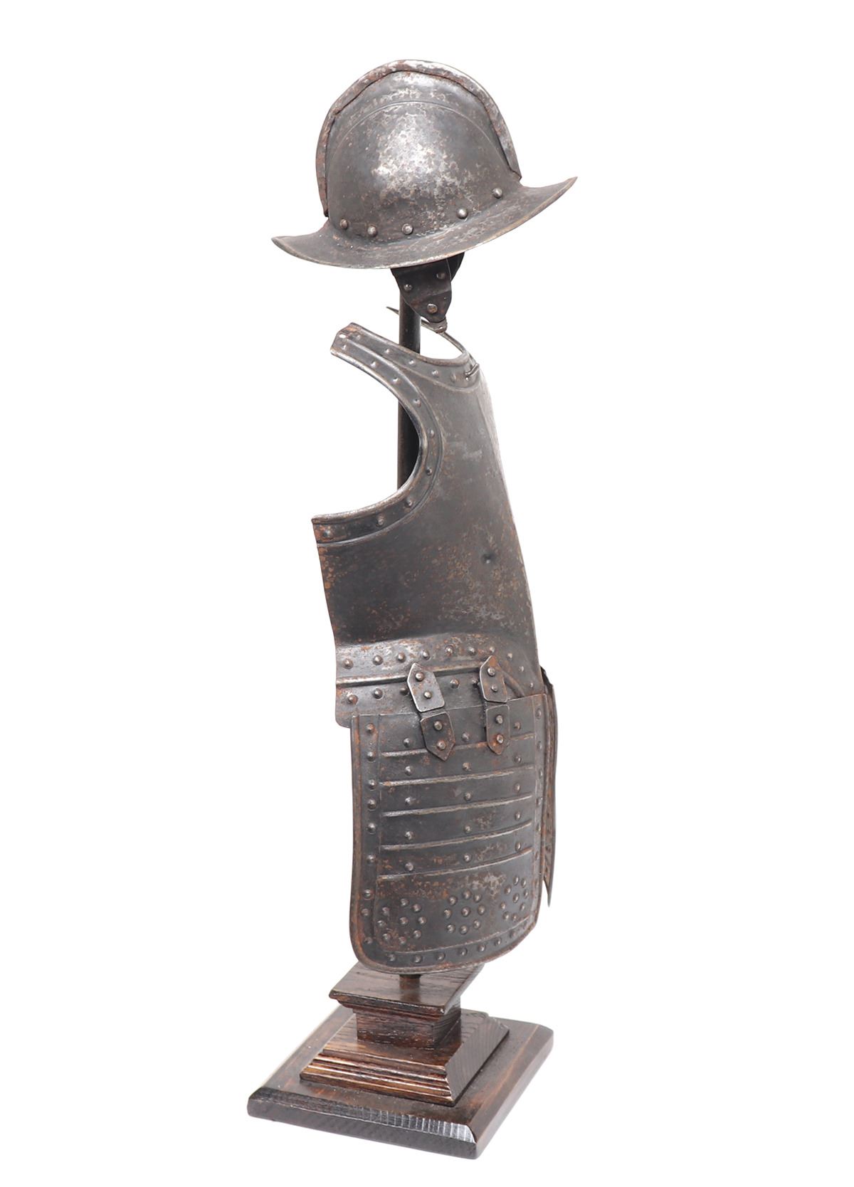 Antique European 17th century style pikeman's armour desk model, circa 19th century. The helm a morion with cheek plates retained. Breastplate with shot proof decoration and tassets in matching form with embossed false riveted surface tacks decoration. Size 24 1/2" H. Provenance: Ex-Southern California Collection