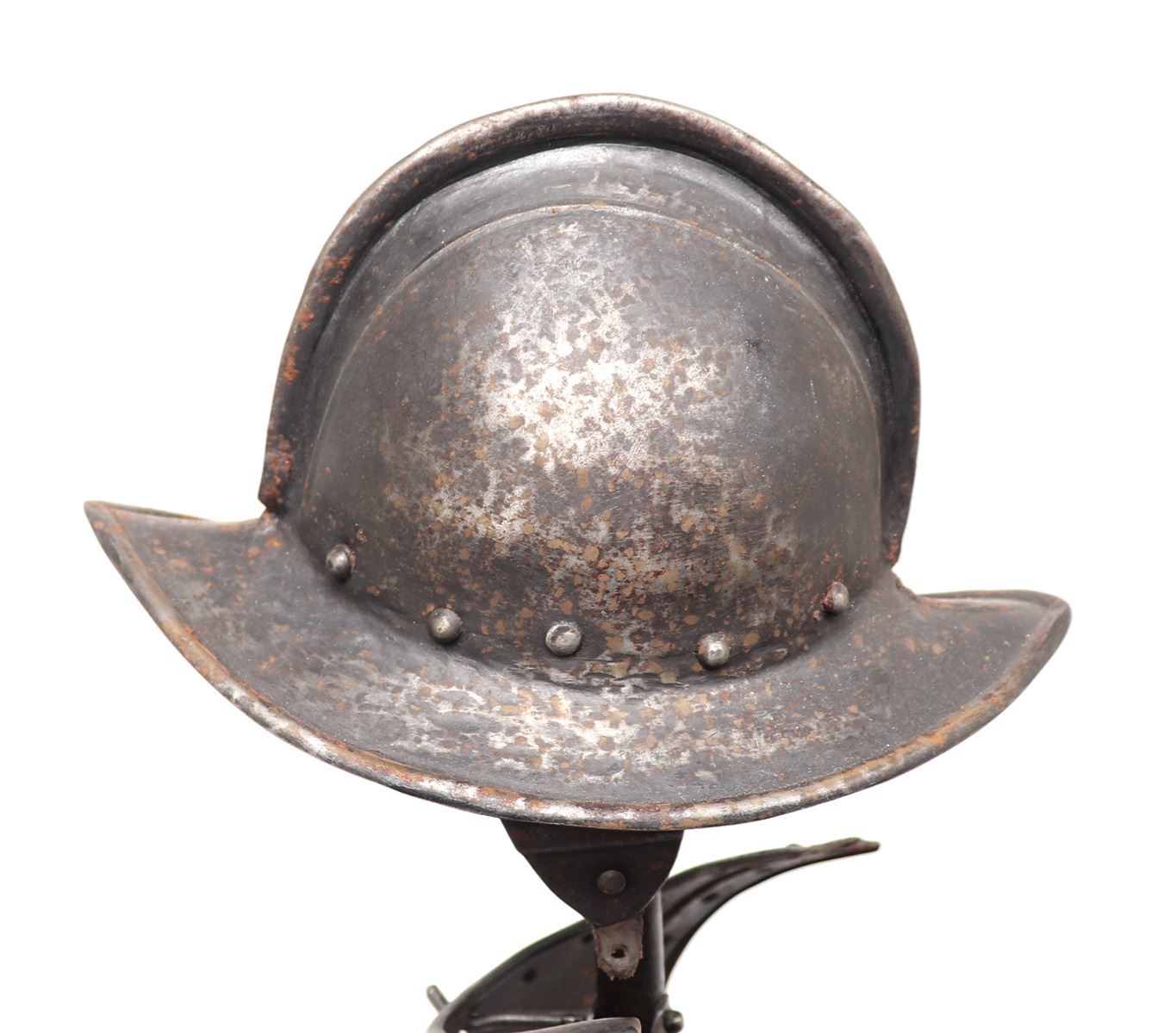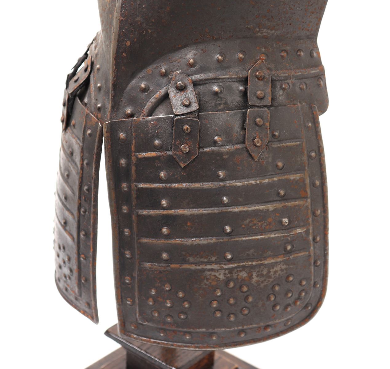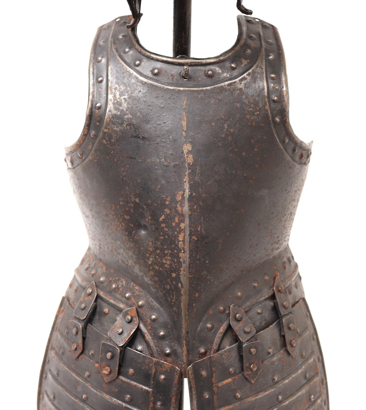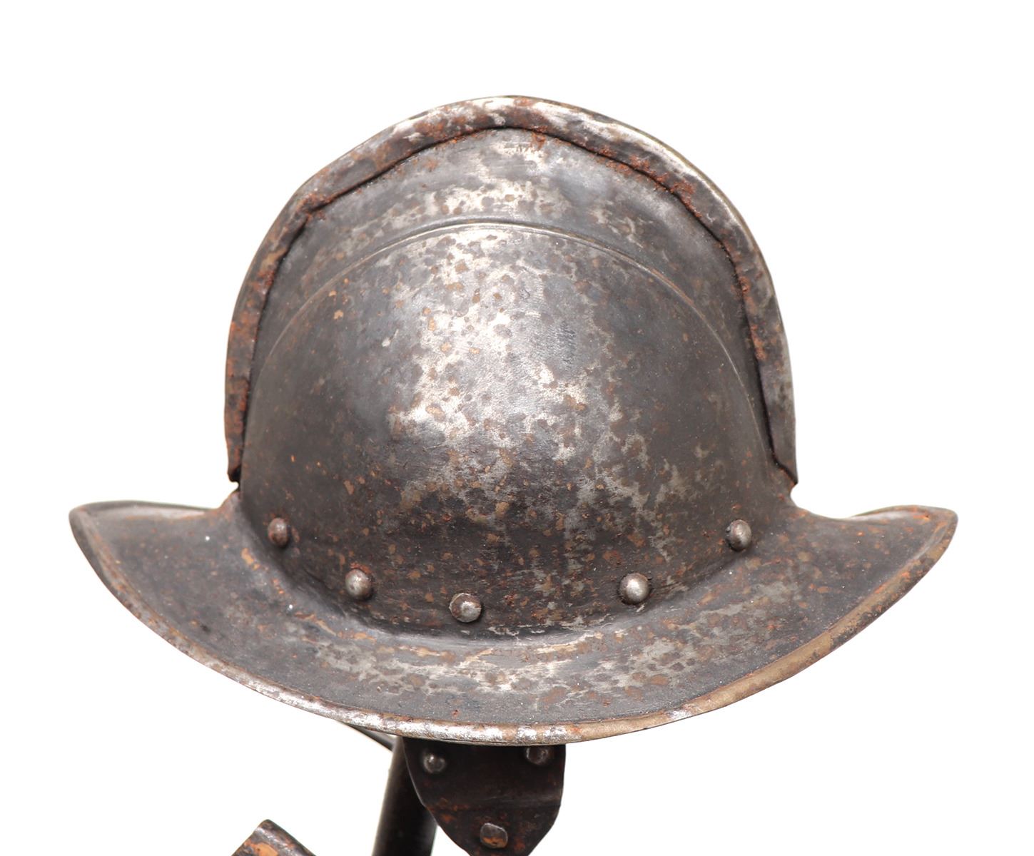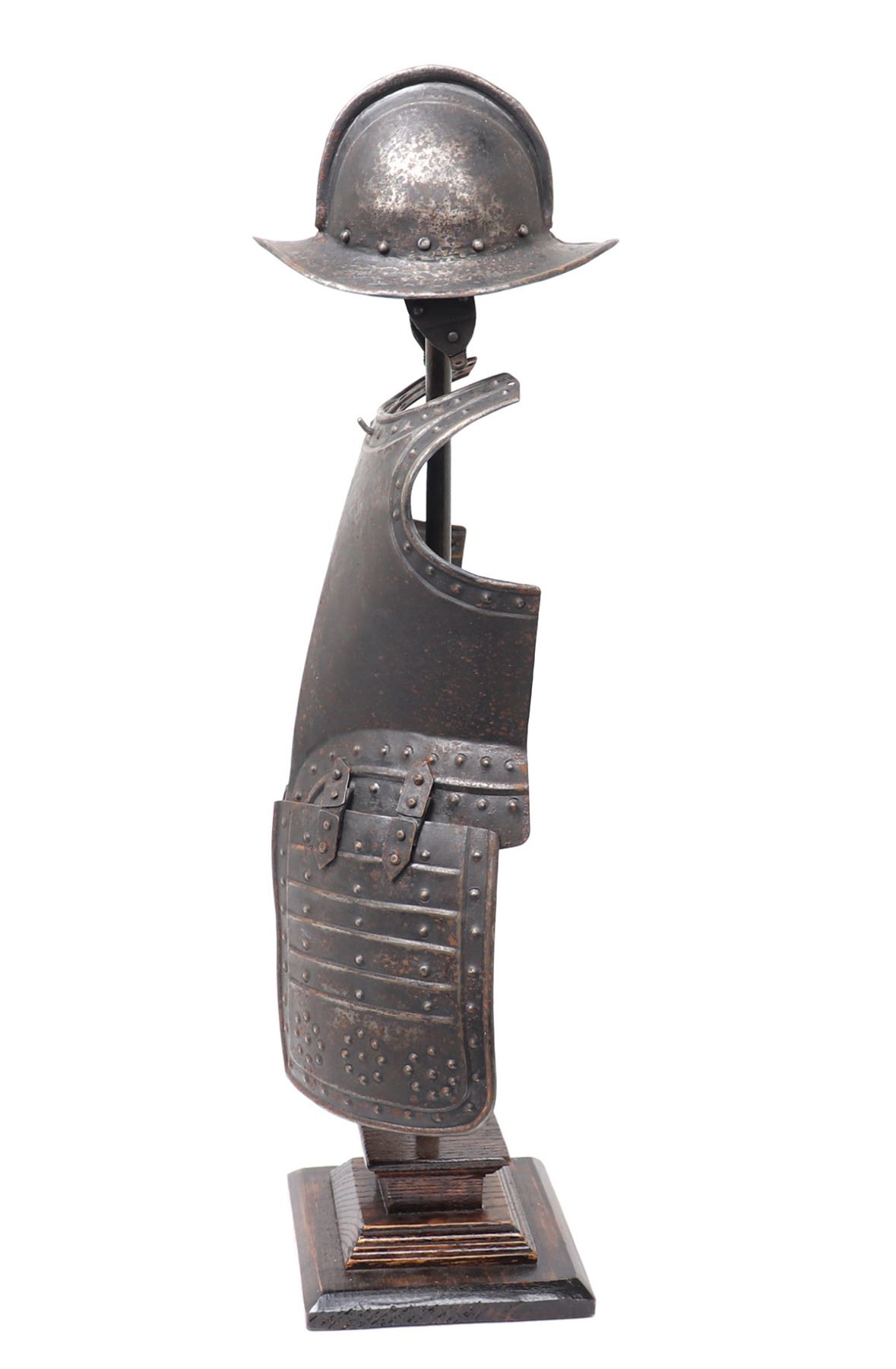 Antique European 17th century style pikeman's armour desk model, circa 19th century. The helm a morion with cheek plates retained. Breastplate with shot proof decoration and tassets in matching form with embossed false riveted surface tacks decoration. Size 24 1/2" H. Provenance: Ex-Southern California Collection