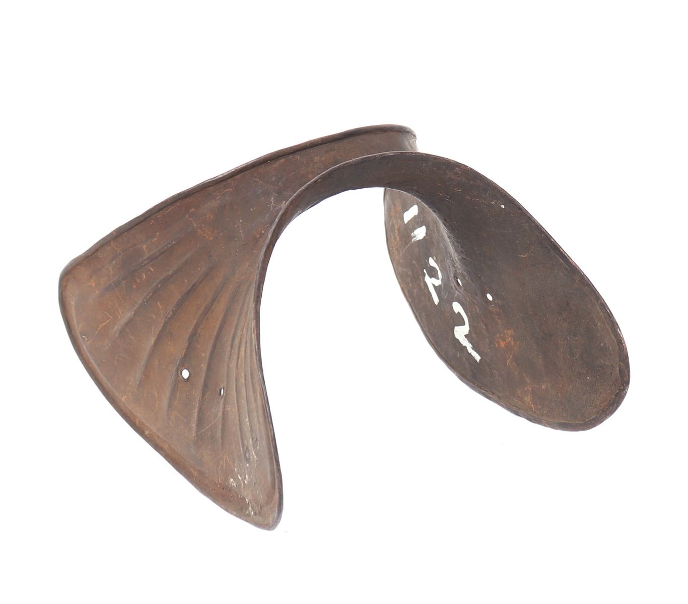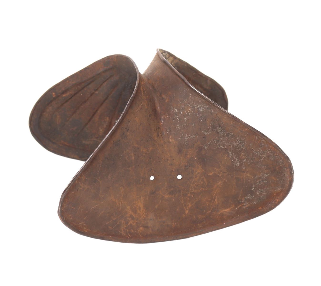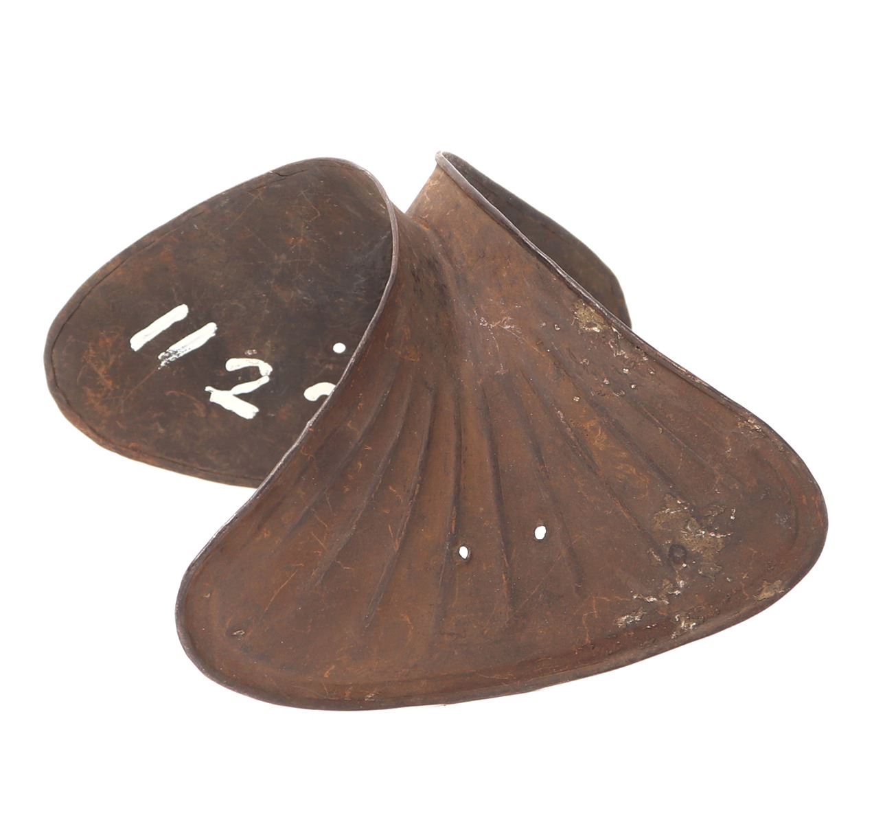 European, German Maximilian or Gothic transitional style Couter or elbow defense, probably circa 19th century. Painted to the interior with inventory numbers (1122). Pierced to the widened portion with two holes for the tie of leather straps used to affix. Fluted to the exterior, hand hammered, and with a light rolled edge. Size 6 1/4" L x 5 1/2" W. Condition: Oxidization, layer of patina overall.. Provenance: Ex-Southern California Arms and Armour Collection, Ex-John Woodman Higgins Armory Museum