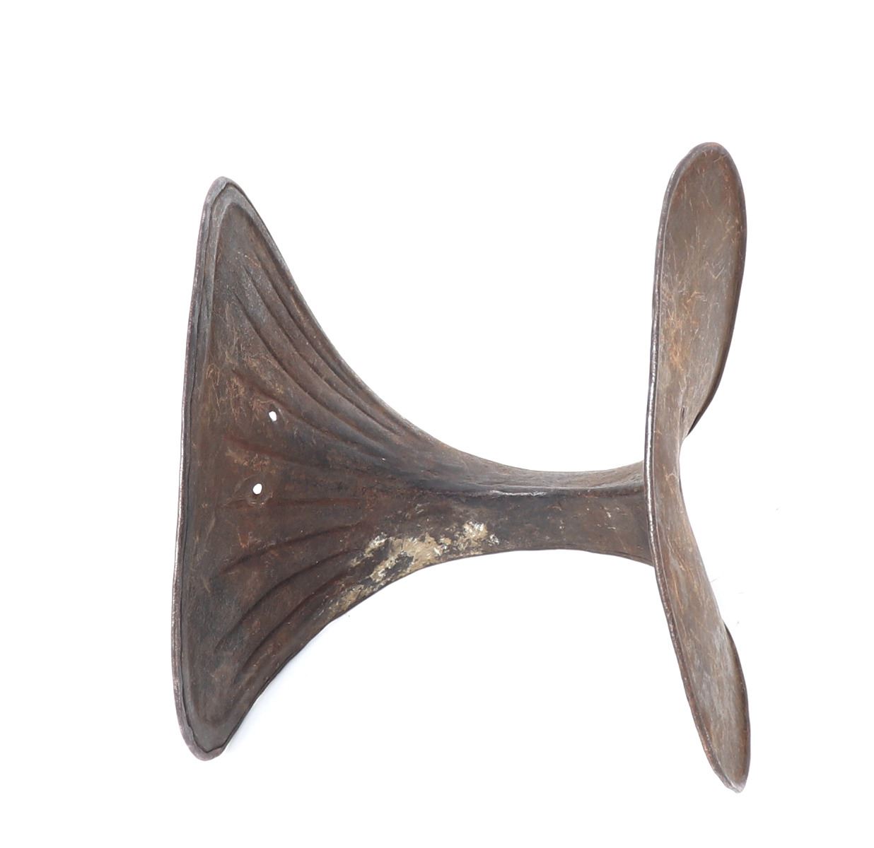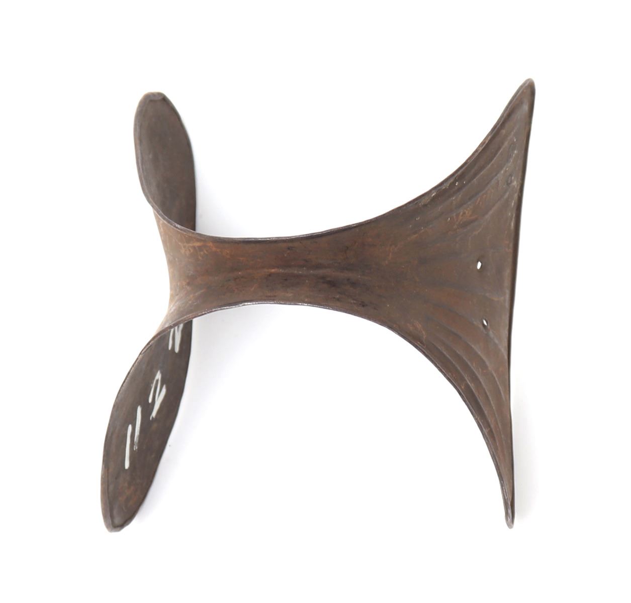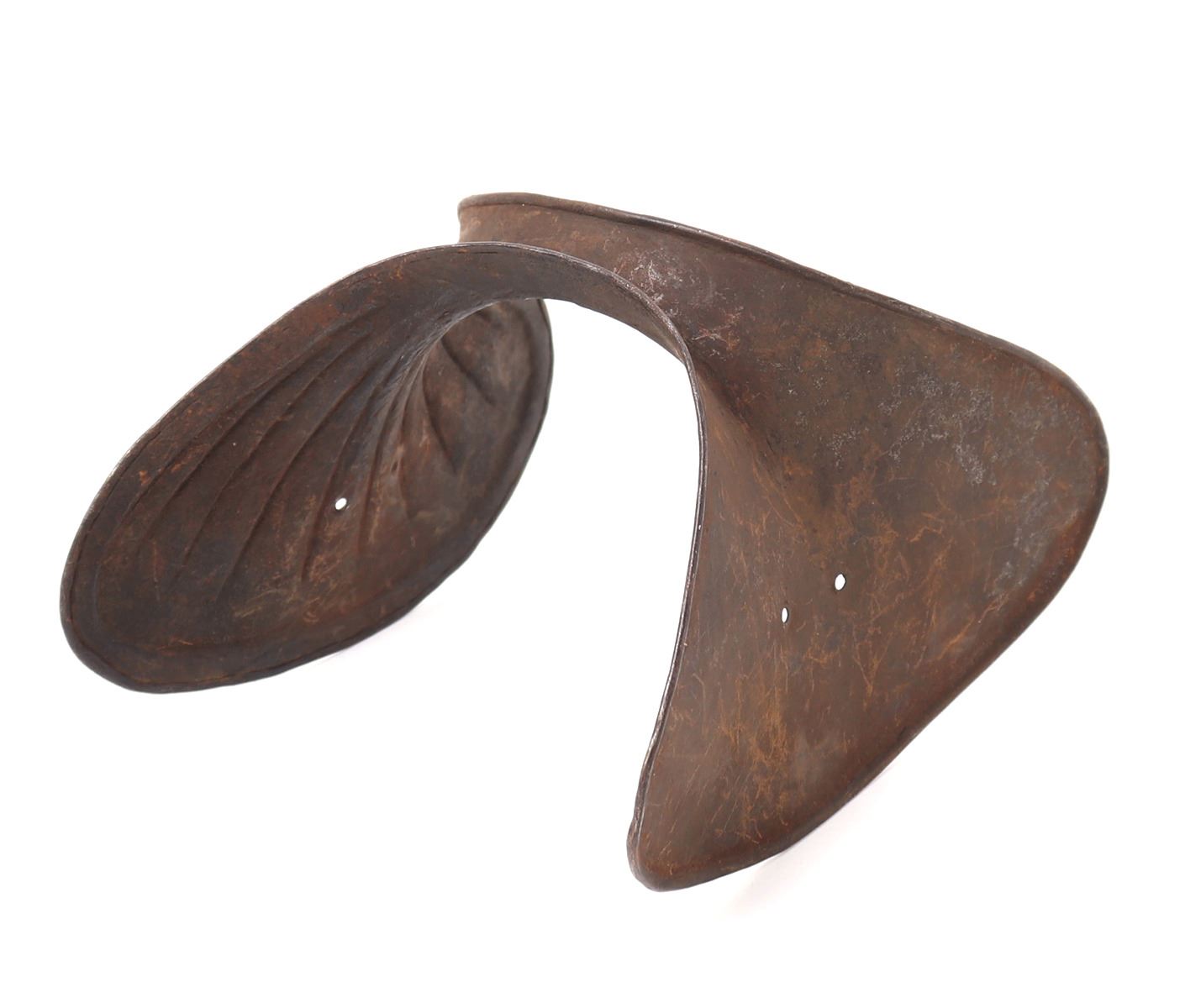 European, German Maximilian or Gothic transitional style Couter or elbow defense, probably circa 19th century. Painted to the interior with inventory numbers (1122). Pierced to the widened portion with two holes for the tie of leather straps used to affix. Fluted to the exterior, hand hammered, and with a light rolled edge. Size 6 1/4" L x 5 1/2" W. Condition: Oxidization, layer of patina overall.. Provenance: Ex-Southern California Arms and Armour Collection, Ex-John Woodman Higgins Armory Museum