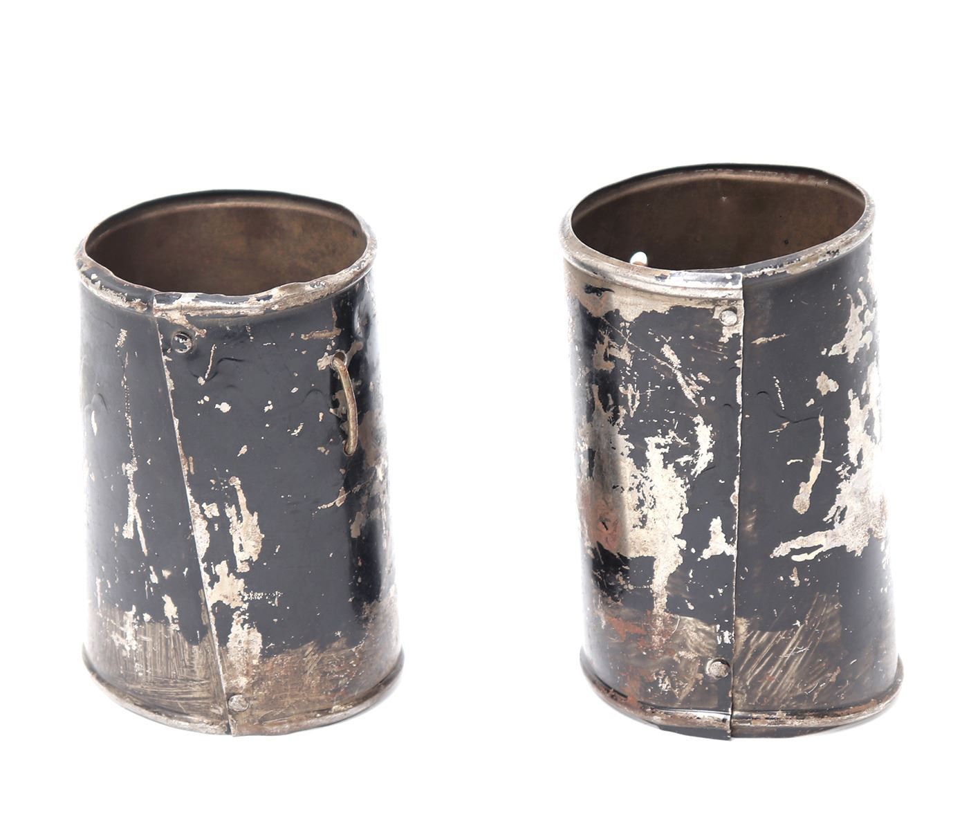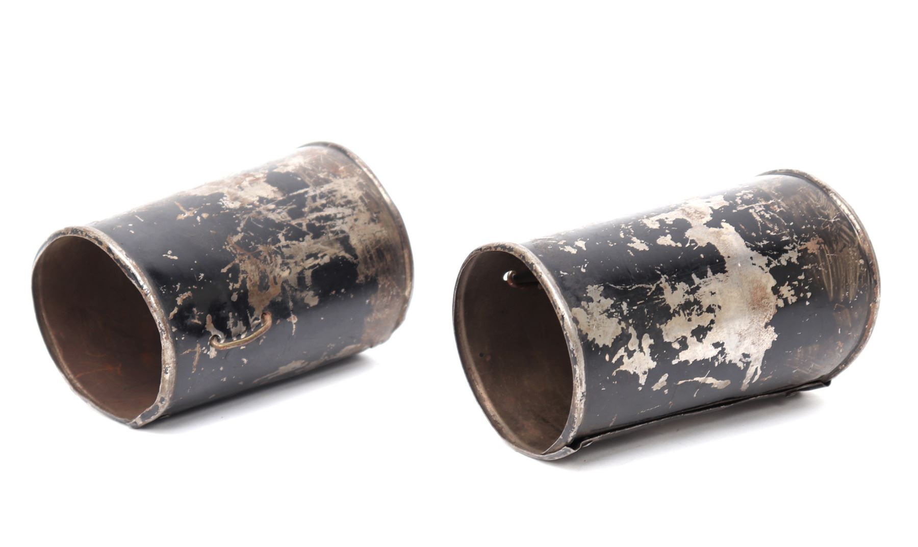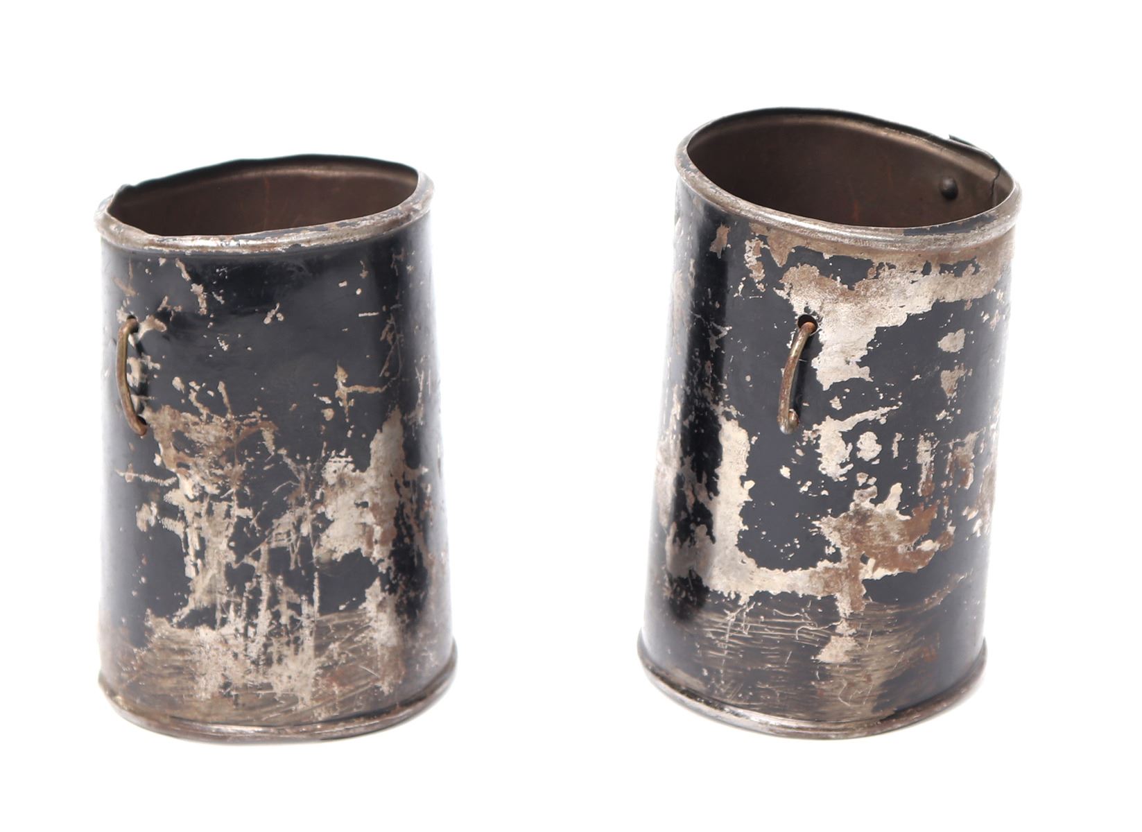 Pair of armour vambraces or lower cannons probably for a boys suit or Victorian castle armour, 19th century. Formed from a single steel of steel with rolled edges and covered in a black paint. Size 5 1/4" L. Provenance: Ex-Southern California Collection, Ex-Higgins Museum