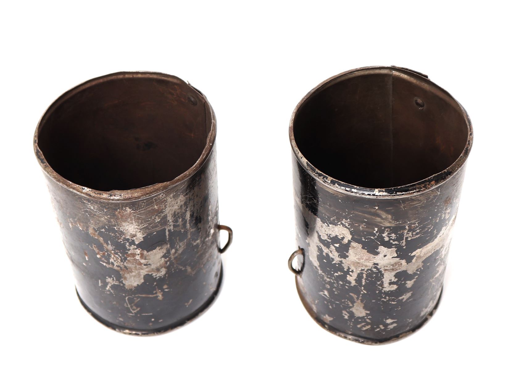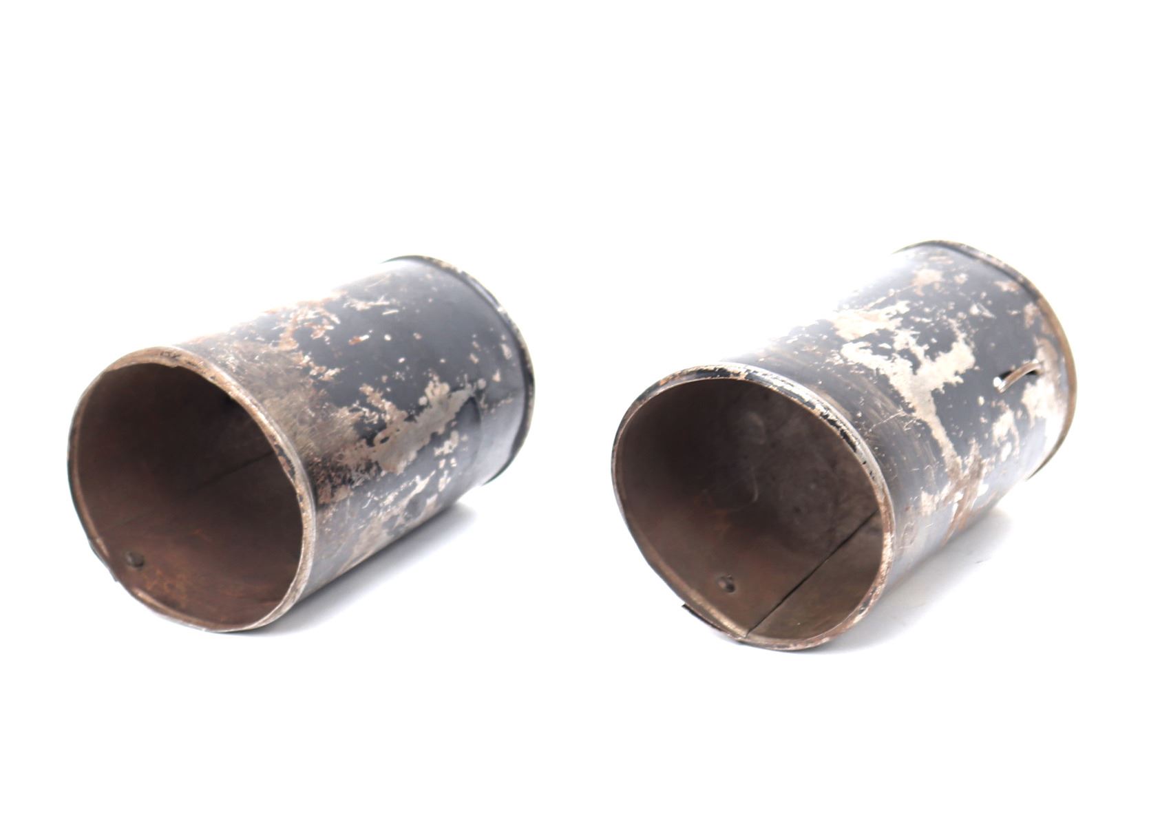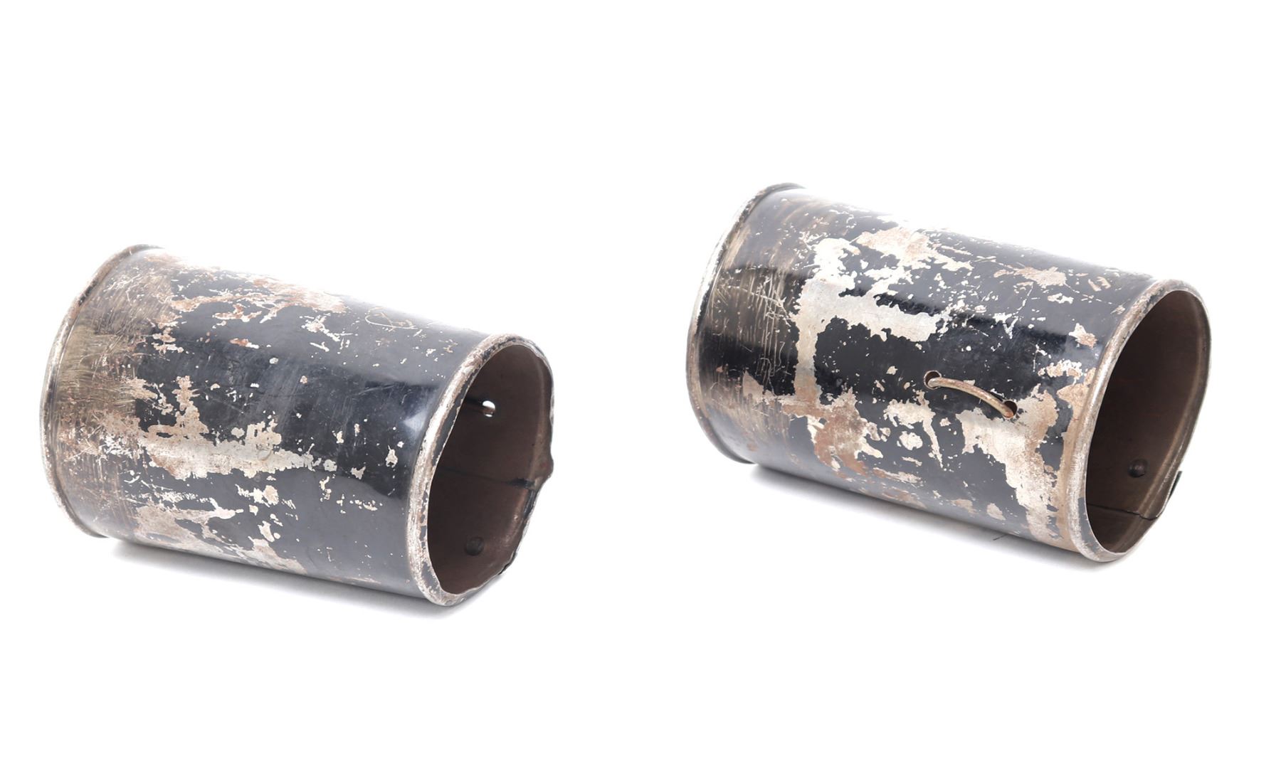 Pair of armour vambraces or lower cannons probably for a boys suit or Victorian castle armour, 19th century. Formed from a single steel of steel with rolled edges and covered in a black paint. Size 5 1/4" L. Provenance: Ex-Southern California Collection, Ex-Higgins Museum