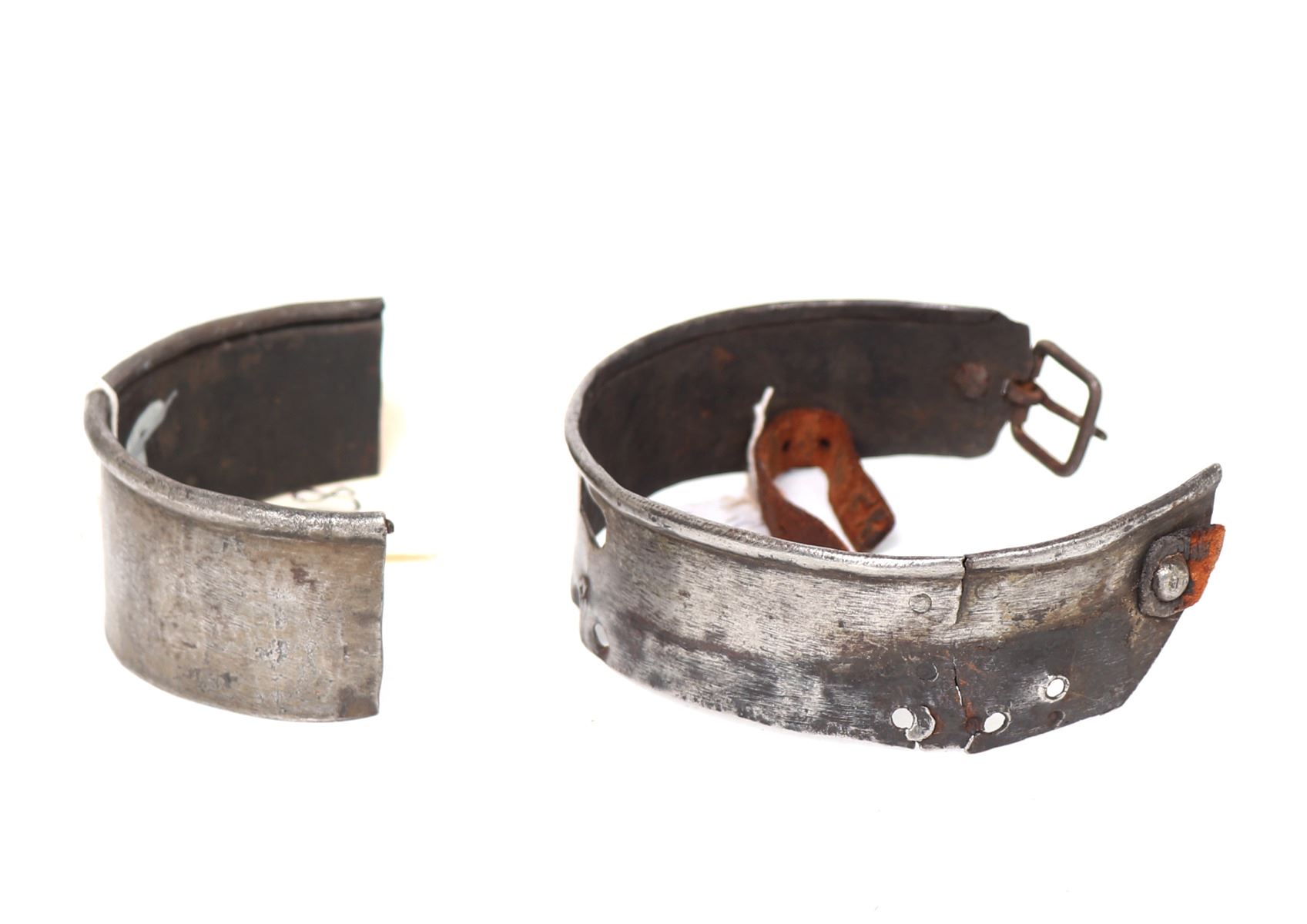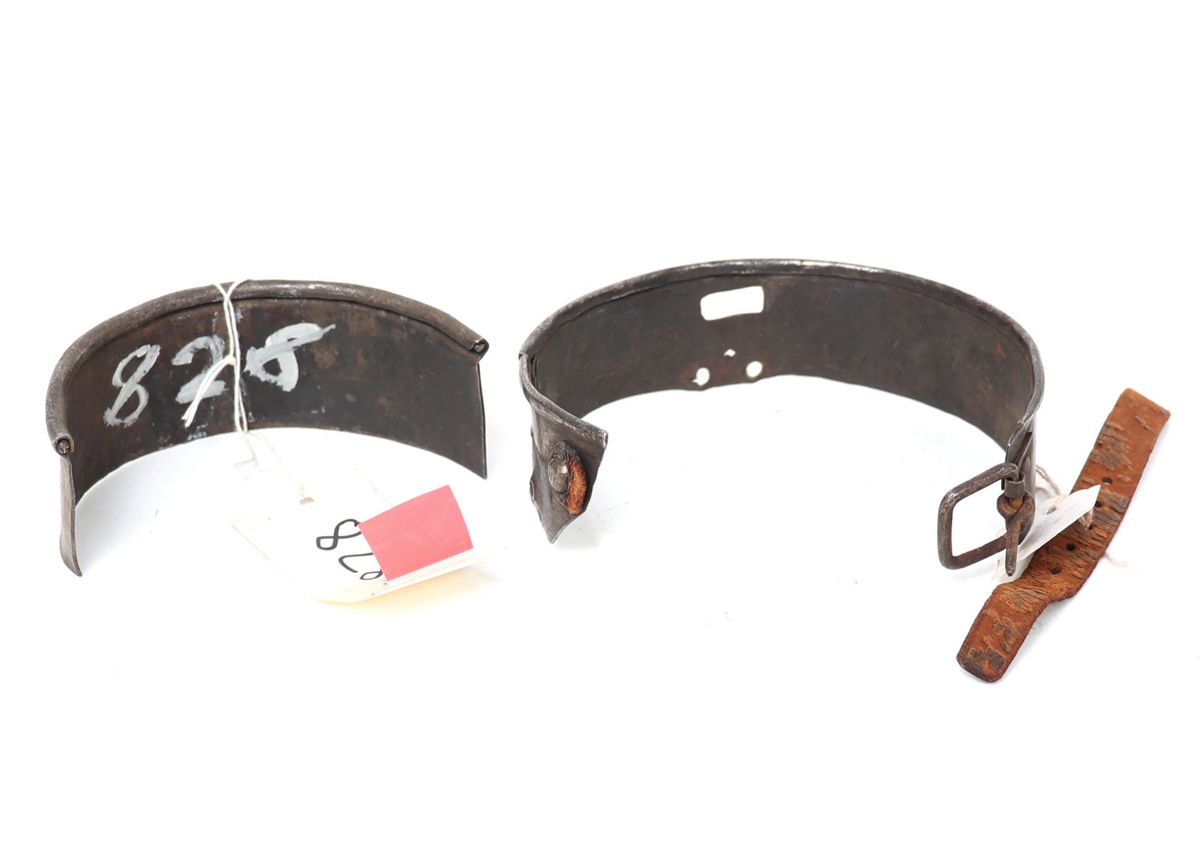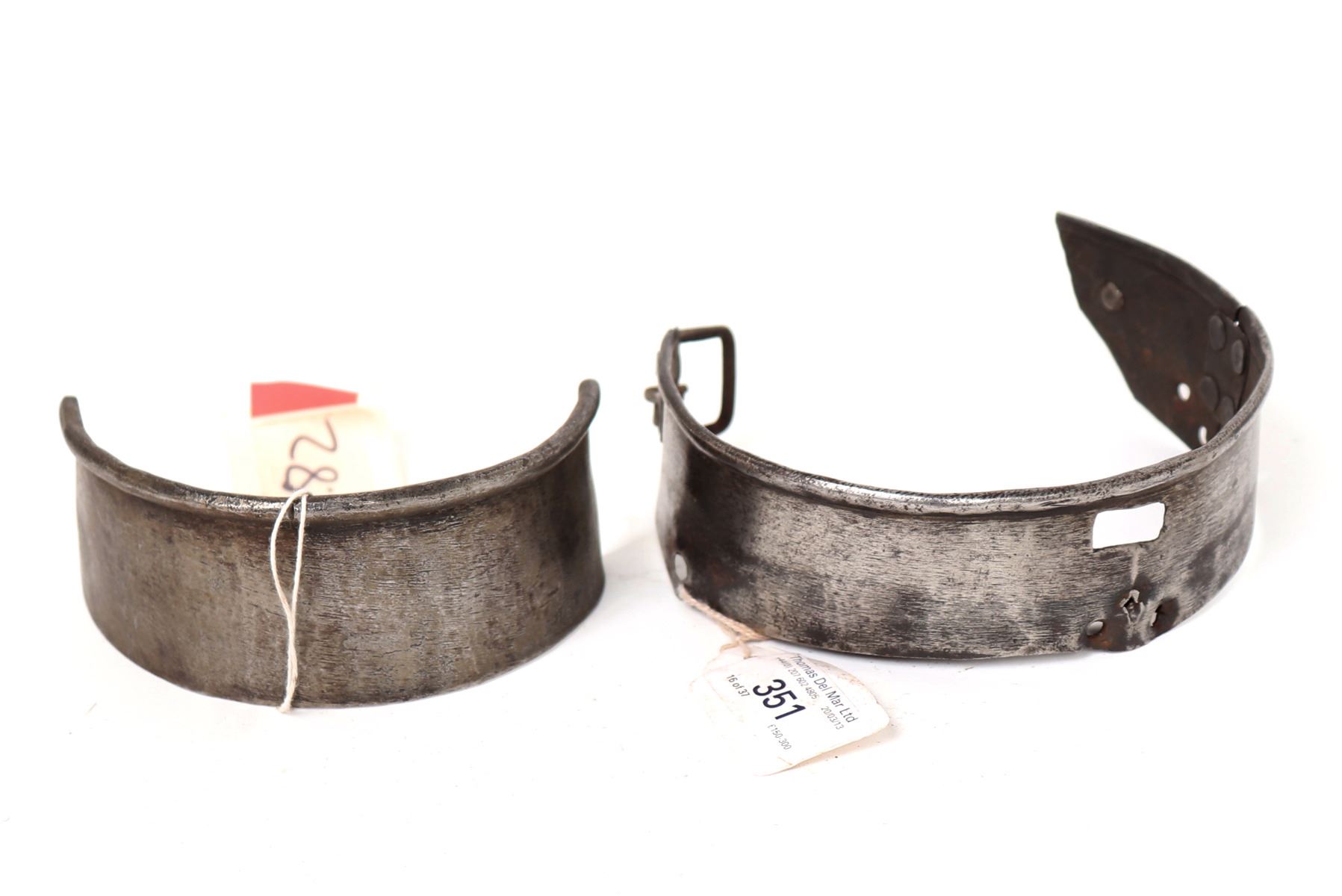 Elements of European armour for the arms of a full suit. One piece with a buckle to the rear and probably for the upper or lower cannons section. Left an additional component of a lame for the same section of armour. Both are period and probably 16th-17th century. Former Higgins Museum Collection Inventory Numbers (828.82). Other unmarked. Size of largest 5" W. Provenance: Ex-Southern California Collection, Ex-Thomas Del Mar, Ex-Higgins Armory Museum Collection