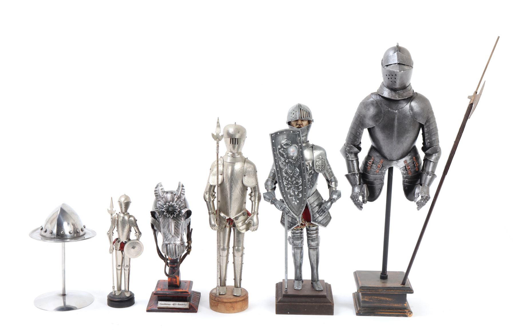 Wonderful little collection of six various miniature armors including half suits, halberds, shields, kettle hat, and chamfron. Size 17 1/4" H. Provenance: Ex-Southern California Collection