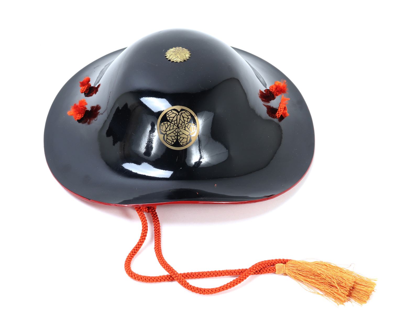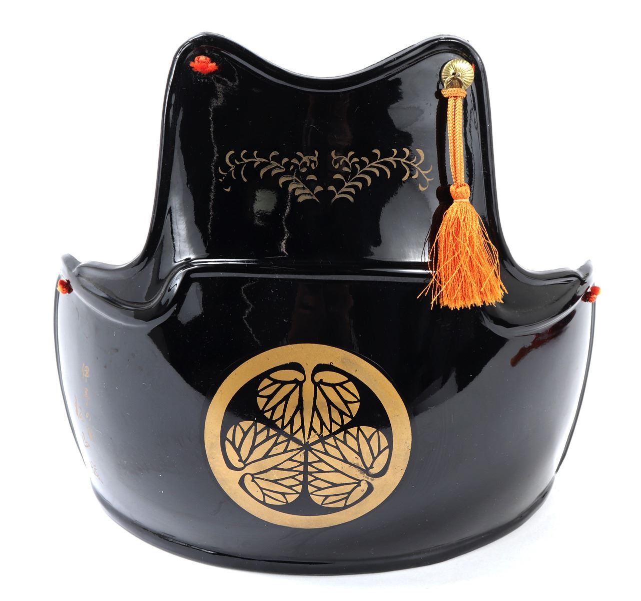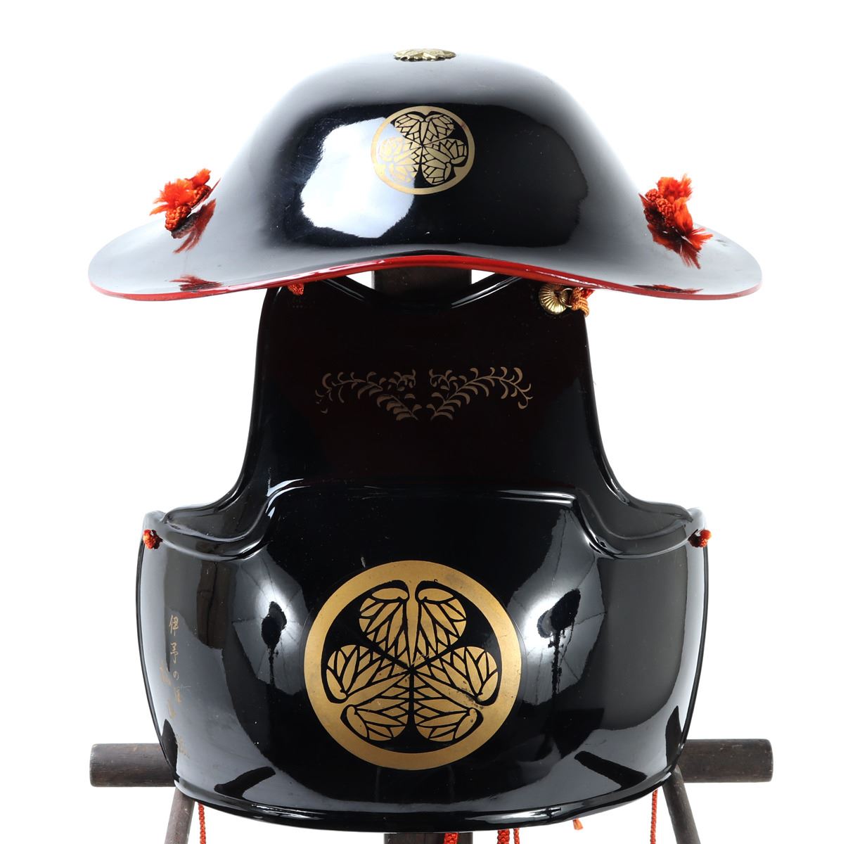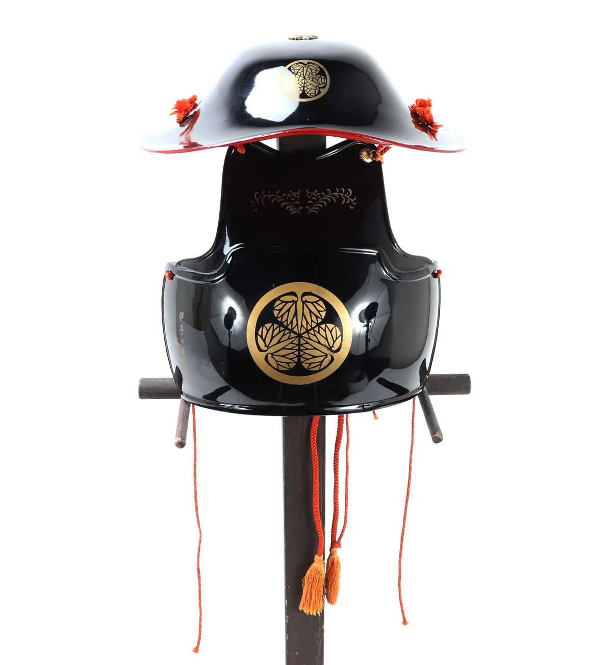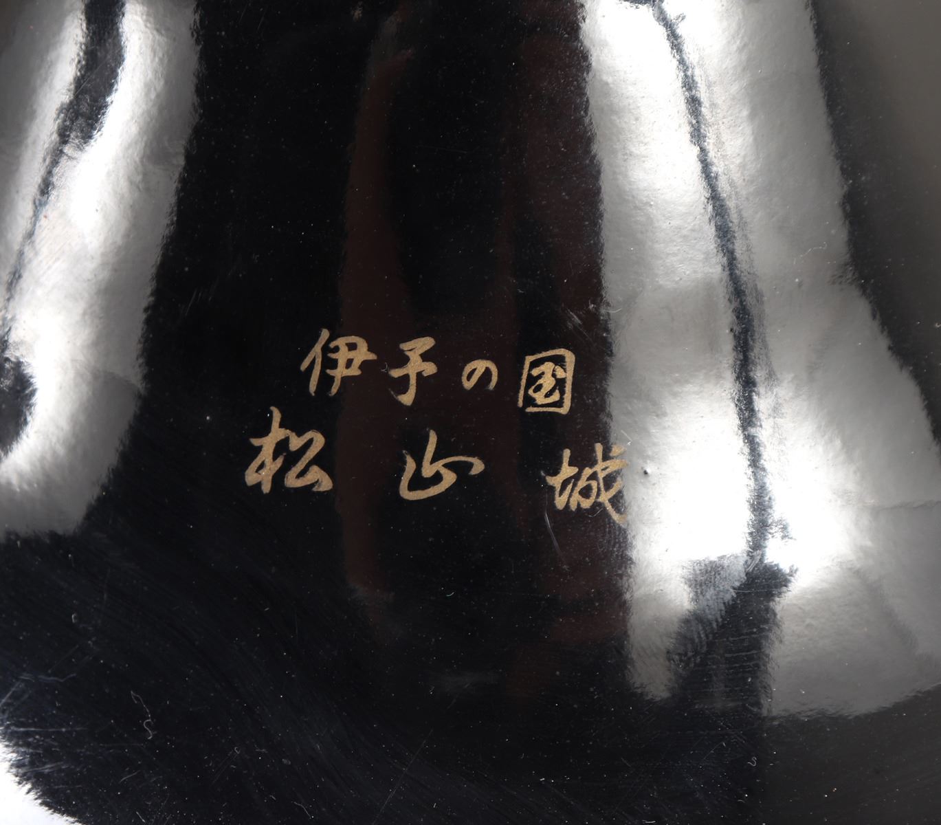 Black glossly Japanese armor do and Jingasa set. Signed to the reverse with an inscription referencing Iyo Matsuyama Castle. Size Breastplate 8 3/4" H, Stand not included. Condition: Good conditon black lacuer finish. Provenance: Southern California Estate