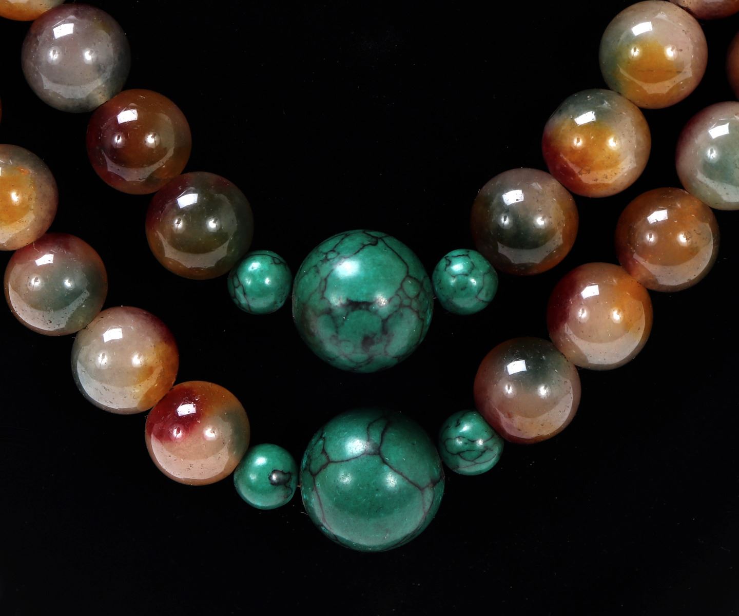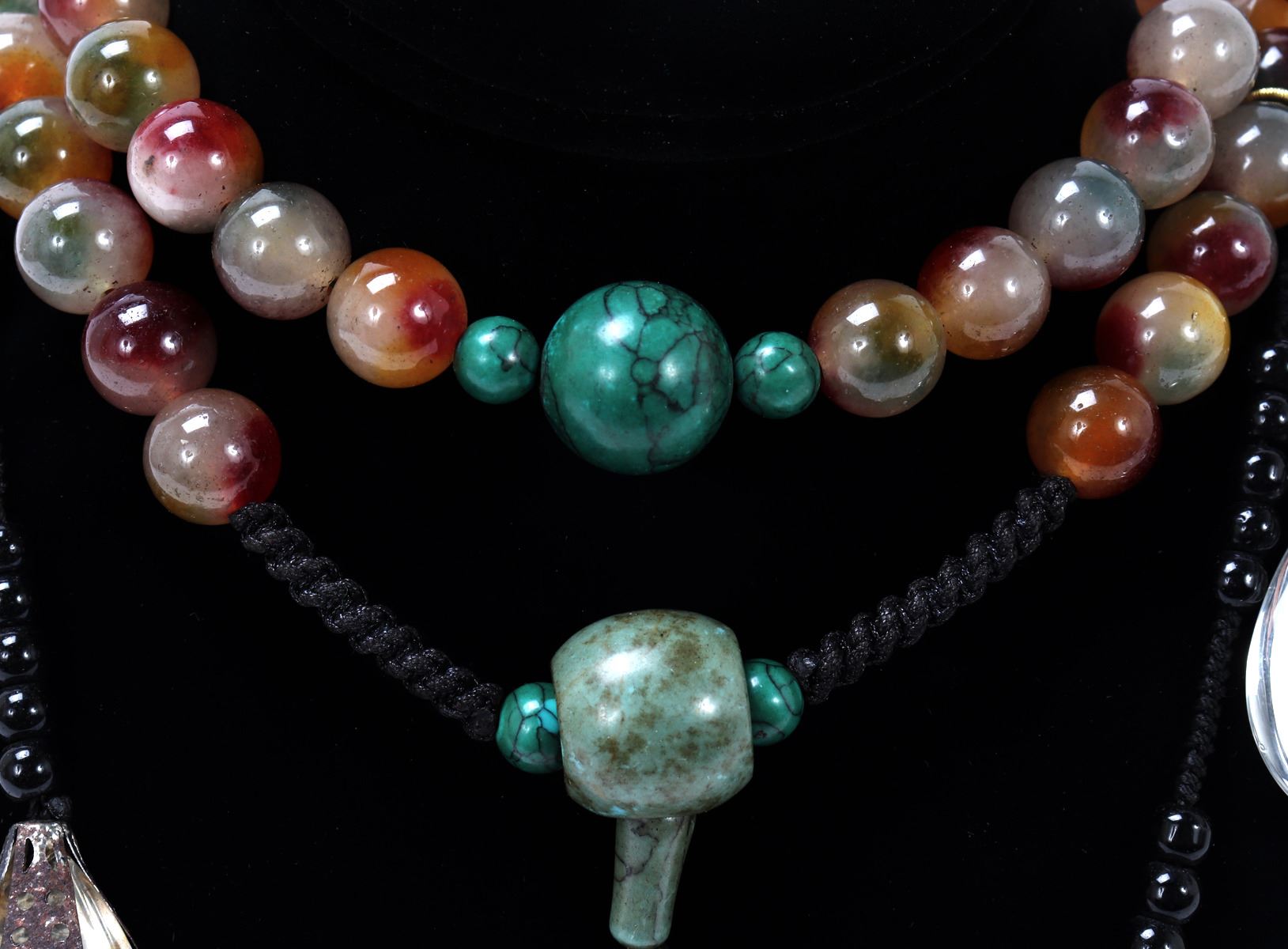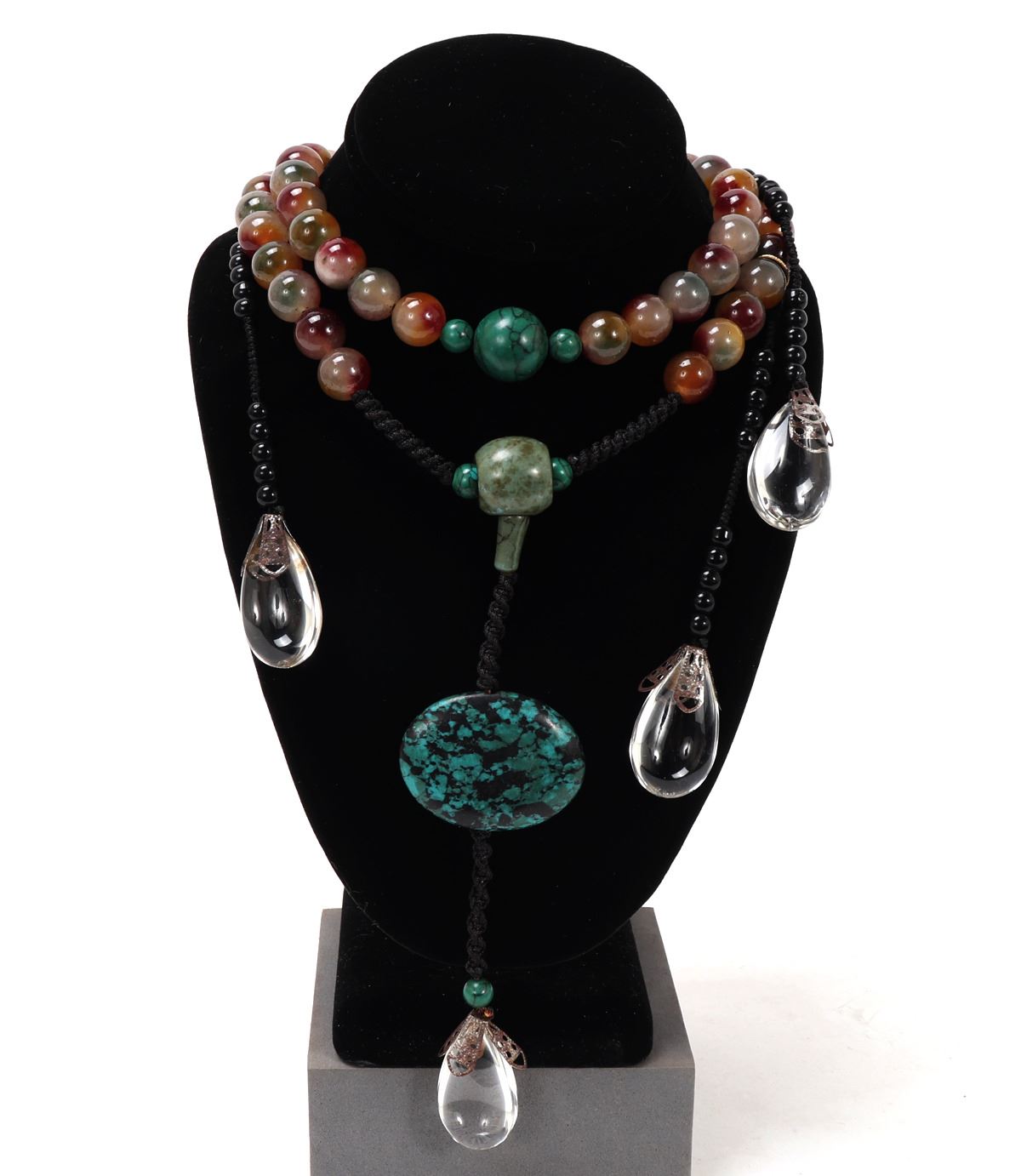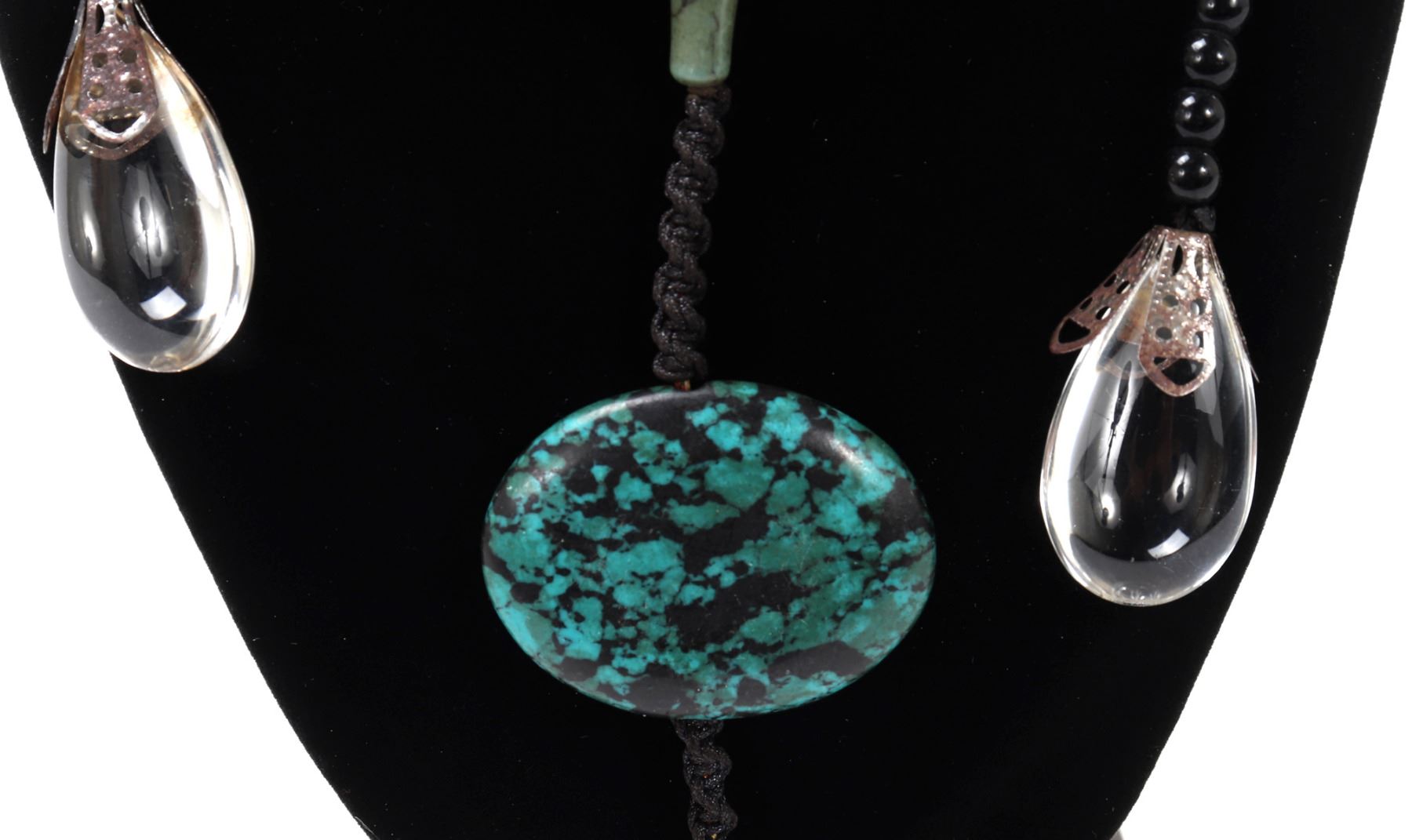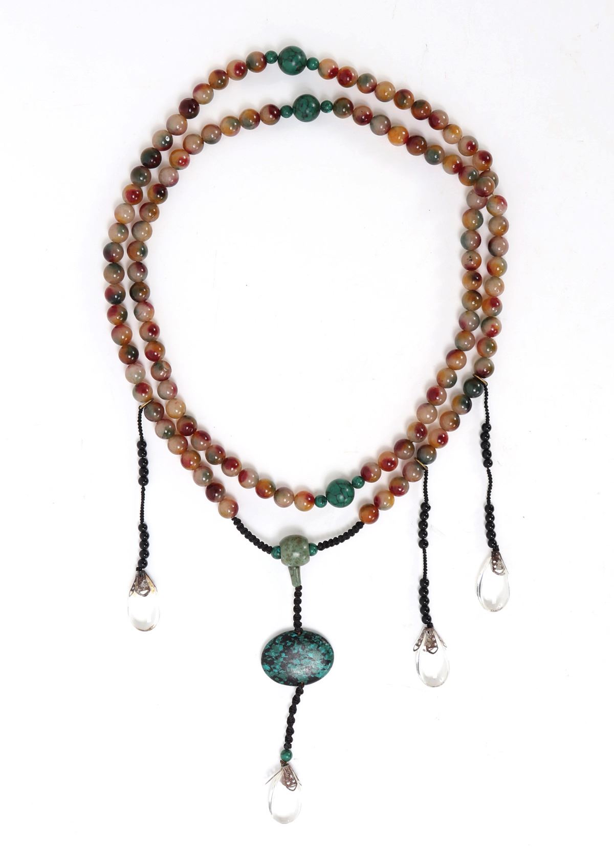 Wonderful mixed mineral and bead Tibetan rosary bead necklace, gorgeous center turquoise pendant with turquoise accent beads. Teardrop crystal like beads with intricately detailed openwork flower petals holding the teardrop beads. Size necklace 58" L, pendant 6 3/4" L. Condition: Wonderful condition throughout.