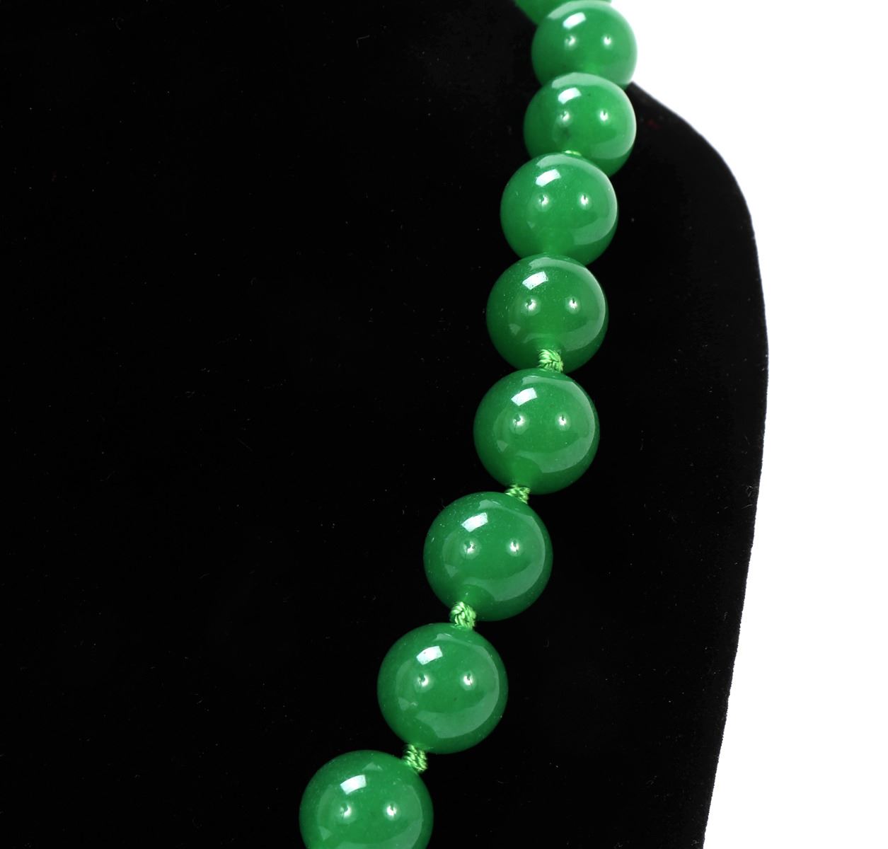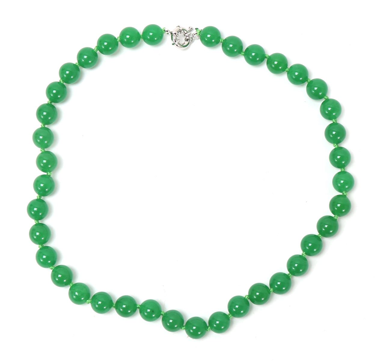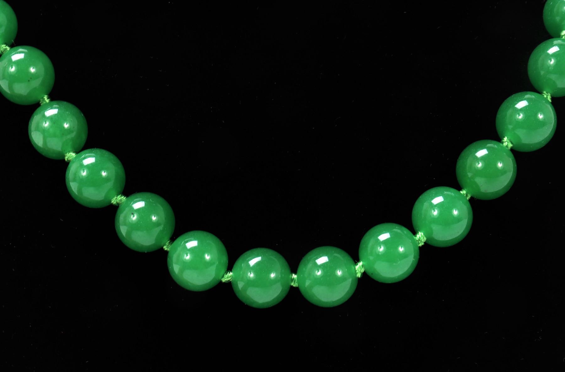 Beautiful Chinese jade style beaded necklace with a sterling silver clasp, lovely bright green silk thread with spacer knots in between each bead. Size 16" L. Condition: Wonderful wearable condition throughout.