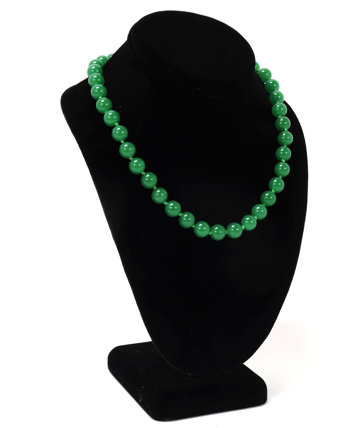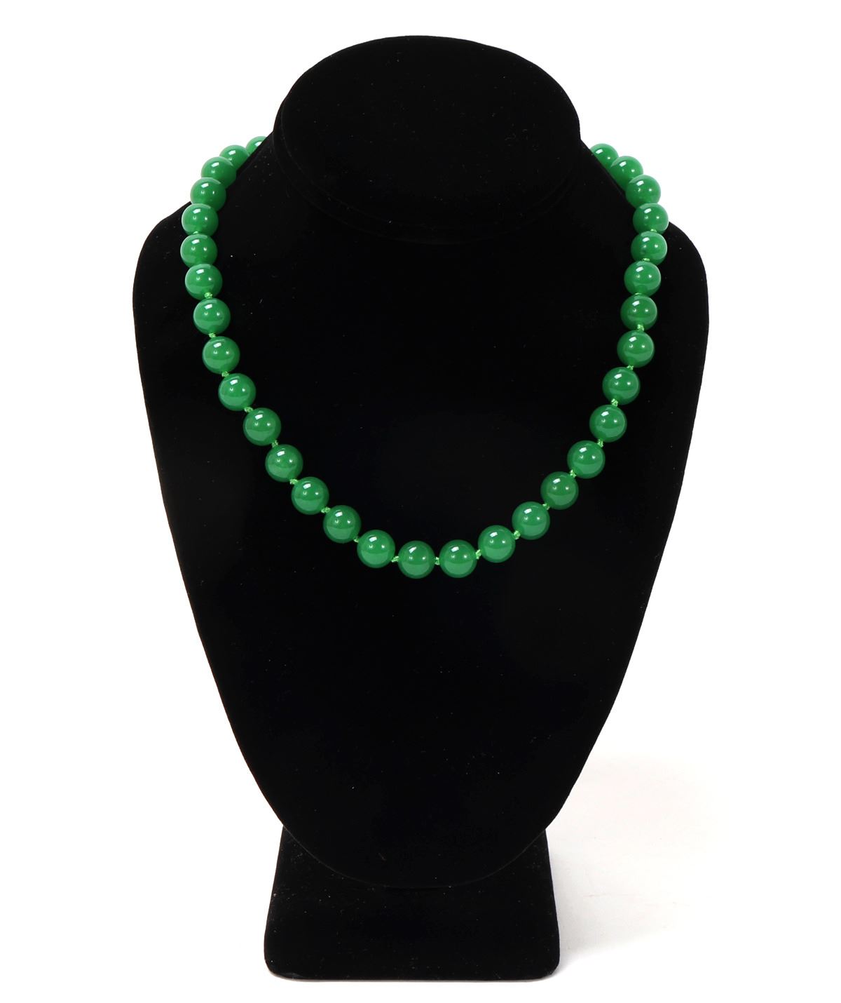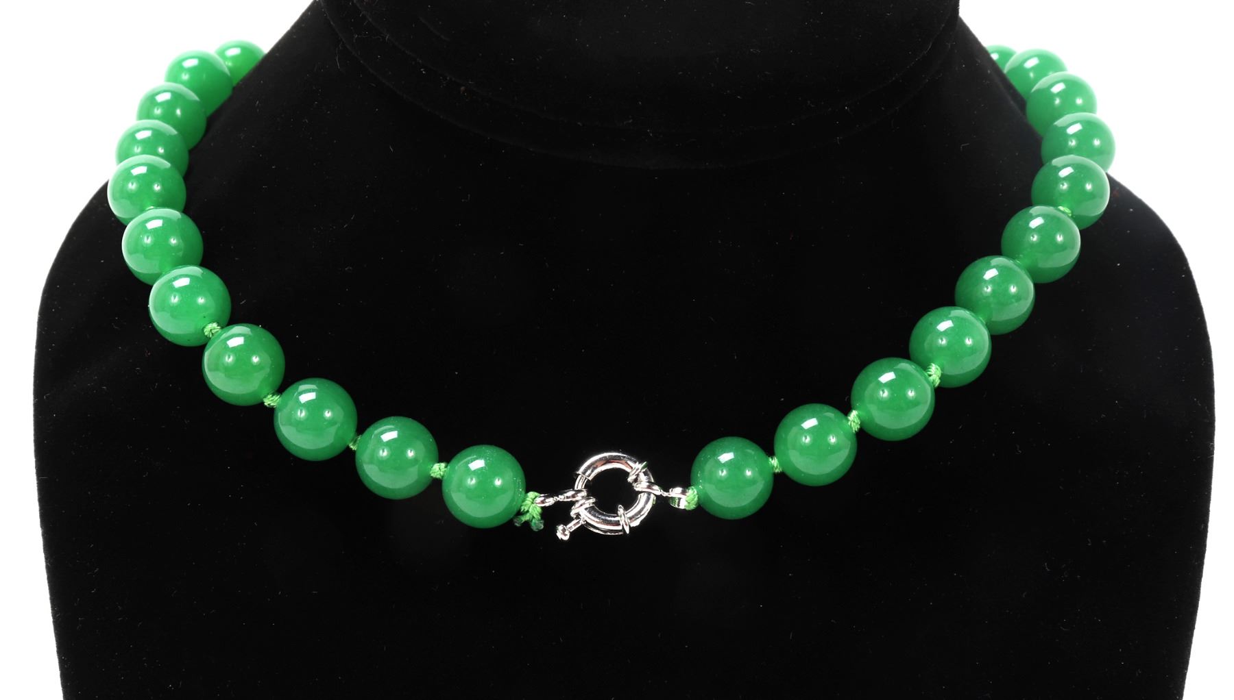 Beautiful Chinese jade style beaded necklace with a sterling silver clasp, lovely bright green silk thread with spacer knots in between each bead. Size 16" L. Condition: Wonderful wearable condition throughout.