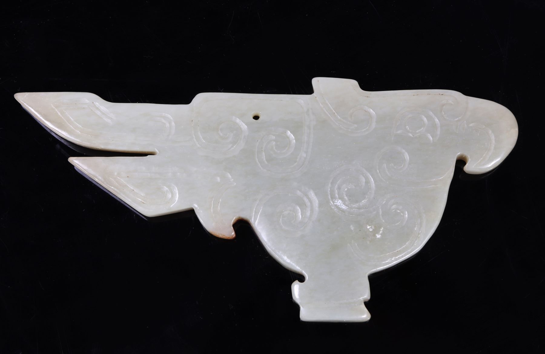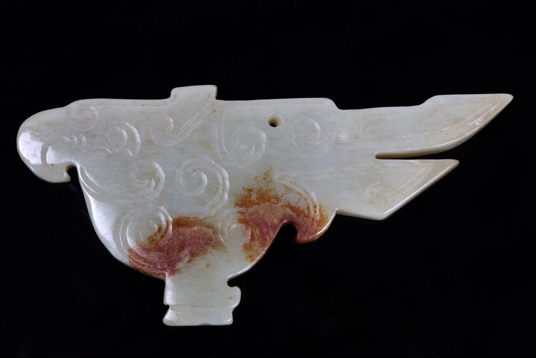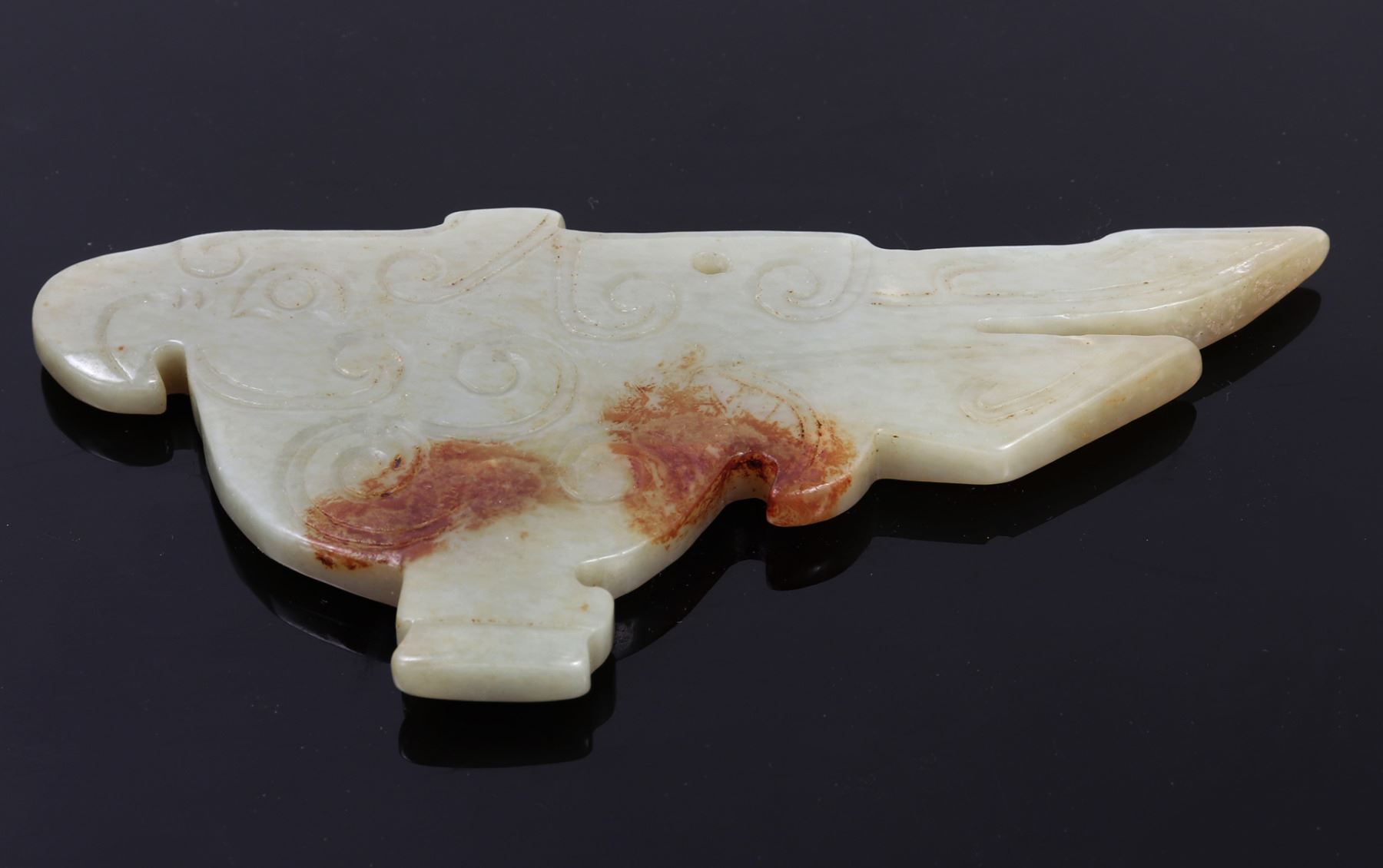 Lovely Chinese certified natural nephrite jade bird pendant. Incised swirled designs to the body throughout with split tail feathers and a downturned protruding beak. Pierced through the top for suspension. Mottled brown color to one side of the pendant. Size 4 7/8" L, weight 76 g. Condition: Good overall condition without signs of restoration or repair.