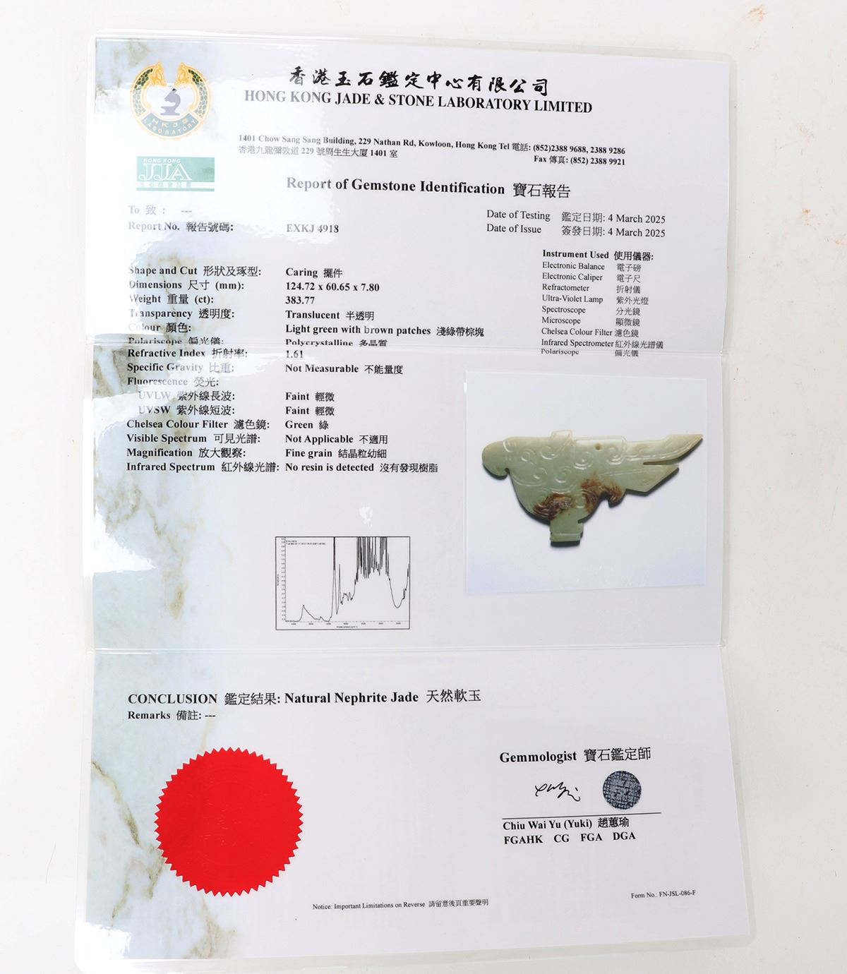 Lot 189 Chinese Nephrite Jade Avian Pendant