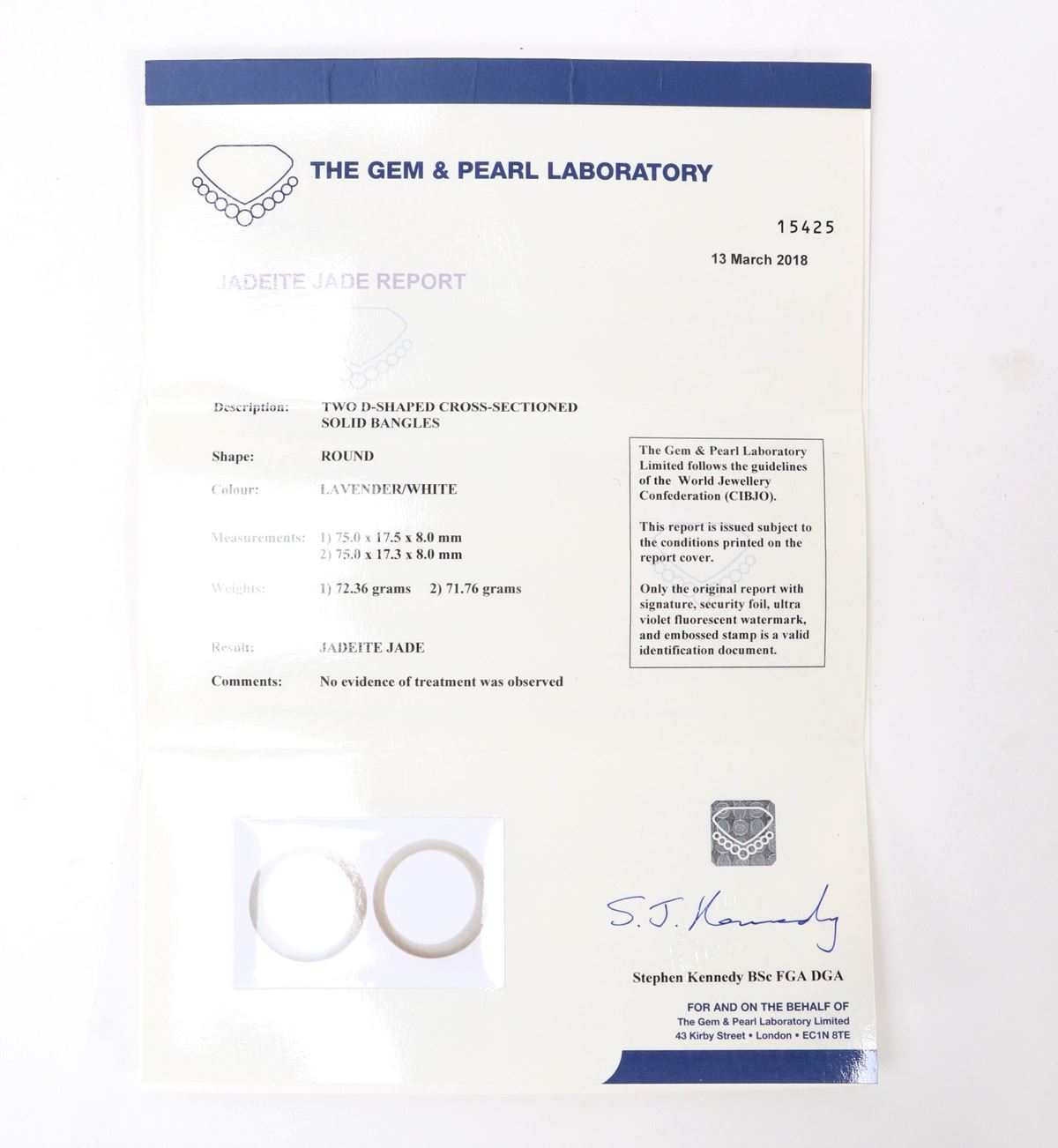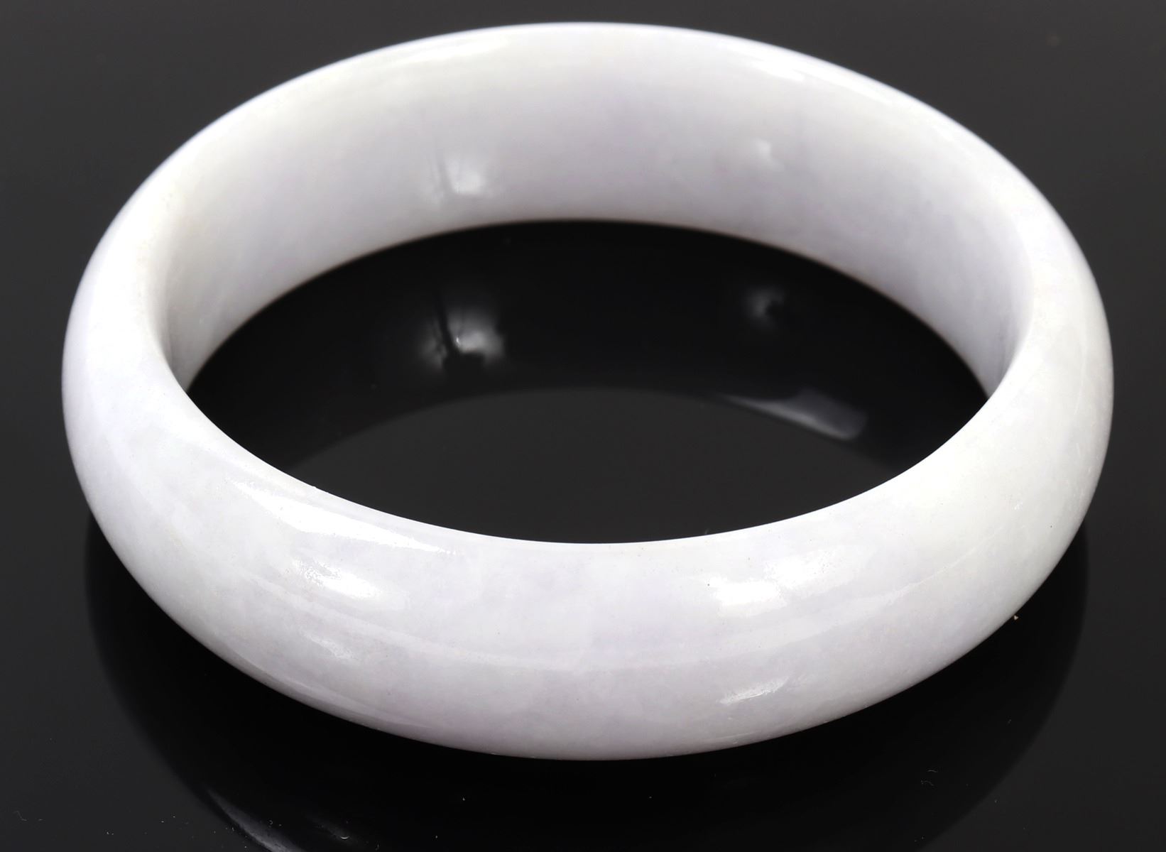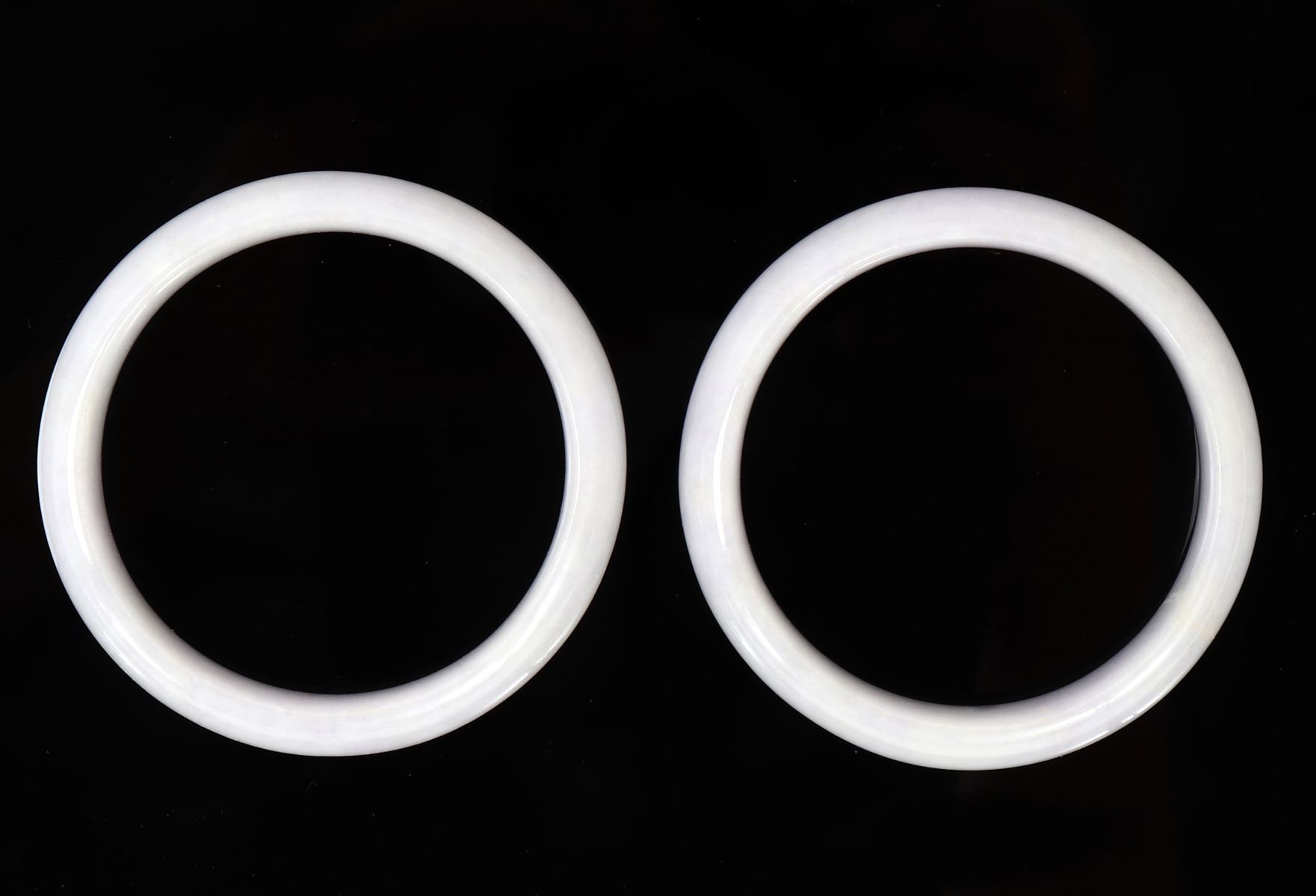 Lovely pair of Chinese lavender purple bangle bracelets with lovely snow white clouds throughout. Certified as jadeite jade for the pair and will be included. Size 2 7/8" OD, 2 1/4" ID, weight 72 g. Condition: Wonderful wearable condition throughout.