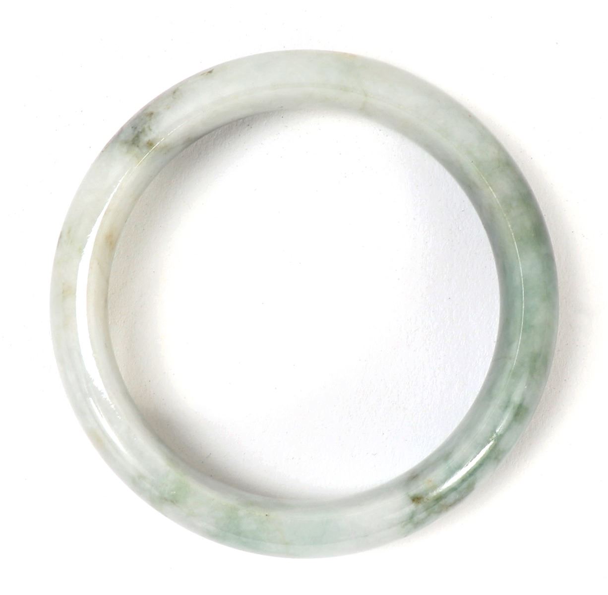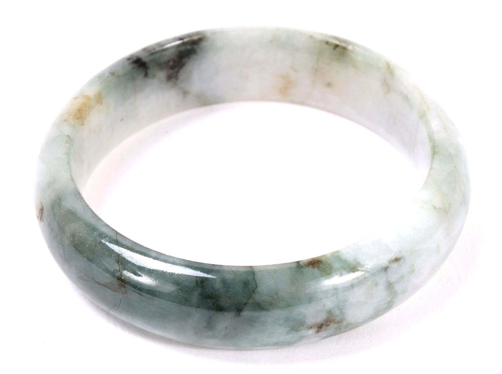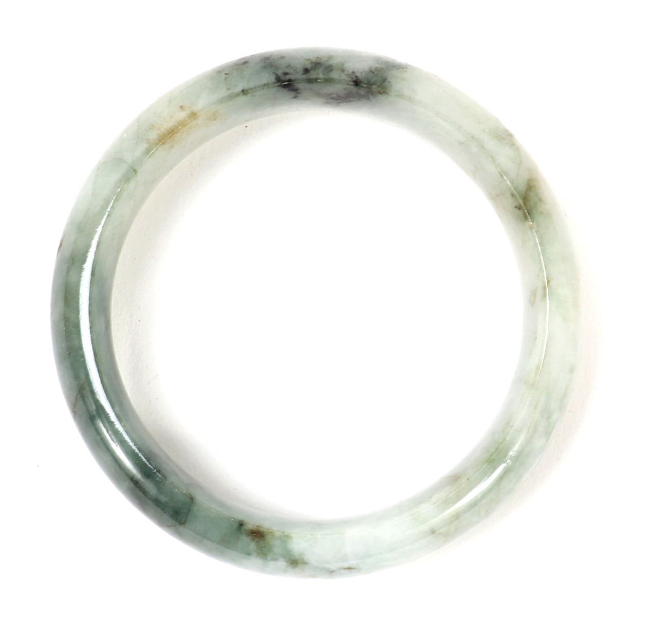 Beautiful Chinese green and grey clouded jade style bangle bracelet. Varying dark to to light green coloring throughout. Size 2 1/2" OD, 2" ID, weight 51 g. Condition: Wonderful wearable condition throughout.