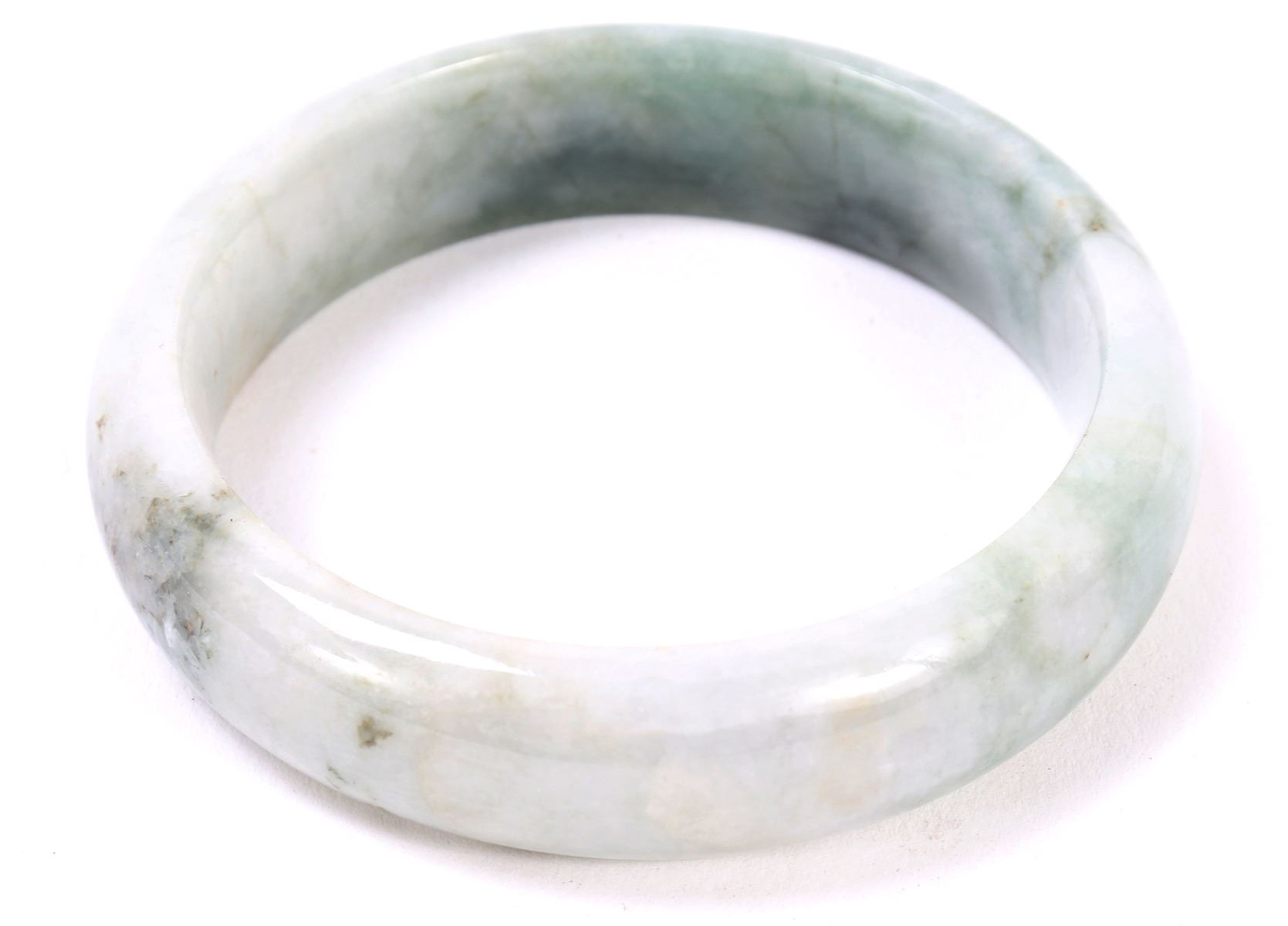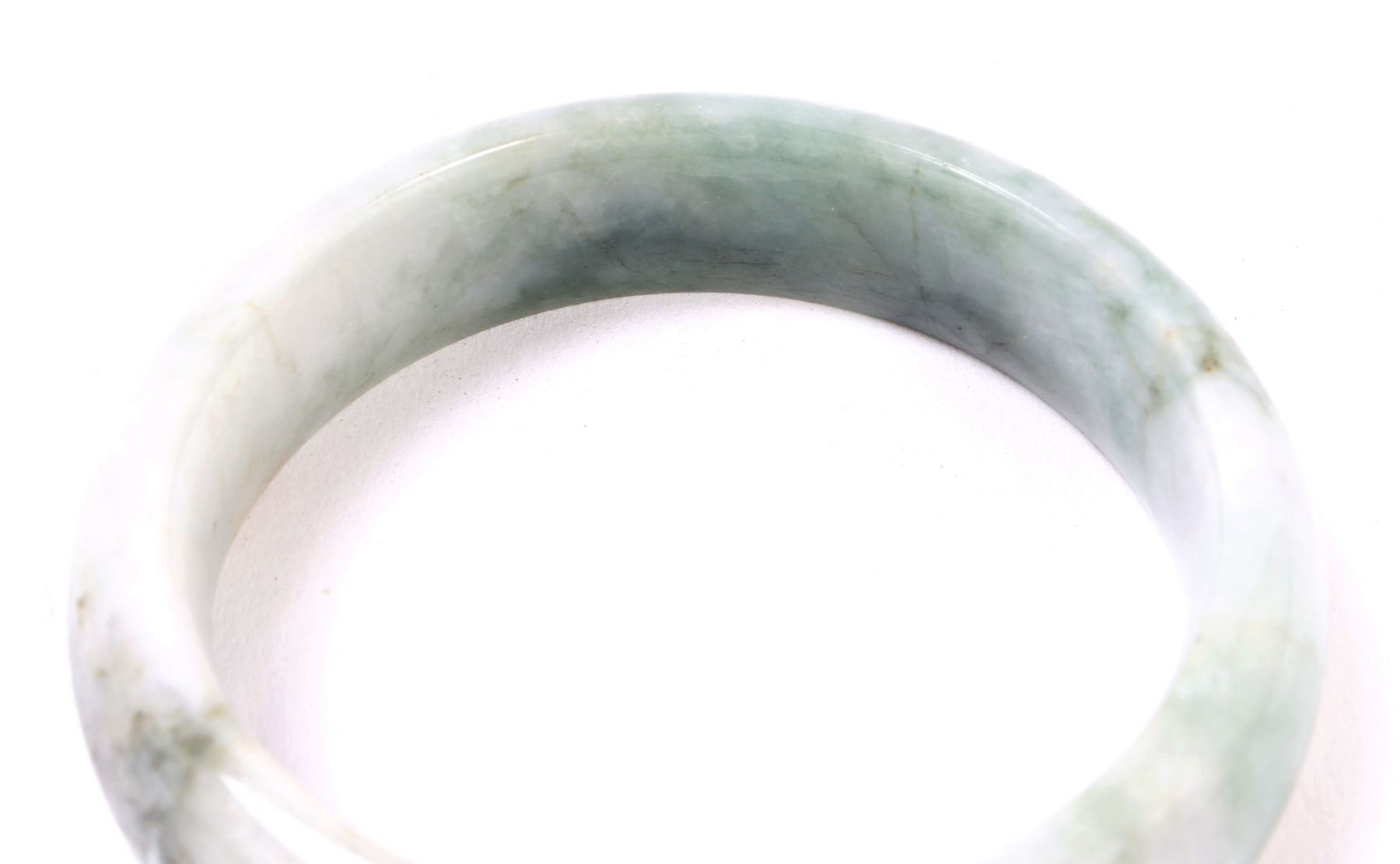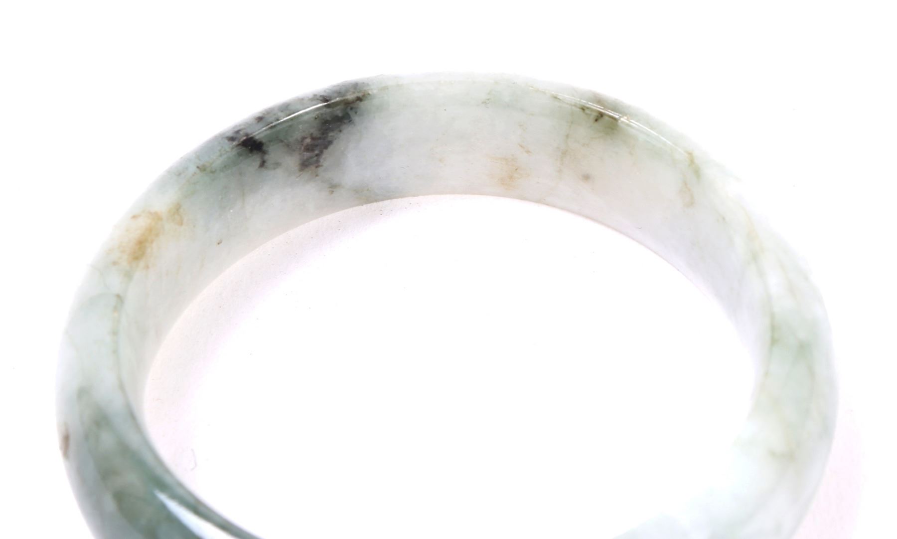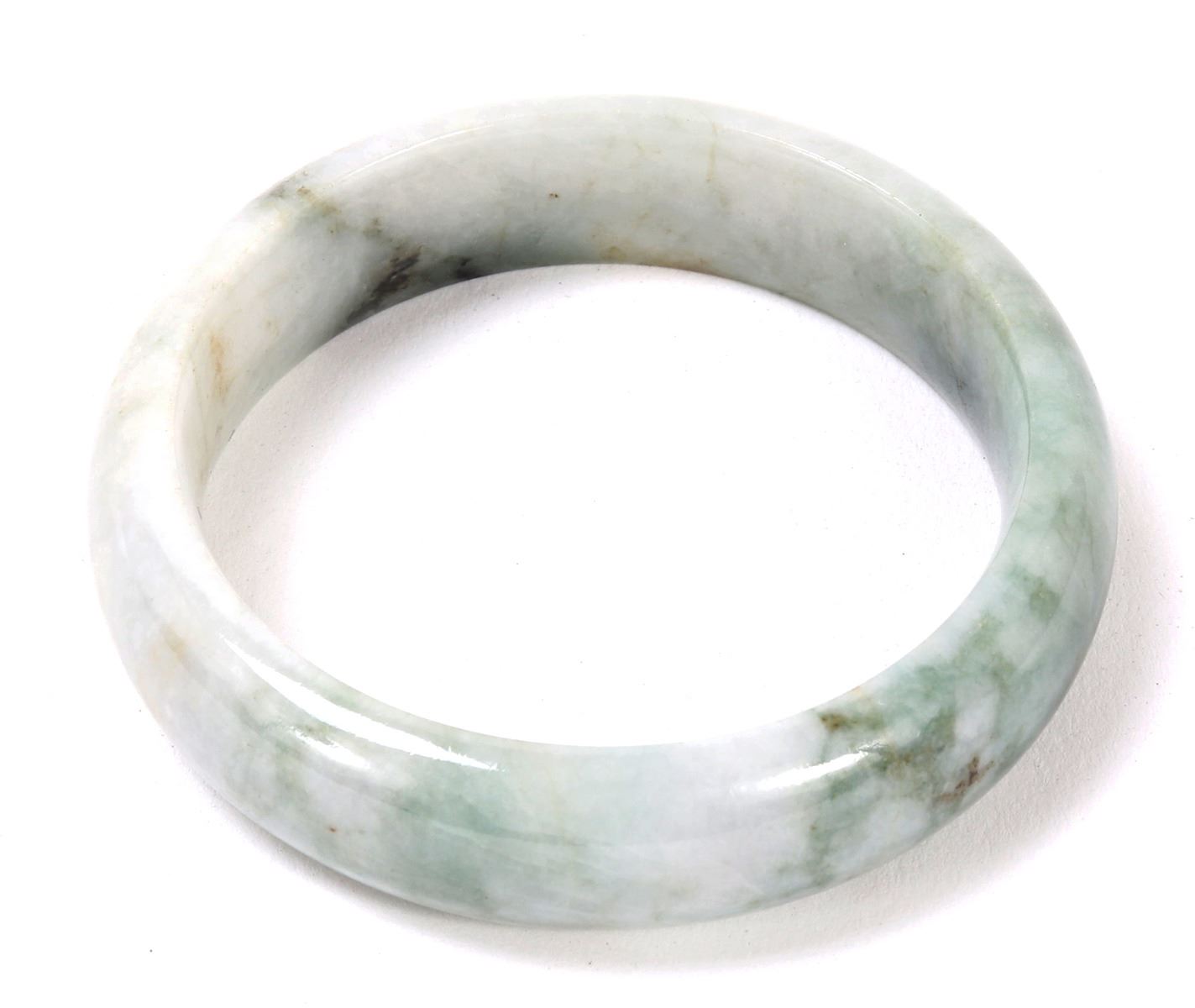 Beautiful Chinese green and grey clouded jade style bangle bracelet. Varying dark to to light green coloring throughout. Size 2 1/2" OD, 2" ID, weight 51 g. Condition: Wonderful wearable condition throughout.
