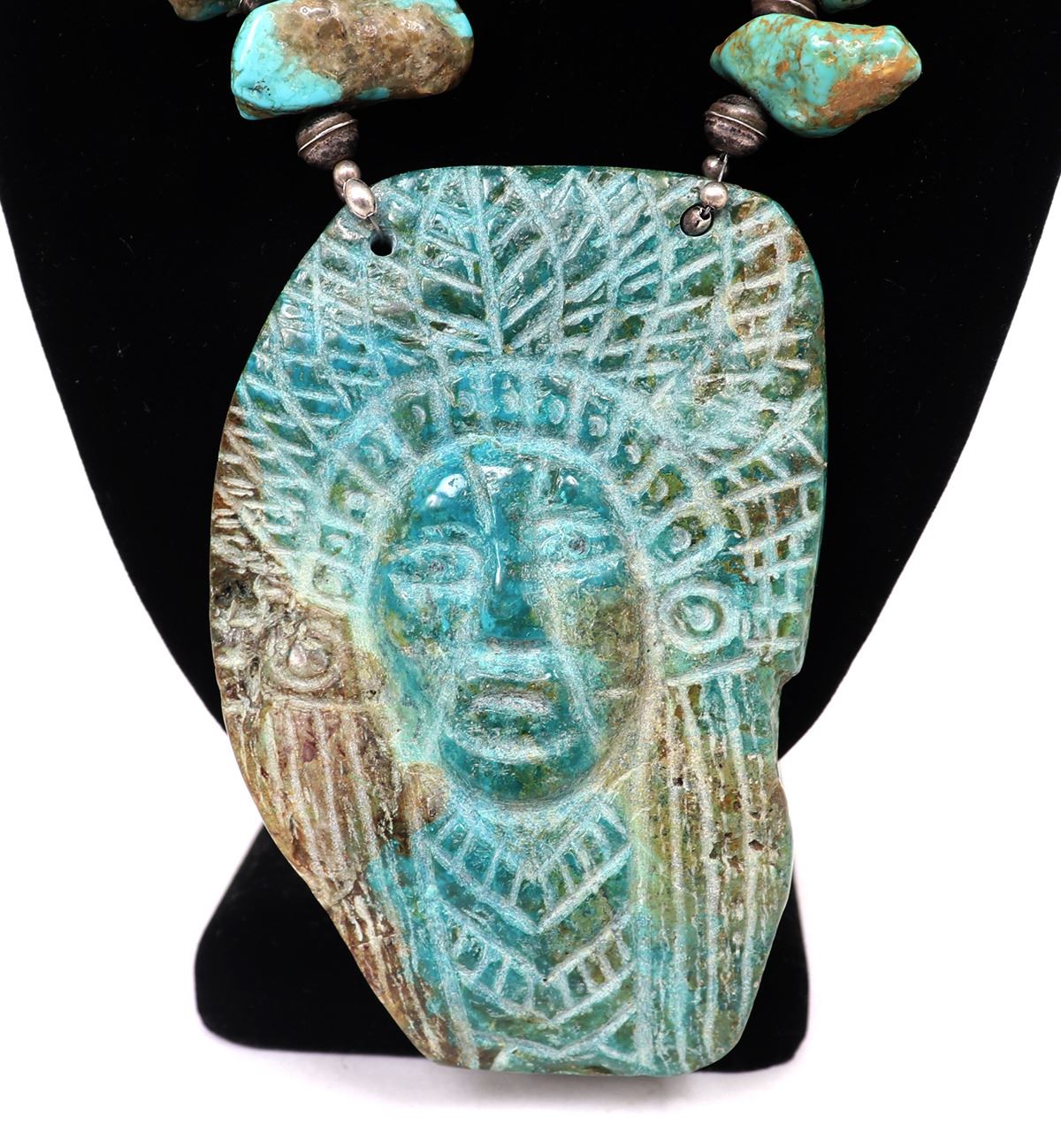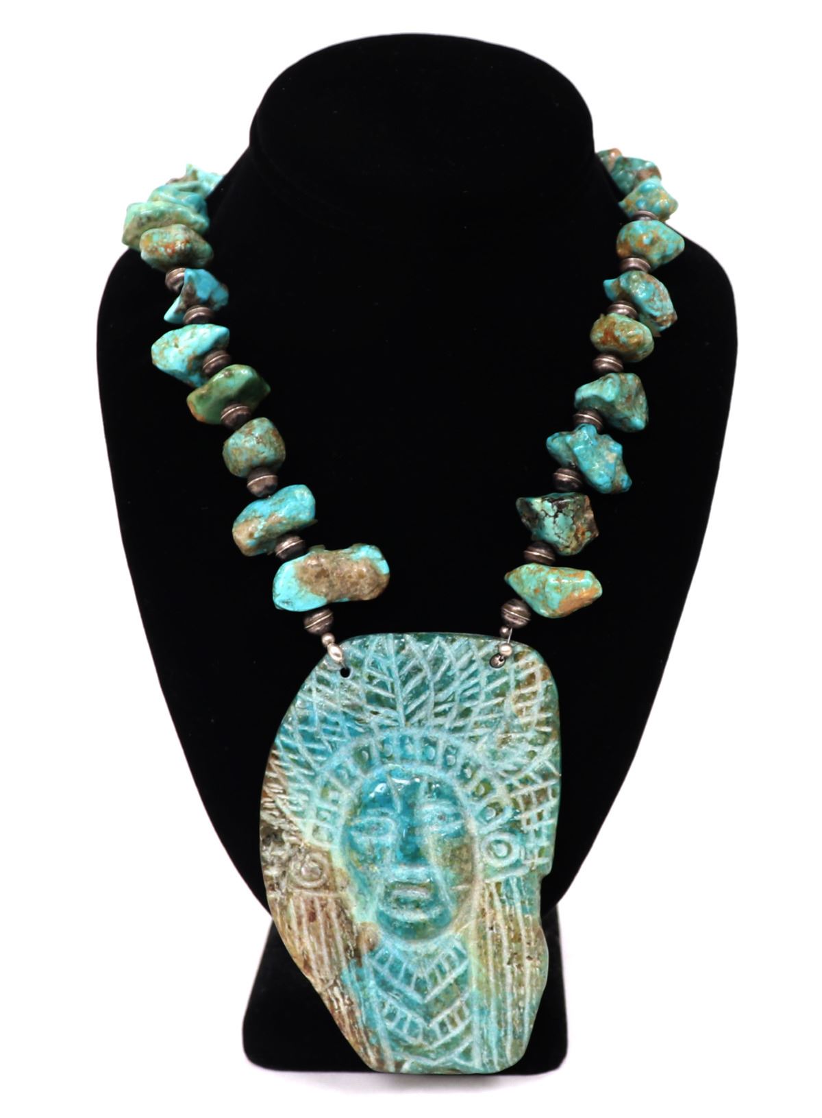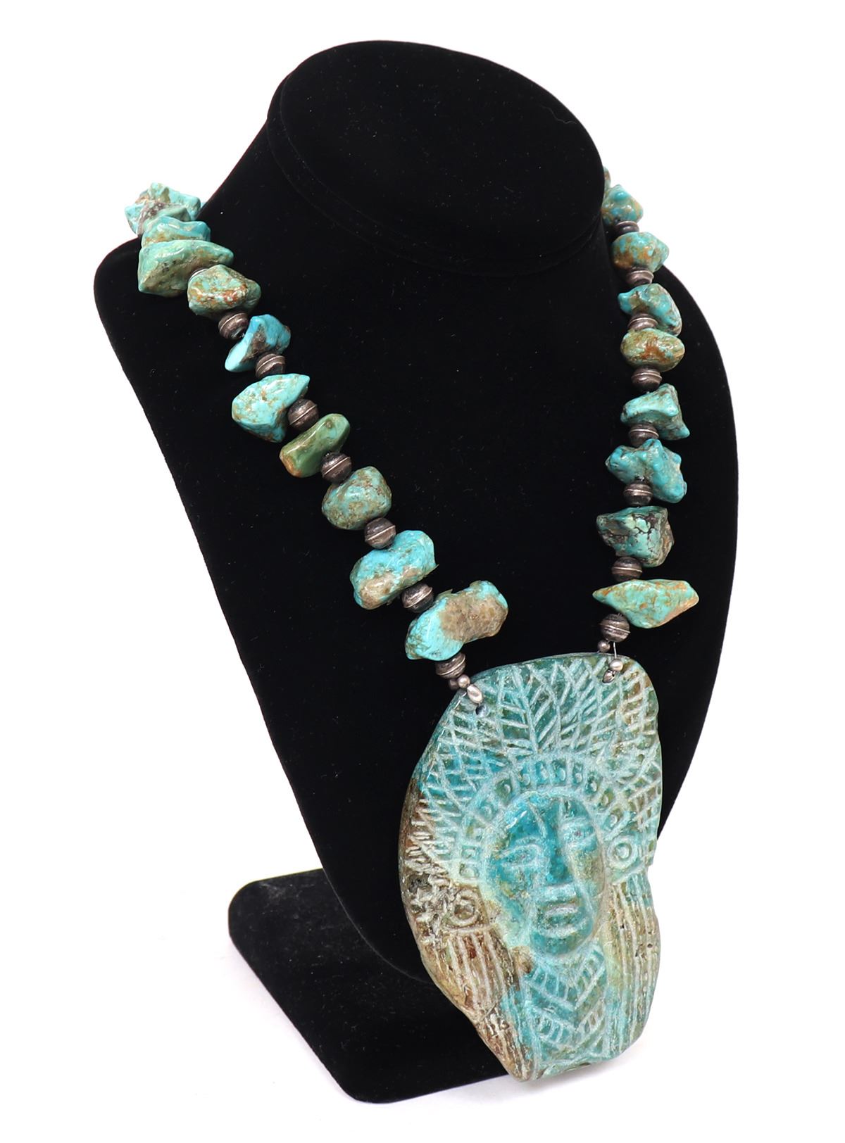 Absolutely stunning Native American made necklace with a large slab or section of turquoise with an Indian chief carved to the face, and an arrowhead to the reverse. In between sterling silver spacers are large chunky sections of beautifully polished turquoise beads. Size 22"L necklace, 4" H size of pendant. Condition: Wonderful wearable condition throughout.
