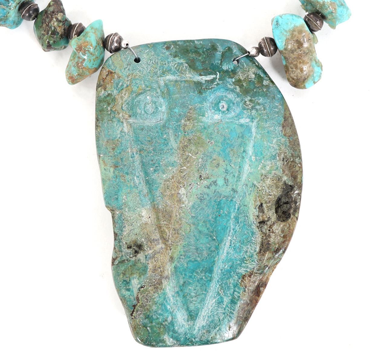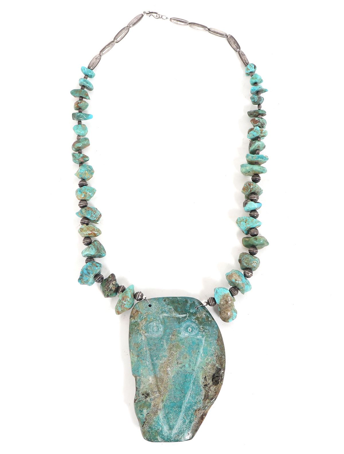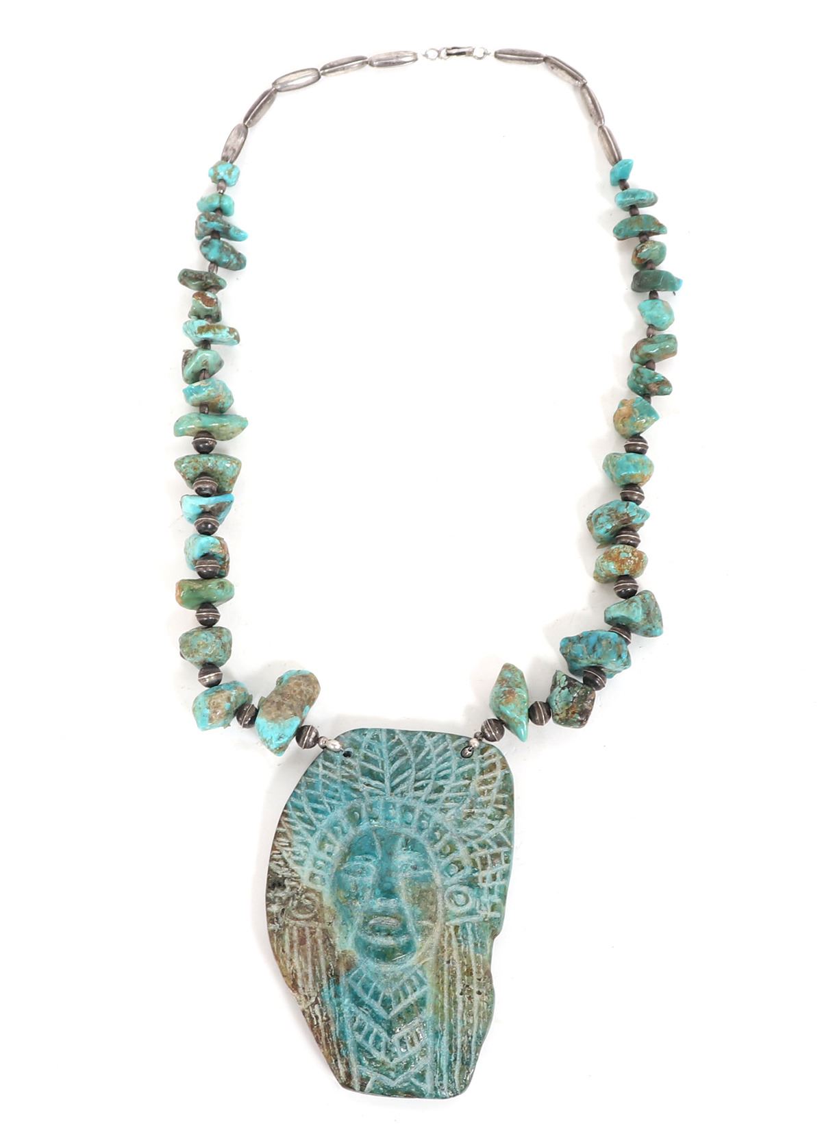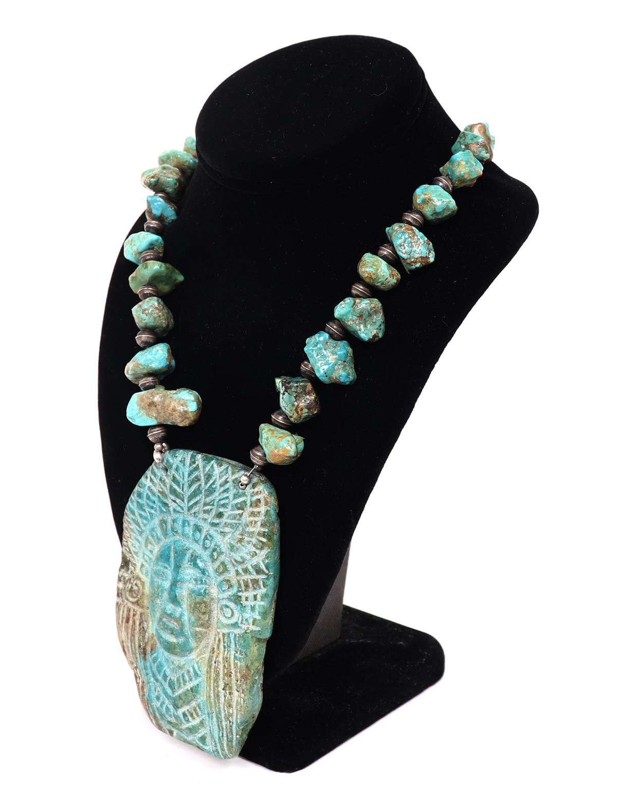 Absolutely stunning Native American made necklace with a large slab or section of turquoise with an Indian chief carved to the face, and an arrowhead to the reverse. In between sterling silver spacers are large chunky sections of beautifully polished turquoise beads. Size 22"L necklace, 4" H size of pendant. Condition: Wonderful wearable condition throughout.