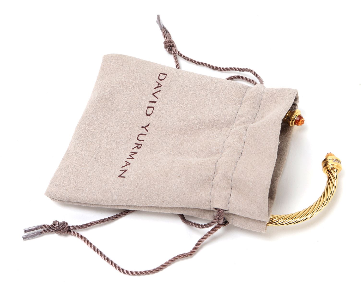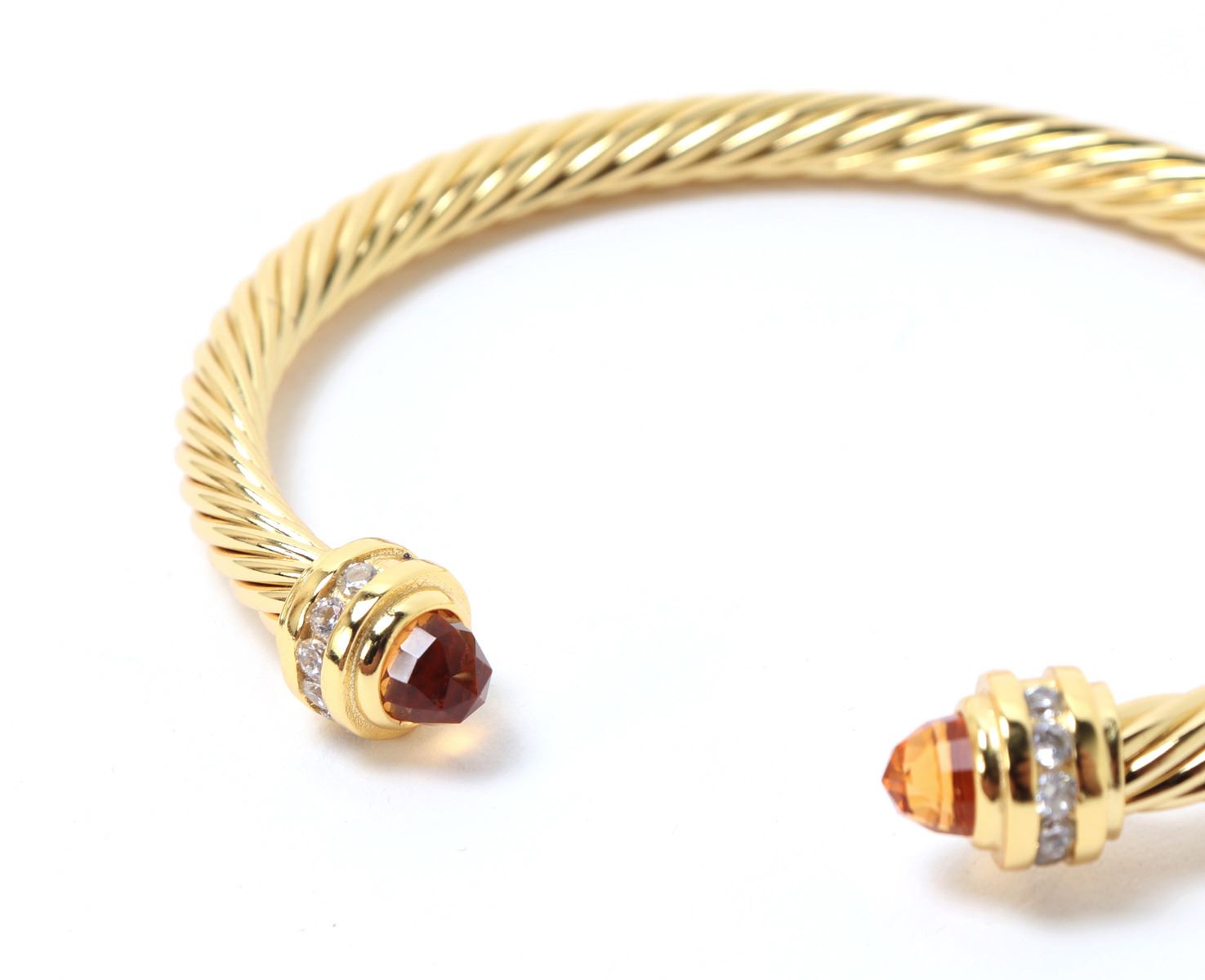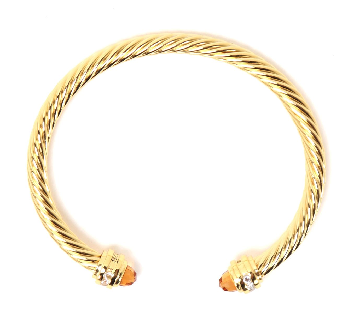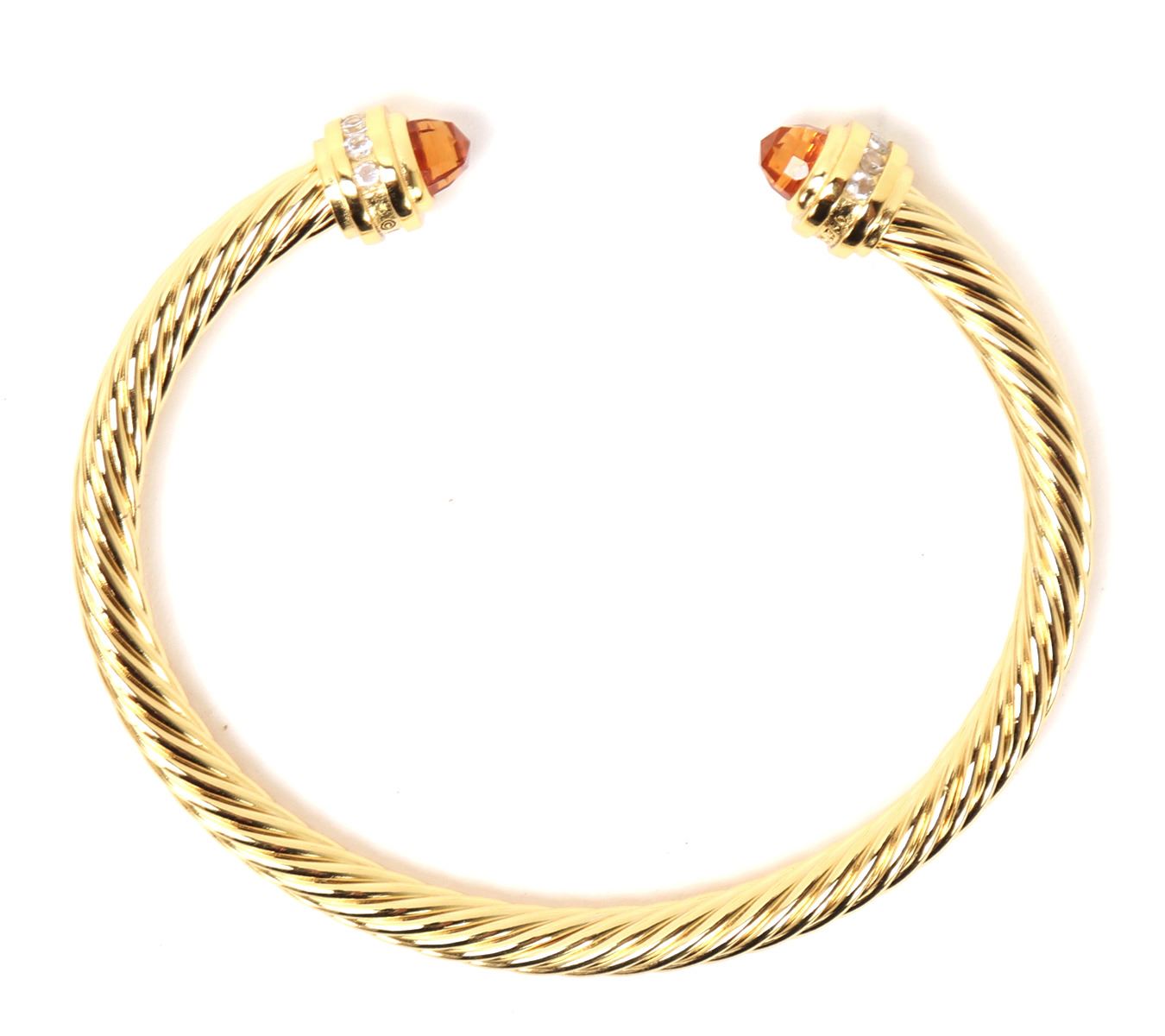 Lovely David Yurman style bracelet, featuring elegant twisted cable design with a polished gold finish. Each end capped with vibrant orange stones, accented by a row of sparkling, clear gemstones. Size 2 1/4" W. Condition: Wonderful wearable condition throughout. Made in the style of David Yurman, not an actual David Yurman piece.