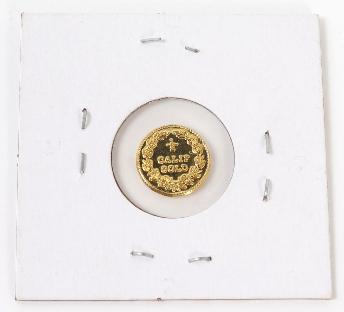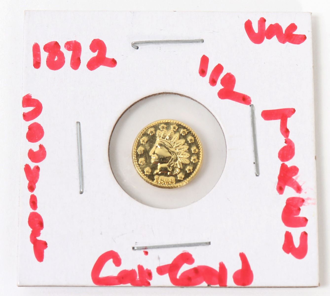 1878 marked Indian half penny gold California coin with an Indian head to the face and marked 1/2 Calif Gold to the obverse. Size 1/2" D. Condition: As-is not examined outside of the case.