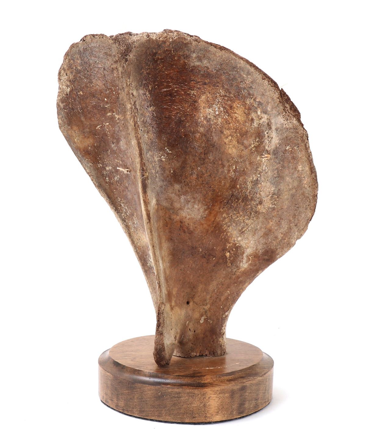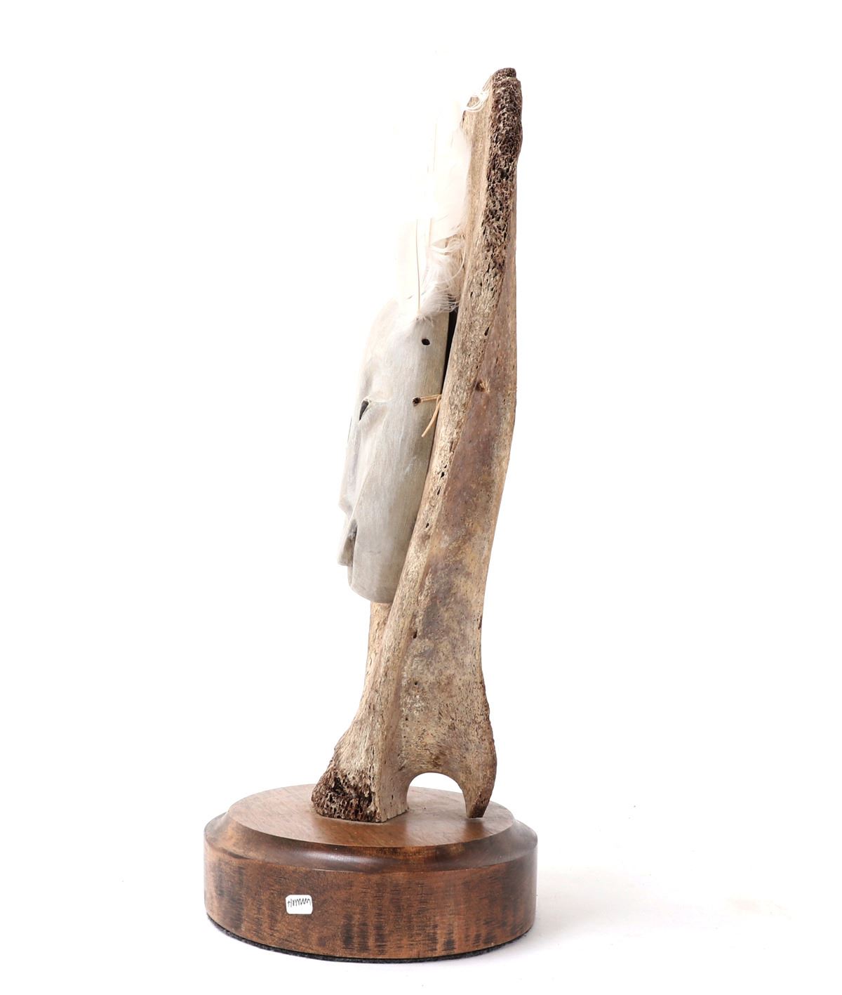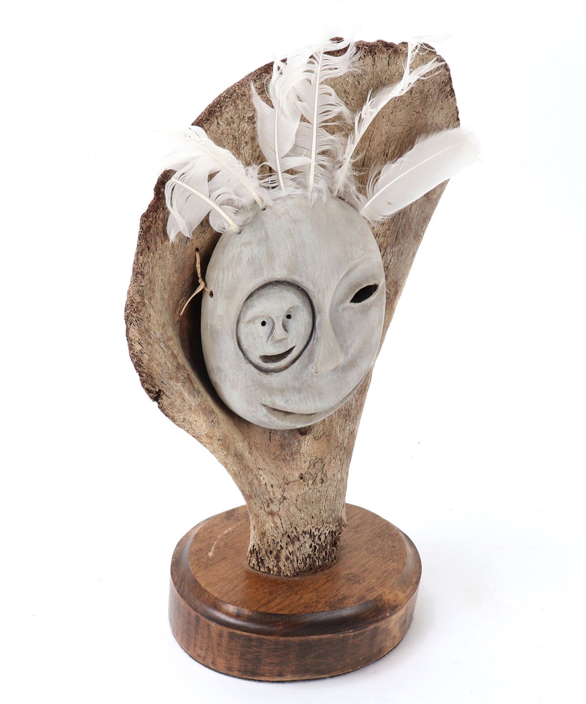 Native American, Pacific Northwest Coast, Alaska. Representing the benevolent man in the moon, beautiful Inuit bone carved mask mounted on a section of whale pelvic bone on a beautiful wood stand. Feathers affixed to the top, the faces smile boldly. Larger moon has almond slit eyes with a wide slit smile, and the man in the moon has pierced eyes with a wide brimmed smile. Size 6" W x 16" H. Condition: Good overall condition with no obvious signs of restoration or repairs.