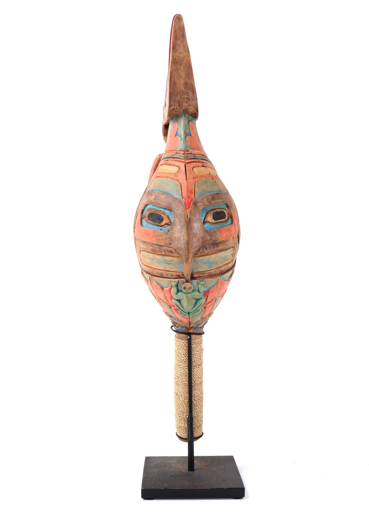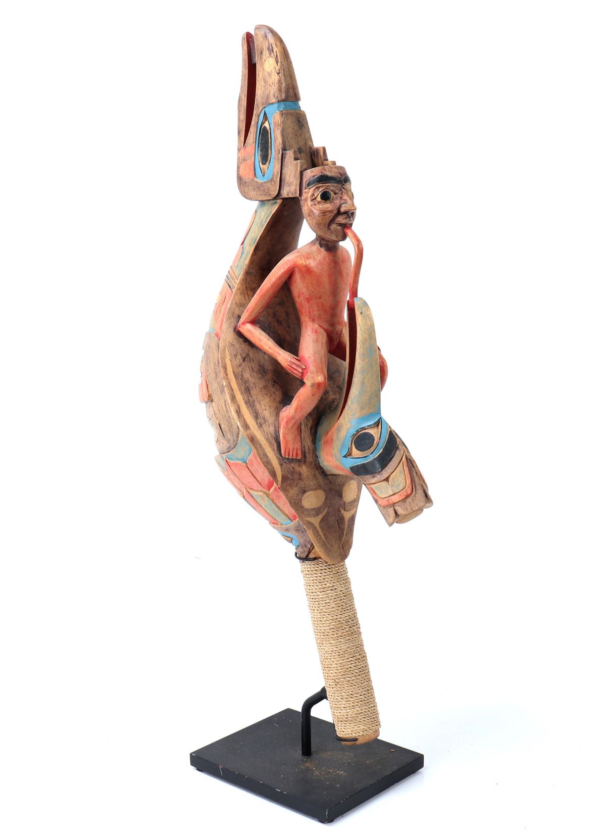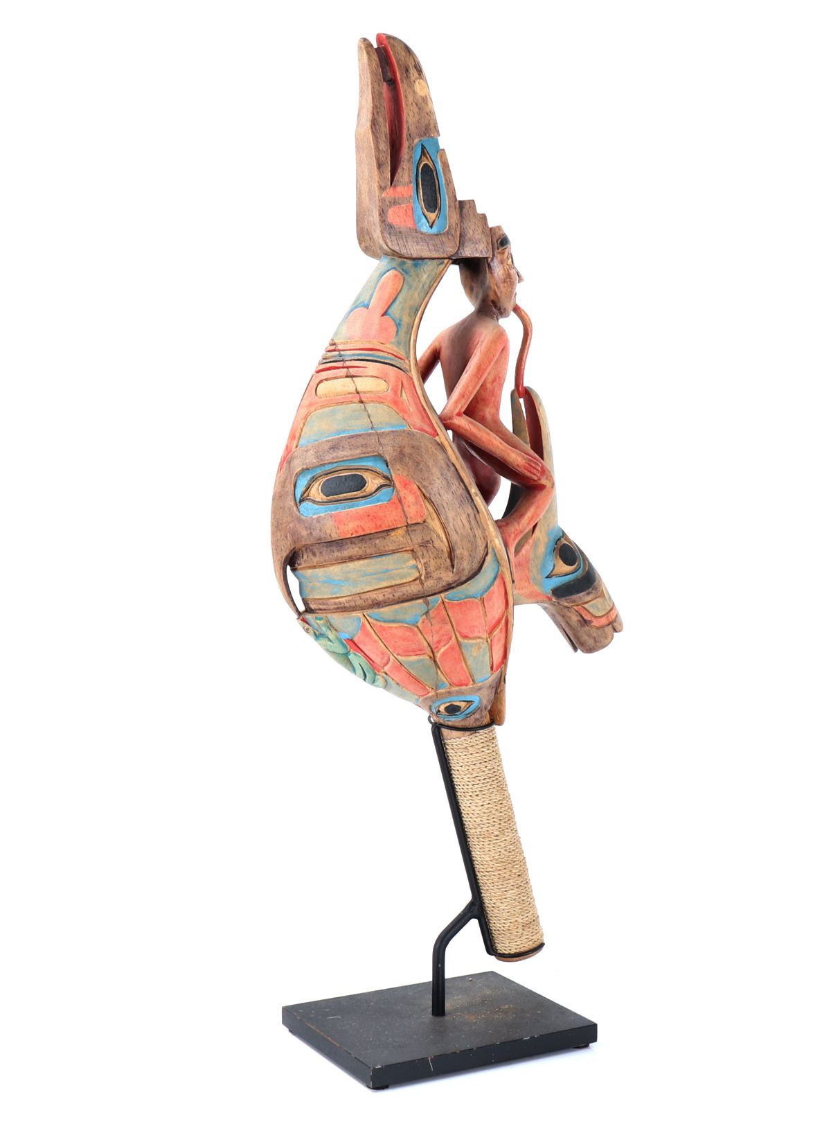 Handsome wood carved ceremonial rattle from Pacific Northwest, Haida. Relaxed man on a bird with an oystercatcher seemingly being fed by the oystercatcher. Well wrapped handle in a tight twisted fiber, a birds mouth eats at the handle. Painted all over in orange, red, blue, green and yellow pigment throughout. Size 16" L x 4" W x 4" H, weight 280g, custom stand included.. Condition: Overall good condition with minor pigment losses.